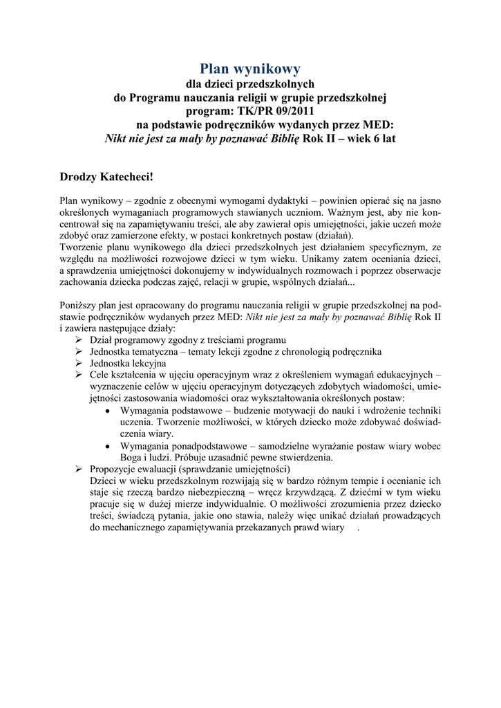 Plan wynikowy dla dzieci przedszkolnych do Programu nauczania religii w grupie przedszkolnej program: TK/PR 09/2011 na podstawie podręczników wydanych przez MED: Nikt nie jest za mały by poznawać Biblię Rok II – wiek 6 lat Drodzy Katecheci! Plan wynikowy – zgodnie z obecnymi wymogami dydaktyki – powinien opierać się na jasno określonych wymaganiach programowych stawianych uczniom. Ważnym jest, aby nie koncentrował się na zapamiętywaniu treści, ale aby zawierał opis umiejętności, jakie uczeń może zdobyć oraz zamierzone efekty, w postaci konkretnych postaw (działań). Tworzenie planu wynikowego dla dzieci przedszkolnych jest działaniem specyficznym, ze względu na możliwości rozwojowe dzieci w tym wieku. Unikamy zatem oceniania dzieci, a sprawdzenia umiejętności dokonujemy w indywidualnych rozmowach i poprzez obserwacje zachowania dziecka podczas zajęć, relacji w grupie, wspólnych działań... Poniższy plan jest opracowany do programu nauczania religii w grupie przedszkolnej na podstawie podręczników wydanych przez MED: Nikt nie jest za mały by poznawać Biblię Rok II i zawiera następujące działy: Dział programowy zgodny z treściami programu Jednostka tematyczna – tematy lekcji zgodne z chronologią podręcznika Jednostka lekcyjna Cele kształcenia w ujęciu operacyjnym wraz z określeniem wymagań edukacyjnych – wyznaczenie celów w ujęciu operacyjnym dotyczących zdobytych wiadomości, umiejętności zastosowania wiadomości oraz wykształtowania określonych postaw: Wymagania podstawowe – budzenie motywacji do nauki i wdrożenie techniki uczenia. Tworzenie możliwości, w których dziecko może zdobywać doświadczenia wiary. Wymagania ponadpodstawowe – samodzielne wyrażanie postaw wiary wobec Boga i ludzi. Próbuje uzasadnić pewne stwierdzenia. Propozycje ewaluacji (sprawdzanie umiejętności) Dzieci w wieku przedszkolnym rozwijają się w bardzo różnym tempie i ocenianie ich staje się rzeczą bardzo niebezpieczną – wręcz krzywdzącą. Z dziećmi w tym wieku pracuje się w dużej mierze indywidualnie. O możliwości zrozumienia przez dziecko treści, świadczą pytania, jakie ono stawia, należy więc unikać działań prowadzących do mechanicznego zapamiętywania przekazanych prawd wiary . PLAN WYNIKOWY NAUCZANIA BIBLIJNEGO DZIECI PRZEDSZKOLNYCH – ROK DRUGI DZIAŁ JEDNOSTKA PROGRAMOWY TEMATYCZNA JEDN. LEKC. 1. Moje pierwsze książeczki 1 1. Ezdrasz czyta ludziom Słowo Boże 2. Jozjasz odczytuje 1 księgę prawa 2. Mój dom, moja rodzina 1. Narodziny Mojżesza 1 2. Mojżesz i Aaron przed Faraonem 1 3. Rut i Noemi 1 CELE KSZTAŁCENIA W UJĘCIU OPERACYJNYM WRAZ Z OKREŚLENIEM WYMAGAŃ EDUKACYJNYCH WYMAGANIA PODSTAWOWE WYMAGANIA – DZIECKO: PONADPODSTAWOWE– DZIECKO: Słucha historii biblijnej o Ezdraszu Aktywnie uczestniczy w zabawie: „Ezdrasz czyta Biblię” Odpowiada na pytania dotyczące historii Jozjasza Wyjaśnia dlaczego Biblia nie jest zwykłą książką Wymienia osoby opiekujące się Mojżeszem Wymienia, w jaki sposób rodzice (opiekunowie) troszczą się o niego Aktywnie uczestniczy w zabawach i pracach plastycznych Odpowiada na pytania powtórkowe Cytuje z pamięci werset Aktywnie uczestniczy w odtwarzaniu historii Mojżesza Podaje przykłady, jak może okazać miłość swojemu rodzeństwu Odpowiada na pytania powtórkowe Dostrzega prawdę, że Biblia jest prawdziwym Bożym Słowem i zawiera prawdziwe historie Wyjaśnia dlaczego należy słuchać słów Biblii Podejmuje decyzję, że będzie słuchać słów Biblii Dostrzega troskę rodziców (opiekunów) w ich postępowaniu Wyjaśnia, jak wyrazić wdzięczność Bogu za rodzinę Dziękuje Bogu za rodziców (opiekunów) i bliskich Dostrzega, że to Bóg dał mu rodzeństwo Dziękuje Bogu za rodzeństwo Postanawia być dobry dla swojego rodzeństwa Ocenia postawę Rut Wyraża wdzięczność Bogu za dziadków PROPOZYCJE EWALUACJI (sprawdzanie umiejętności) Podczas pierwszych lekcji stwarzamy warunki, w których dzieci dobrze czują się w grupie, uczestniczą w zabawach i ćwiczeniach Katecheta przeprowadza konkursy biblijne, sprawdzając zdobytą wiedzę Dziecko potrafi wyrazić wdzięczność za swoją rodzinę Dziecko czuje się zachęcone do pomagania i troszczenia się o bliskich i czyni to – katecheta w rozmowie nawiązuje do lekcji i zachęca do dzielenia się przykładami 3. Moje otoczenie– przedszkole, podwórko, Kościół 4. Boże przykazania 1 5. Józef przebacza swoim braciom 1 1. Samuel oddany pod opiekę Heliego 1 2. Dawid i Jonatan zostają przyjaciółmi 3. Dawid pomaga Mefiboszetowi 1 1 Podaje przykłady, jak może okazać troskę swoim dziadkom Opowiada historię nadania przykazań Potrafi wymienić wybrane przykazania Dokonuje oceny zachowań poprzez udział w zabawie dydaktyczno-ruchowej „Wybierz” Odpowiada na pytania dotyczące historii Józefa Wyjaśnia, dlaczego powinniśmy przebaczać Dziękuje Panu Jezusowi za przebaczenie grzechów Streszcza historię Samuela Wymienia ludzi, którzy troszczą się o niego Opowiada o przyjaźni Dawida z Jonatanem Dziękuje Bogu za przyjaciela Streszcza historię Dawida i Mefiboszeta Cytuje z pamięci werset Zobowiązuje się szanować i troszczyć się o dziadków Wyjaśnia znaczenie nadania przez Boga przykazań Wyjaśnia zależność między przestrzeganiem przykazań a miłością do Boga Modli się o pomoc w przestrzeganiu tych przykazań Ocenia postawy Józefa i braci Prosi Pana Jezusa o pomoc w przebaczeniu innym Decyduje się prowadzić „Tygodniowy kalendarzyk” Potrafi wymienić różne sposoby wyrażenia wdzięczności Bogu za opiekunów Wyraża wdzięczność za wszystkich opiekunów Podejmuje decyzję, że będzie posłuszny opiekunom i wdzięczny za nich Porównuje swoje zachowanie do postawy Dawida czy Jonatana Wyjaśnia, co to znaczy być dobrym przyjacielem Modli się o to, aby mógł być dobrym przyjacielem dla innych Ocenia postawy osób występujących w historii Wy