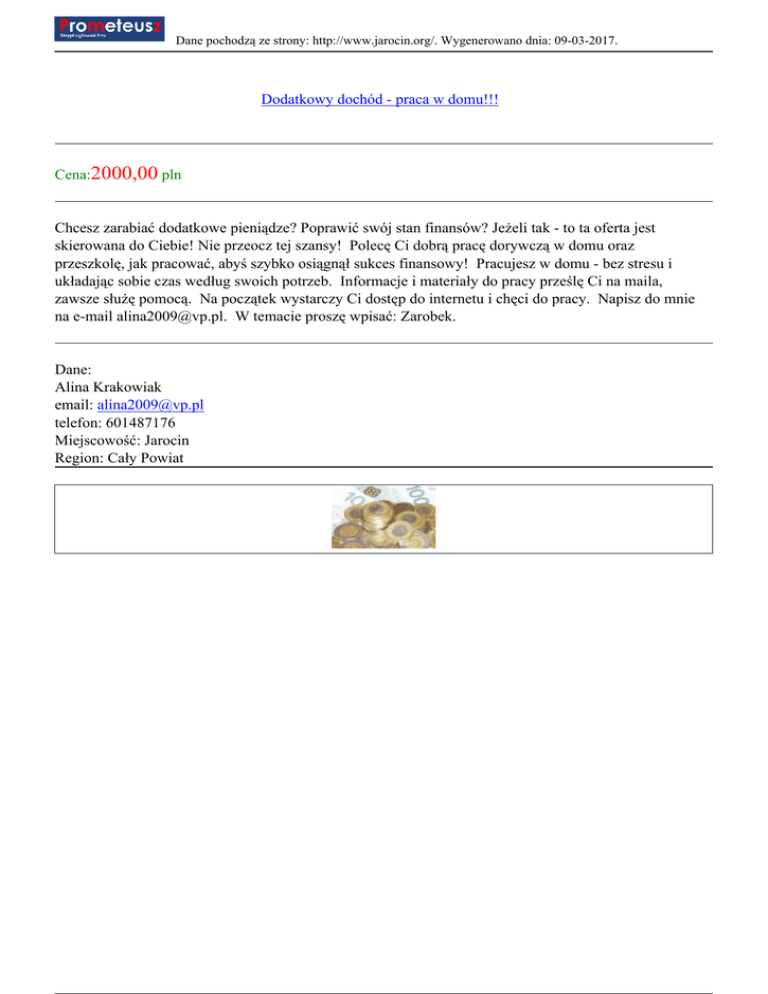 Dane pochodzą ze strony: http://www.jarocin.org/. Wygenerowano dnia: 09-03-2017. Dodatkowy dochód - praca w domu!!! Cena:2000,00 pln Chcesz zarabiać dodatkowe pieniądze? Poprawić swój stan finansów? Jeżeli tak - to ta oferta jest skierowana do Ciebie! Nie przeocz tej szansy! Polecę Ci dobrą pracę dorywczą w domu oraz przeszkolę, jak pracować, abyś szybko osiągnął sukces finansowy! Pracujesz w domu - bez stresu i układając sobie czas według swoich potrzeb. Informacje i materiały do pracy prześlę Ci na maila, zawsze służę pomocą. Na początek wystarczy Ci dostęp do internetu i chęci do pracy. Napisz do mnie na e-mail [email protected]. W temacie proszę wpisać: Zarobek. Dane: Alina Krakowiak email: [email protected] telefon: 601487176 Miejscowość: Jarocin Region: Cały Powiat