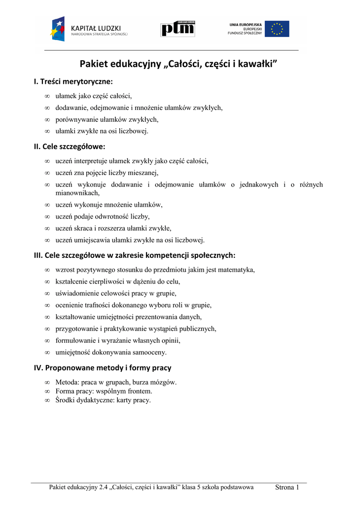 Pakiet edukacyjny „Całości, części i kawałki” I. Treści merytoryczne: • ułamek jako część całości, • dodawanie, odejmowanie i mnożenie ułamków zwykłych, • porównywanie ułamków zwykłych, • ułamki zwykłe na osi liczbowej. II. Cele szczegółowe: • uczeń interpretuje ułamek zwykły jako część całości, • uczeń zna pojęcie liczby mieszanej, • uczeń wykonuje dodawanie i odejmowanie ułamków o jednakowych i o różnych mianownikach, • uczeń wykonuje mnożenie ułamków, • uczeń podaje odwrotność liczby, • uczeń skraca i rozszerza ułamki zwykłe, • uczeń umiejscawia ułamki zwykłe na osi liczbowej. III. Cele szczegółowe w zakresie kompetencji społecznych: • wzrost pozytywnego stosunku do przedmiotu jakim jest matematyka, • kształcenie cierpliwości w dążeniu do celu, • uświadomienie celowości pracy w grupie, • ocenienie trafności dokonanego wyboru roli w grupie, • kształtowanie umiejętności prezentowania danych, • przygotowanie i praktykowanie wystąpień publicznych, • formułowanie i wyrażanie własnych opinii, • umiejętność dokonywania samooceny. IV. Proponowane metody i formy pracy • • • Metoda: praca w grupach, burza mózgów. Forma pracy: wspólnym frontem. Środki dydaktyczne: karty pracy. Pakiet edukacyjny 2.4 „Całości, części i kawałki” klasa 5 szkoła podstawowa Strona 1 V. Przebieg zajęć Spotkanie 1: „Ćwiczenia otwierające” (1 godzina lekcyjna) 1. Sprawy organizacyjne (sprawdzenie obecności). 2. Podział uczniów na zespoły zadaniowe (grupy 4 - 5 osobowe). 3. Wybór liderów, sekretarzy, asystentów poszczególnych grup. 4. Rozdanie każdej z grup zestawów ćwiczeń otwierających oraz materiałów potrzebnych do rozwiązywania zadań. 5. Przedstawienie i porównanie rozwiązań zadań przez przedstawicieli grup. 6. Rozwiązywanie ćwiczeń przez uczniów pod kierunkiem nauczyciela. 7. Przedstawienie i porównanie rozwiązań zadań przez przedstawicieli grup. 8. Zebranie kart z rozwiązaniami. 9. Podsumowanie i zakończenie zajęć. UWAGA: Materiały dla uczniów, to pierwsze cztery strony dokumentu Ćwiczenia Otwierające. Nauczyciel może sam dokonać doboru zadań z zaproponowanych w tym scenariuszu. Bibliografia do ćwiczeń otwierających [1] [2] [3] [4] Kujawa Z., Potrafię obliczyć, Sopot 2009 (zadanie 1) Mańko M., Wesoła matematyka 4, Kraków 2009 (zadanie 2) Mańko M., Wesoła matematyka 6, Kraków 2009 (zadanie 4) Zarzycka K., Zarzycki P., Matematyka 5, Zbiór Zadań, Gdańsk 2009 (zadanie 3) Spotkanie 2: „Rozwiążmy razem” (2 godziny lekcyjne) 1. Uczniowie siadają we wcześniej ustalonych zespołach zadaniowych. 2. Nauczyciel rozdaje jeden egzemplarz zestawu zadań „Rozwiążmy razem”. 3. Uczniowie dokonują podziału, która grupa będzie rozwiązywała dane zadanie. Zestaw zadań uczniowie powinni pociąć i rozdzielić zadania do odpowiednich grup. 4. Każda grupa rozwiązuje zadania samodzielnie. Po rozwiązaniu zadania uczniowie redagują odpowiedź na karcie odpowiedzi. 5. Jeżeli dana grupa zakończy pracę, to jej członkowie powinni przyłączyć się i pomóc w rozwiązywaniu innym grupom. 6. Nauczyciel zbiera karty odpowiedzi. 7. Zakończenie zajęć. Pakiet edukacyjny 2.4 „Całości, części i kawałki” klasa 5 szkoła podstawowa Strona 2 Bibliografia do zestawu zadań rozwiążmy razem [1] [2] [3] [4] [5] [6] [7] Lewicka H., Rosłon E, Matematyka wokół nas, Warszawa 1999 (zadanie 6) Mańko M., Wesoła matematyka 5, Kraków 2009 (zadanie 2, 3), Zarzycka K., Zarzycki P, Matematyka 5, Zbiór zadań, Gdańsk 2009 (zadanie 8) Praca zbiorowa, Matematyka 2001, Podręcznik dla klasy 5, Warszawa 1997 (zadanie 1) Praca zbiorowa, Matematyka w szkole nr 25, Gdańsk 2004 (zadanie 4) Praca zbiorowa, Matematyka w szkole nr 3, Gdańsk 2000 (zadanie 5) Praca zbiorowa, Matematyka dla dużych i małych, Toruń 2006 (zadanie 7) Spotkanie 3: „Ćwiczenia podsumowujące” (1 godzina lekcyjna) 1. Nauczyciel rozdaje poprawione i wypunktowane karty pracy zespołom zadaniowym. 2. Liderzy poszczególnych grup prezentują rozwiązania zadania. 3. Nauczyciel ocenia pracę grup (pozytywne wzmocnienie). 4. Podsumowanie zajęć. Pakiet edukacyjny 2.4 „Całości, części i kawałki” klasa 5 szkoła podstawowa Strona 3