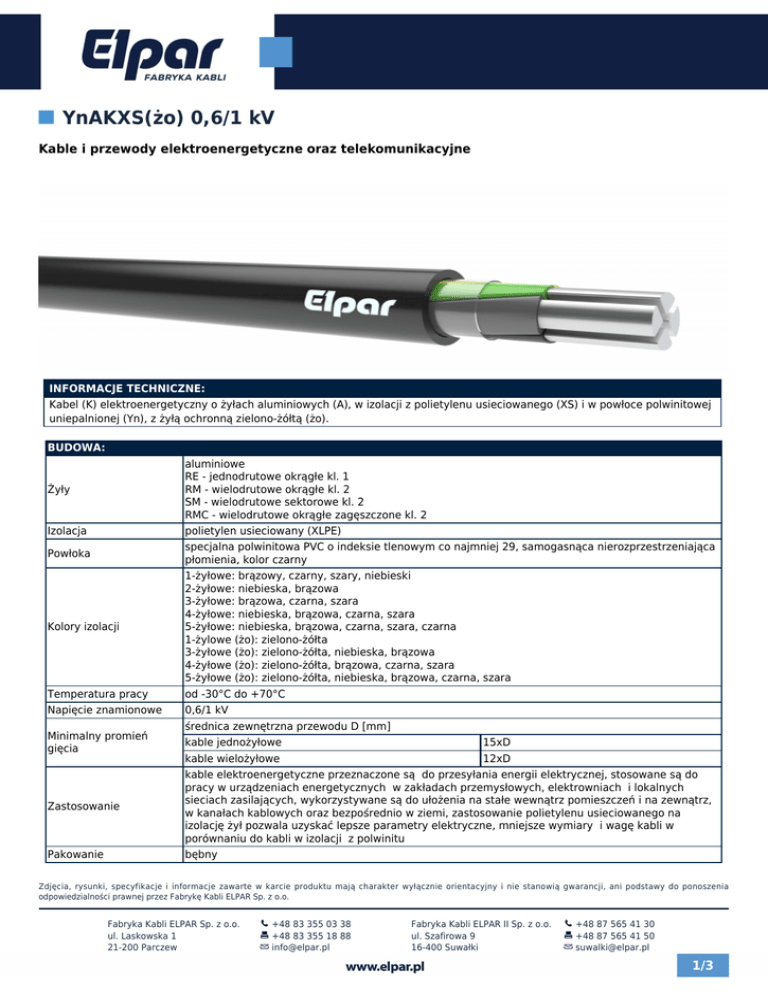 YnAKXS(żo) 0,6/1 kV Kable i przewody elektroenergetyczne oraz telekomunikacyjne INFORMACJE TECHNICZNE: Kabel (K) elektroenergetyczny o żyłach aluminiowych (A), w izolacji z polietylenu usieciowanego (XS) i w powłoce polwinitowej uniepalnionej (Yn), z żyłą ochronną zielono-żółtą (żo). BUDOWA: Żyły aluminiowe RE - jednodrutowe okrągłe kl. 1 RM - wielodrutowe okrągłe kl. 2 SM - wielodrutowe sektorowe kl. 2 RMC - wielodrutowe okrągłe zagęszczone kl. 2 Izolacja polietylen usieciowany (XLPE) Powłoka specjalna polwinitowa PVC o indeksie tlenowym co najmniej 29, samogasnąca nierozprzestrzeniająca płomienia, kolor czarny Kolory izolacji 1-żyłowe: brązowy, czarny, szary, niebieski 2-żyłowe: niebieska, brązowa 3-żyłowe: brązowa, czarna, szara 4-żyłowe: niebieska, brązowa, czarna, szara 5-żyłowe: niebieska, brązowa, czarna, szara, czarna 1-żylowe (żo): zielono-żółta 3-żyłowe (żo): zielono-żółta, niebieska, brązowa 4-żyłowe (żo): zielono-żółta, brązowa, czarna, szara 5-żyłowe (żo): zielono-żółta, niebieska, brązowa, czarna, szara Temperatura pracy od -30°C do +70°C Napięcie znamionowe 0,6/1 kV Minimalny promień gięcia średnica zewnętrzna przewodu D [mm] kable jednożyłowe 15xD kable wielożyłowe 12xD Zastosowanie kable elektroenergetyczne przeznaczone są do przesyłania energii elektrycznej, stosowane są do pracy w urządzeniach energetycznych w zakładach przemysłowych, elektrowniach i lokalnych sieciach zasilających, wykorzystywane są do ułożenia na stałe wewnątrz pomieszczeń i na zewnątrz, w kanałach kablowych oraz bezpośrednio w ziemi, zastosowanie polietylenu usieciowanego na izolację żył pozwala uzyskać lepsze parametry elektryczne, mniejsze wymiary i wagę kabli w porównaniu do kabli w izolacji z polwinitu Pakowanie bębny Zdjęcia, rysunki, specyfikacje i informacje zawarte w karcie produktu mają charakter wyłącznie orientacyjny i nie stanowią gwarancji, ani podstawy do ponoszenia odpowiedzialności prawnej przez Fabrykę Kabli ELPAR Sp. z o.o. Fabryka Kabli ELPAR Sp. z o.o. ul. Laskowska 1 21-200 Parczew +48 83 355 03 38 +48 83 355 18 88 [email protected] Fabryka Kabli ELPAR II Sp. z o.o. ul. Szafirowa 9 16-400 Suwałki +48 87 565 41 30 +48 87 565 41 50 [email protected] 1/3 YnAKXS(żo) 0,6/1 kV Liczba i przekrój znamionowy żył [n x mm2] Przybliżona średnica zewnętrzna kabla [mm] Orientacyjna masa kabla [kg/km] 1 x 10 RE 7,6 73 1 x 16 RE 8,6 96 1 x 25 RMC 10,2 138 1 x 35 RMC 11,3 176 1 x 50 RMC 12,7 229 1 x 70 RMC 14,5 303 1 x 95 RMC 16,5 396 1 x 120 RMC 17,3 459 1 x 150 RMC 19,5 578 1 x 185 RMC 21,6 706 1 x 240 RMC 24,4 903 1 x 300 RMC 27,1 1117 1 x 400 RMC 32,1 1465 1 x 500 RMC 34,7 1780 1 x 500 RMC 40,3 2250 3 x 10 RE 15,4 260 3 x 16 RE 17,2 434 3 x 25 RE 20,7 661 3 x 35 RE 23,2 810 3 x 50 RMC 26,2 1088 3 x 70 RMC 30,4 1442 3 x 95 RMC 34,3 1841 3 x 120 RMC 36,3 2227 4 x 10 RE 16,8 312 4 x 16 RE 18,7 522 4 x 25 SE 20,4 512 4 x 35 SE 22,8 655 4 x 50 SE 24,7 802 4 x 70 SE 29,1 1102 4 x 95 SE 33,7 1515 4 x 120 SE 37,7 1887 4 x 150 SE 39,5 2180 4 x 185 SE 43,9 2730 4 x 240 SE 49,2 3552 4 x 95 SM 34 1530 4 x 120 SM 38,1 1906 4 x 150 SM 42,2 2329 4 x 185 SM 46,9 2895 4 x 240 SM 57,8 3820 5 x 10 RE 17,9 309 5 x 16 RE 20,3 653 5 x 25 RE 24,4 1008 5 x 35 RE 27,7 1239 5 x 50 SE 30,5 1040 5 x 70 SE 32,5 1380 Zdjęcia, rysunki, specyfikacje i informacje zawarte w karcie produktu mają charakter wyłącznie orientacyjny i nie stanowią gwarancji, ani podstawy do ponoszenia odpowiedzialności prawnej przez Fabrykę Kabli ELPAR Sp. z o.o. Fabryka Kabli ELPAR Sp. z o.o. ul. Laskowska 1 21-200 Parczew +48 83 355 03 38 +48 83 355 18 88 [email protected] Fabryka Kabli ELPAR II Sp. z o.o. ul. Szafirowa 9 16-400 Suwałki +48 87 565 41 30 +48 87 565 41 50 [email protected] 2/3 5 x 95 SE 35,5 1800 5 x 120 SE 40,5 2190 Zdjęcia, rysunki, specyfikacje i informacje zawarte w karcie produktu mają charakter wyłącznie orientacyjny i nie stanowią gwarancji, ani podstawy do ponoszenia odpowiedzialności prawnej przez Fabrykę Kabli ELPAR Sp. z o.o. Fabryka Kabli ELPAR Sp. z o.o. ul. Laskowska 1 21-200 Parczew +48 83 355 03 38 +48 83 355 18 88 [email protected] Fabryka Kabli ELPAR II Sp. z o.o. ul. Szafirowa 9 16-400 Suwałki +48 87 565 41 30 +48 87 565 41 50 [email protected] 3/3