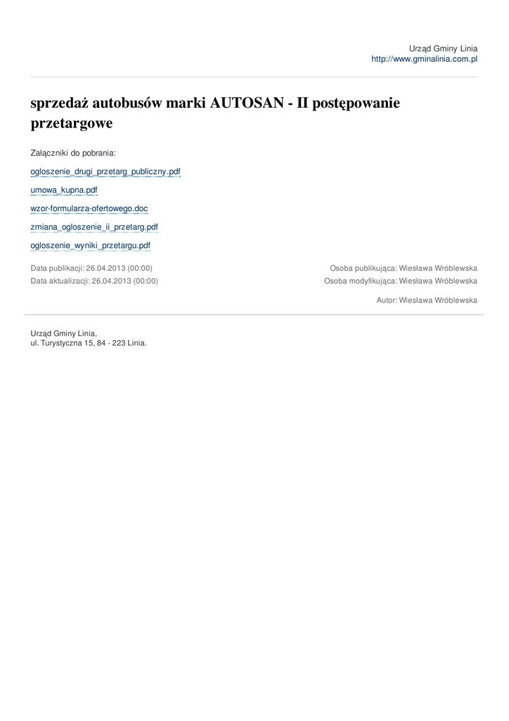 Urząd Gminy Linia http://www.gminalinia.com.pl sprzedaż autobusów marki AUTOSAN - II postępowanie przetargowe Załączniki do pobrania: ogloszenie_drugi_przetarg_publiczny.pdf umowa_kupna.pdf wzor-formularza-ofertowego.doc zmiana_ogloszenie_ii_przetarg.pdf ogloszenie_wyniki_przetargu.pdf Data publikacji: 26.04.2013 (00:00) Data aktualizacji: 26.04.2013 (00:00) Osoba publikująca: Wiesława Wróblewska Osoba modyfikująca: Wiesława Wróblewska Autor: Wiesława Wróblewska Urząd Gminy Linia, ul. Turystyczna 15, 84 - 223 Linia.