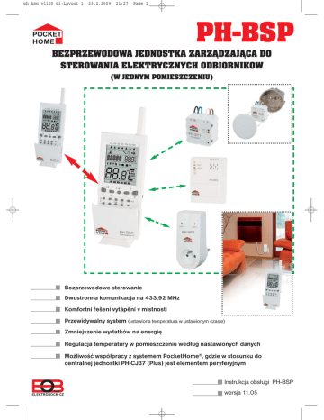 ph_bsp_v1105_pl:Layout 1 23.2.2009 21:27 Page 1 PH-BSP BEZPRZEWODOWA JEDNOSTKA ZARZĄDZAJĄCA DO STEROWANIA ELEKTRYCZNYCH ODBIORNIKOW (W JEDNYM POMIESZCZENIU) Bezprzewodowe sterowanie Dwustronna komunikacja na 433,92 MHz Komfortní řešení vytápění v místnosti Przewidywalny system (ustawiona temperatura w ustawionym czasie) Zmniejszenie wydatków na energię Regulacja temperatury w pomieszczeniu według nastawionych danych Możliwość współpracy z systemem PocketHome®, gdzie w stosunku do centralnej jednostki PH-CJ37 (Plus) jest elementem peryferyjnym Instrukcja obsługi PH-BSP wersja 11.05 ph_bsp_v1105_pl:Layout 1 23.2.2009 21:28 Page 2 FUNKCE SYSTÉMU Ten bezprzewodowy system został przystosowany do sterowania ogrzewaniem w jednym pomieszczeniu gdzie występuje wiele niezależnych źródeł ogrzewania elektrycznego. Jednostka zarządzająca pełni funkcję termostatu bezprzewodowego. W oparciu o temperaturę w pomieszczeniu zarządza źródłami ogrzewania według ustawionego programu. Umożliwia sterowanie 255 odbiornikami peryferyjnymi. Przesyła informacje odbiornikom peryferyjnym, które w oparciu o tą informację włączają źródła ogrzewania. PH-BSP włącza odbiorniki peryferyjne co cca 1 sekundę aby nie doszło do przeciążenia sieci! ELEMENTY SYSTEMU PH-BSP bezprzewodowa jednostka zarządzająca - est głównym elementem systemu i zapewnia dwustronną komunikację z odb. peryferyjnymi nadzoruje nastawioną temperaturę pomieszczenia i zarządza włączaniem ogrzewania pełni funkcje termostatu rejestruje aktualne stany aktywowanych odbiorników systemu ma możliwość zarządzania przez telefon GSM poprzez podłączenie modułu GST1 (str.9,12,13) może współpracować z systemem PocketHome® sterującym ogrzewaniem całego budynku gdzie występuje jako odbiornik peryferyjny (podstacja) w stosunku do centralnej jednostki PH-CJ37. PH-SP1 bezprzewodowy wyłącznik - do puszki instalacyjnej - w oparciu o informacje o aktualnej i ustawionej temperaturze od jednostki zarządzającej włącza urządzenie grzewcze - przesyła informacje potwierdzające o wykonaniu polecenia - łatwy montaż do puszki instalacyjnej - diody LED na przednim panelu informują o stanach odbiornika - przy braku napięcia automatycznie aktywuje się do systemu (pamięć E-EPROM) PH-SP2 bezprzewodowy wyłącznik – na puszkę instalacyjną - w oparciu o informacje o aktualnej i ustawionej temperaturze od jednostki zarządzającej włącza urządzenie grzewcze - przesyła informacje potwierdzające o wykonaniu polecenia - łatwy montaż na puszkę instalacyjną - diody LED na przednim panelu informują o stanach odbiornika - przy braku napięcia automatycznie aktywuje się do systemu (pamięć E-EPROM) PH-SP3 bezprzewodowy wyłącznik – wtykowy do gniazda - w oparciu o informacje o aktualnej i ustawionej temperaturze od jednostki zarządzającej włącza urządzenie grzewcze - przesyła informacje potwierdzające o wykonaniu polecenia - łatwy montaż – wtykowy do gniazda elektrycznego - diody LED na przednim panelu informują o stanach odbiornika - przy braku napięcia automatycznie aktywuje się do systemu ( pamięć E-EPROM ) ! ! ! Aby przeciwdziałać zakłóceniom w transmisji bezprzewodowej każdy system jest chroniony unikalnym kodem zapisanym w jednostce zarządzającej PH-BSP! Aby komunikacja pomiędzy PH-BSP a odbiornikami peryferyjnymi była prawidłowa należy je zakodować – AKTYWACJA każdego odbiornika peryferyjnego do systemu! Cały system pracuje na dwustronnej komunikacji radiowej 433,92 MHz. Aktywowanie poszczególnych odbiorników nalezy przeprowadzać według załączonych instrukcji! PRZESYŁ SYGNAŁU 433,92 MHz PRZEZ RÓŻNE MATERIAŁY mur szkło płyta gip.kar. żelazo beton żelazo Uwaga: powyższe informacje są pomocne przy instalacji urządzeń oraz pokazują możliwości przepływu sygnału! 2 ph_bsp_v1105_pl:Layout 1 23.2.2009 21:28 Page 3 OPIS PH-BSP antena podświetlany wyświetlacz W czasie dnia podświetlenie nie aktywne. Po zmroku (min. 2 minuty) podświetlenie aktywne na ok. 2 sekundy po naciśnięciu dowolnego przycisku. gniazdo zasilacza (5 do 12V/ DC min. 150mA) przyciski do programowania miejsce umieszczenia baterii 0V 5 do 12 V gniazdo modułu GST1 montaż podstawki 1. Uwaga: podstawka w zestawie PH-BSP modół GST1 do sterowania GSM 2. 3. Uwaga: modół GST1 nie wchodzi w skład zestawu PH-BSP UMIESZCZENIE BATERII I ICH WYMIANA - otworzyć klapkę i zdjąć ochronny papier co umożliwi przepływ prądu przy wymianie baterii należy pamiętać o prawidłowej polaryzacji (zaznaczona wewnątrz korytek) konieczność wymiany baterii sygnalizowana jest na wyświetlaczu symbolem należy stosować tylko alkaliczne baterie 2x1,5V typ AA! ! Zużyte baterie należy utylizować zgodnie z przepisami o niebezpiecznych odpadach! 3 ph_bsp_v1105_pl:Layout 1 23.2.2009 21:28 Page 4 OPIS PRZYCISKÓW PH-BSP H zmiana godzin (w funkcji PROG) nastawienie daty i czasu (w funkcji wakacje “ ”) przesuw pomiędzy odbiornikami (w funkcji ACTIV i INFO) przesuw przy nastawieniu stałych 12 - numer telefonu + -i (w funkcji CONST) enter (potwierdzenie) informacje o nastawionej temperaturze i godzinach pracy T -- + P -Off wybór programu dla el.grzejnego (w funkcji AUTO) przesuw między programami (w funkcji PROG) przesuw między stałymi (w funkcji CONST) przesuw między temperaturami a (w funkcji MANU) dodanie urządzenia (w funkcji ACTIV) + kopiowanie dni (w funkcji PROG) Kopi zerowanie godzin pracy dezaktywacja urządzenia (w funkcji ACTIV) wyłączenie wszystkich odbiorników (w funk.AUTO, MANU) wakacje (w tej funkcji nie działa info) wybór NIE/PARZYSTY tydzień (w funkcji PROG) zmiana dnia (w funkcji PROG) test sprawnego podłączenia (odbiornika, modułu GSM) test urządzeń peryferyjnych (w funkcji ACTIV, INFO) Test Den Fce zmiana temperatury zmiana nastawionych godzin i constans przesuw przy wyborze funkcji (Fce) wybór funkcji patrz str.6 AUTO, MANU, CLOCK, PROG