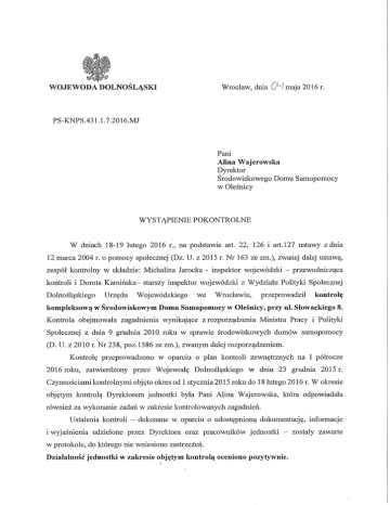 m Wrocław, dnia GM maja 2016 r. WOJEWODA DOLNOŚLĄSKI PS-KNPS.431.1.7.2016.MJ Pani Alina W ajerowska Dyrektor Środowiskowego Domu Samopomocy w Oleśnicy WYSTĄPIENIE POKONTROLNE W dniach 18-19 lutego 2016 r., na podstawie art. 22, 126 i art.127 ustawy z dnia 12 marca 2004 r. o pomocy społecznej (Dz. U. z 2015 r. Nr 163 ze zm.), zwanej dalej ustawą, zespół kontrolny w składzie: Michalina Jarocka - inspektor wojewódzki - przewodnicząca kontroli i Dorota Kamińska- starszy inspektor wojewódzki z Wydziału Polityki Społecznej Dolnośląskiego Urzędu Wojewódzkiego we Wrocławiu, przeprowadził kontrolę kompleksową w Środowiskowym Domu Samopomocy w Oleśnicy, przy ul. Słowackiego 8. Kontrola obejmowała zagadnienia wynikające z rozporządzenia Ministra Pracy i Polityki Społecznej z dnia 9 grudnia 2010 roku w sprawie środowiskowych domów samopomocy (D. U. z 2010 r. Nr 238, poz.1586 ze zm.), zwanym dalej rozporządzeniem. Kontrolę przeprowadzono w oparciu o plan kontroli zewnętrznych na I półrocze 2016 roku, zatwierdzony przez Wojewodę Dolnośląskiego w dniu 23 grudnia 2015 r. Czynnościami kontrolnymi objęto okres od 1 stycznia 2015 roku do 18 lutego 2016 r. W okresie objętym kontrolą Dyrektorem jednostki była Pani Alina Wajerowska, która odpowiadała również za wykonanie zadań w zakresie kontrolowanych zagadnień. Ustalenia kontroli - dokonane w oparciu o udostępnioną dokumentację, informacje i wyjaśnienia udzielone przez Dyrektora oraz pracowników jednostki - zostały zawarte w protokole, do którego nie wniesiono zastrzeżeń. Działalność jednostki w zakresie objętym kontrolą oceniono pozytywnie. W odniesieniu do standardu bytowego ustalono, że jednostka spełnia wymogi lokalowe określone w § 18 pkt 1 - 6 rozporządzenia. Uczestnicy korzystają z pomieszczeń przy ul. Słowackiego 8 i Kościelnej 3 w zależności od indywidualnych potrzeb. Czynności kontrolne potwierdziły, że organizacja pracy Domu jest zgodna z § 6 ust. 1 rozporządzenia. Wszyscy uczestnicy Domu objęci są postępowaniem wspierająco-aktywizującym. Jednostka świadczy usługi określone w § 14 pkt 1 - 1 0 rozporządzenia, w formie zajęć zespołowych lub indywidualnych. Uczestnicy codziennie mają możliwość spożywania ciepłego posiłku, przygotowywanego w ramach treningu kulinarnego. Ośrodek współpracuje na rzecz integracji społecznej z podmiotami, o których mowa w § 21 rozporządzenia. Ustalono, że Dom prowadzi dokumentację indywidualną i zbiorczą określoną w § 24 rozporządzenia. Dokumentacja zbiorcza zawiera w szczególności: ewidencję uczestników, listę obecności, dzienniki dokumentujące pracę pracowników zespołu wspierająco - aktywizującego oraz plany pracy. W trakcie kontroli przedstawiono do wglądu plany pracy wszystkich pracowni. W dokumentacji indywidualnej uczestników znajdują się dokumenty wymagane przepisami oraz indywidualne plany, w których okresy ich obowiązywania są spójne z terminem skierowania do Domu, a wyznaczone cele pracy adekwatne do możliwości i potrzeb uczestnika. Pracownicy prowadzą indywidualną dokumentację dotyczącą realizacji zaplanowanych działań. Wskaźnik zatrudnienia spełnia wymóg określony w § 12 rozporządzenia. Wykształcenie personelu jest zgodne z wymaganymi kwalifikacjami. Wszyscy pracownicy posiadają co najmniej półroczny staż pracy na stanowisku, na którym mieli bezpośredni kontakt z osobami z zaburzeniami psychicznymi, zgodnie z § 11 ust. 1 rozporządzenia w sprawie ŚDS. Dyrektor jednostki spełnia wymogi § 9 cytowanego rozporządzenia tzn. posiada wykształcenie wyższe oraz staż pracy z osobami z zaburzeniami psychicznymi oraz wymogi art. 122 cytowanej ustawy o pomocy społecznej tj. posiada co najmniej 3-letni staż pracy w pomocy społecznej oraz specjalizację z zakresu organizacji pomocy społecznej. W związku z ustaleniami zawartymi powyżej oraz niestwierdzeniem nieprawidłowości w bieżącym funkcjonowaniu Domu, nie formułuje się zaleceń pokontrolnych. Z up. WOJEWODY DOLNOŚLĄSKIEGO Z-CA t L Polityki Ś p o ieczn e j. .. KŁU