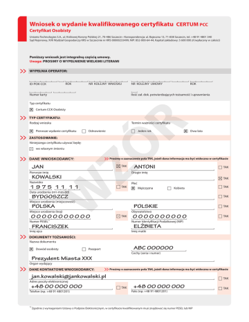 Wniosek o wydanie kwalifikowanego certyfikatu CERTUM PCC Certyfikat Osobisty Unizeto Technologies S.A., ul. Królowej Korony Polskiej 21, 70-486 Szczecin • Korespondencja: ul. Bajeczna 13, 71-838 Szczecin, tel. +48 91 4801 340 Sąd Rejonowy, XVII Wydział Gospodarczy KRS w Szczecinie nr KRS 00000233499, NIP: 852-000-64-44, Kapitał zakładowy: 5 600 000 zł (wpłacony w całości) Poniższy wniosek jest integralną częścią umowy. Uwaga: PROSIMY O WYPEŁNIENIE WIELKIMI LITERAMI >> WYPEŁNIA OPERATOR: ROK ID-POK-CCK NR KOLEJNY WNIOSKU Numer karty NR KOLEJNY UMOWY ROK Ilość zał. dok. potwierdzających tożsamość i uprawnienia Typ certyfikatu X >> TYP CERTYFIKATU: Termin ważności certyfikatu Rodzaj wniosku X >> Certum CCK Osobisty Pierwsze wydanie certyfikatu X Jeden rok Odnowienie Dwa lata ZASTOSOWANIE: Niniejszego certyfikatu używać będę: we własnym imieniu >> >> Prosimy o zaznaczenie pola TAK, jeżeli dana informacja ma być widoczna w certyfikacie DANE WNIOSKODAWCY: JAN TAK Pierwsze imię ANTONI TAK Drugie imię KOWALSKI TAK Nazwisko Płeć 1r 9r 7r 5 1 d 1 d r m 1 m 1 TAK X Mężczyzna Kobieta TAK Data urodzenia (rrrr-mm-dd) BYDGOSZCZ TAK Miejsce urodzenia (miejscowość) POLSKA POLSKIE Miejsce urodzenia (kraj) Obywatelstwo 00000000000 TAK 1) Numer PESEL 0000000000 TAK Numer Identyfikacji Podatkowej (NIP) ELŻBIETA FRANCISZEK Imię ojca >> TAK Imię matki Niniejszego certyfikatu używać będę: DOKUMENTY TOŻSAMOŚCI: Nazwa dokumentu X Dowód osobisty ABC 000000 Paszport Cechy (seria i numer) Prezydent Miasta XXX Organ wydający >> Niniejszego certyfikatu używać będę: DANE KONTAKTOWE WNIOSKODAWCY: >> Prosimy o zaznaczenie pola TAK, jeżeli dana informacja ma być widoczna w certyfikacie [email protected] TAK Adres poczty elektronicznej +48 00 000 000 Telefon (np. +48 91 4801201) 1) TAK +48 00 000 000 Faks (np. +48 91 4801201) Zgodnie z wymaganiami Ustawy o Podpisie Elektronicznym, w certyfikacie kwalifikowanym musi znajdować się numer PESEL lub NIP TAK >> MIEJSCE ZAMELDOWANIA WNIOSKODAWCY: >> Prosimy o zaznaczenie pola TAK, jeżeli dana informacja ma być widoczna w certyfikacie UL. TESTOWA TAK Adres (np. ulica/plac/wieś) 11/1 TAK Numer domu i lokalu 11-111 TAK Kod pocztowy TESTOWO TAK Miejscowość TESTOWE >> TAK NAZWA POWSZECHNIE STOSOWANA: POLSKA TAK Kraj Województwo >> Prosimy o zaznaczenie pola TAK, jeżeli dana informacja ma być widoczna w certyfikacie USŁUGI TESTOWE INDYWIDUALNE TAK Nazwa identyfikująca wnioskodawcę, która zostanie zawarta w certyfikacie (np. imię i nazwisko) LIMIT TRANSAKCJI: >> opcjonalnie TAK Ograniczenie wartości jednorazowej transakcji >> TAK Waluta ADRES DO KORESPONDENCJI: Dane adresowe X Miejsce zameldowania Wnioskodawcy Inny adres (prosimy o wypełnienie poniższych pól) Nazwa Adres (np. ulica/plac/wieś) Numer domu i lokalu Kod pocztowy Miejscowość Województwo >> UWAGI: Dodatkowe informacje i uwagi Wnioskodawcy: Kraj >> PODSTAWOWE INFORMACJE O ZAKRESIE STOSOWANIA KWALIFIKOWANEGO CERTYFIKATU, JEGO SKUTKACH PRAWNYCH, SPOSOBIE ROZPATRYWANIA SKARG I WNIOSKÓW ORAZ O SYSTEMIE DOBROWOLNEJ REJESTRACJI KWALIFIKOWANYCH PODMIOTÓW ŚWIADCZĄCYCH USŁUGI CERTYFIKACYJNE Certyfikat kwalifikowany wydany na podstawie podanych danych, będzie wykorzystywany do weryfikacji składanych podpisów elektronicznych. Bezpieczny podpis elektroniczny weryfikowany certyfikatem kwalifikowanym stanowi dowód tego, że został on złożony przez osobę określoną w tym certyfikacie, jako składającą podpis elektroniczny. Bezpieczny podpis elektroniczny weryfikowany certyfikatem kwalifikowanym złożony w okresie ważności certyfikatu jest równoważny pod względem skutków prawnych podpisowi własnoręcznemu. Wszelkie zmiany danych podpisanych bezpiecznym podpisem elektronicznym, będą rozpoznawalne. Całkowita odpowiedzialność za złożenie bezpiecznego podpisu elektronicznego spoczywa osoba wskazana w certyfikacie kwalifikowanym, niezależnie od poziomu bezpieczeństwa sprzętu i oprogramowania użytego do złożenia podpisu. Skargi i wnioski są składane w formie pisemnej do Prezesa Zarządu Unizeto Technologies S.A.. Postępowanie ze skargami jest zastrzeżone do wyłącznego działania Prezesa Zarządu. Podlegają one pisemnemu rozpatrzeniu w terminie do 10 dni. PCC CERTUM wydaje certyfikaty kwalifikowane na podstawie wpisu nr 1 do Rejestru Podmiotów Kwalifikowanych świadczących usługi certyfikacyjne, uzyskanego 31 grudnia 2002 przez Unizeto Technologies S.A. Certyfikaty kwalifikowane wydawane są na podstawie Ustawy z dnia 18 września 2001r o podpisie elektronicznym (Dz. U. Nr 130, poz. 1450) oraz aktów wykonawczych do tej ustawy, a także polityki i regulaminu PCC CERTUM. >> OŚWIADCZENIA: 1. Oświadczam, że: (a) wyrażam zgodę na stosowanie przez CERTUM danych służących do weryfikacji mojego podpisu elektronicznego (czyli klucza publicznego), które zostaną zawarte w certyfikacie, o który się ubiegam, (b) po otrzymaniu i akceptacji mojego certyfikatu: 2. Oświadczam, że przed zawarciem umowy zapoznałem(am) się z wyżej wymienionymi warunkami użycia certyfikatu, o który się ubiegam, w tym o sposobie rozpatrywania skarg i wniosków, a w szczególności o istotnych jego warunkach obejmujących: (a) zakres i ograniczenia jego stosowania, (b)skutki prawne składania podpisów. 3. Oświadczam, że wszystkie informacje podane przeze mnie w formularzu są zgodne z prawdą i wyrażam zgodę na przetwarzanie moich danych osobowych przez Unizeto Technologies S.A. i sieć Systemu Rejestracji, dla potrzeb niezbędnych do realizacji procesu certyfikacji oraz zostałem(am) poinformowany(a) o prawie dostępu do treści swoich danych oraz prawie ich poprawiania i że administratorem tych danych będzie Unizeto Technologies S.A. z siedzibą w Szczecinie, ul. Królowej Korony Polskiej 21. 4. Oświadczenie o sposobie przekazania karty: X >> Proszę o przesłanie karty mikroprocesorowej zawierającej parę kluczy oraz kwalifikowan