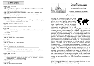 Porządek Nabożeństw od 20.10. do 27.10.2013 r. Niedziela 20.10. XXIX zwykła 7:00 Różaniec 7:30 Za + męża Ernesta ++ Hildegardę, rodziców Marię i Józefa, brata Rajmunda, teściów Albinę i Tomasza oraz ++ pokr. 9:30 Godzinki ku czci Niepokalanego Poczęcia NMP 10:00 Z podz. za odebrane łaski z prośbą o dalsze Boże bł. za wst MBNP w int. rodziny Jancik 17:15 Różaniec 18:00 Za + żonę i matkę Teresę Głąbik w 1 r. śmierci oraz ++ z rodzin Major i Głąbik Poniedziałek 21.10. bł. Jakuba Strzemię, biskupa, wsp. 17:15 Różaniec 18:00 Do Bożej Op. przez wst. MBNP z podz. za odebrane łaski z prośbą o dalsze bł. Opiekę i zdrowie dla Heleny i Rudolfa Krupka .z ok. r ślubu Wtorek 22.10. bł. Jana Pawła II, papieża, wsp. 17:15 Różaniec 18:00 Z podz. za odebrane łaski i łaskę uzdrowienia w int. Jadwigi Środa 23.10. 17:00 Za ++ rodziców Ritę i Augustyna, ++ teściów, dziadków, szwagra Piotra oraz ++ z pokr i dusze w czyśćcu cierpiące 17:30 Różaniec Czwartek 24.10. 17:15 Różaniec, Koronka 18:00 Za + Gertrudę Świerc w miesiąc po śmierci Piątek 25.10. 17:15 Różaniec 18:00 Za + Małgorzatę Muc w miesiąc po śmierci Sobota 26.10. 8:00 Za + Jadwigę Bereziuk - zam. od sąsiadów —–————–——————–—————–—————————–––—— 17:15 Różaniec 18:00 Do Bożej Op. przez wst. NSM i bł. Jana Pawła II jako podziękowanie za wszystkie otrzymane łaski z prośbą o dalszą opiekę w rodzinie i rodzinach synów Niedziela 27.10. XXX zwykła 7:00 Różaniec 7:30 Zur Gottes Barmherzigkeit durch die Fürsprache der Heiligen Mutter Gottes, als Danksagung für die erhaltenen Gnaden, Bitte um weitere Obhut und Gesundheit in der Familie von Gabriela u. Jan u. in der Familie des Sohnes 9:30 Godzinki ku czci Niepokalanego Poczęcia NMP 10:00 W int. parafian 17:15 Różaniec 18:00 Za + swata Tadeusza o radość wieczną Nasza Kolonowska Rodzina Parafialna www.parafia-kolonowskie.pl 43(1037) 20.10.2013 – 27.10.2013 „Obroń mnie...” „W pewnym mieście żył sędzia, który Boga się nie bał i nie liczył się z ludźmi. W tym samym mieście żyła wdowa, która przychodziła do niego z prośbą: Obroń mnie przed moim przeciwnikiem”. Wdowa przychodzi i bez końca prosi: „Obroń mnie...”. W tej przypowieści nie chodzi tylko o to, że tylu ludzi na świecie, słabych i traktowanych tak, jak gdyby nie mieli racji, bezskutecznie szuka sprawiedliwości jak ta wdowa. W jej naleganiu została zamknięta cała rozterka dobrych i uczciwych ludzi, którzy mają wrażenie, że Bóg nie interweniuje, że jest obojętny wobec zła na tym świecie. Chodzi o Bożą sprawiedliwość w historii. Jeśli Bóg jest sprawiedliwy (a uczyliśmy się na lekcjach religii, że jest sprawiedliwym Sędzią), to dlaczego - pytają ludzie - triumfuje w świecie niesprawiedliwość? Przypowieść jednak odpowiada: módlcie się z uporem i z ufnością, bo interwencja Boża jest pewna; nie tylko pewna, ale wręcz już gotowa: „Powiadam wam, że prędko weźmie ich w obronę”. Prawdziwym problemem - w zaskakujący sposób konkluduje Ewangelista - nie jest to, czy Bóg troszczy się o sprawiedliwość na ziemi; to jest sprawa pewna. Wobec „nieobecności” Boga człowiek może tylko uciec się do modlitwy i nie ustawać w naleganiu, nie zaś rościć sobie pretensję do tego, aby wyręczać Boga. Królestwo i czas należy do Boga, a nie do człowieka. Nie trzeba się lękać ani zniechęcać, jeśli Bóg zdaje się opóźniać swoją interwencję. Prawdziwym problemem jest to, czy Chrystus znajdzie jeszcze wiarę, gdy wróci. Czy przychodząc zastanie nas na modlitwie, czy będziemy wtedy raczej zajęci budowaniem królestwa przez siebie? SENTENCJA TYGODNIA: bł. Karol de Foucauld: Ponieważ nie możecie się modlić długo, postarajcie się modlić lepiej. 43/2013 Rok Wiary: Myśli papieża Franciszka: * Bądźmy „opiekunami stworzenia, Bożego planu wypisanego w naturze, opiekunami bliźniego i środowiska”. * By strzec stworzenia, musimy troszczyć się o nas samych! Pamiętajmy, że nienawiść, zazdrość, pycha zanieczyszczają życie! ——————————–——————————————–——— W kancelarii parafialnej i zakrystii do nabycia: Atlas Biblijny; Książka - wywiad „Jezuita, papież Franciszek ”; „Kwiatki papieża Franciszka”; „Matka Świętego” - świadectwo mamy ks. Popiełuszki; ks. Piotr Bekierz, „ Camino - szlakiem św. Jakuba”; Biblia - NT; Biblia - ST. i NT; Droga do nieba - mały i duży druk; Film Dvd – „Droga życia”; Albumy + filmy Dvd pt. „ Zniszczyć Kościół ”, „Święty z Asyżu ”, „Wielcy kapłani ”, „Siostra. Faustyna ”, „Apokalipsa ”, „Święta. Józefina Bakhita ”; Książka „Czwarte przykazanie ” (pozycja wspierająca diecezjalny dom matki i dziecka); Kalendarze na 2014 rok. Obrazy na ścianę (m.in. Święta Rodzina, bł. Jan Paweł II, Anioł Stróż). ——————————–——————————————–——— Serduszka: Przed ogłoszeniem Roku Wiary, w naszej parafii powstała grupa młodzieżowa „Serduszka”, która modli się o powołania kapłańskie i zakonne. W chwili obecnej grupę stanowi pięciu młodych ludzi, którzy wierzą, że ich modlitwa o powołania jest potrzebna w dzisiejszym świecie, a szczególnie w naszej parafii, w której od ponad 20 lat nie było powołań kapłańskich i trochę krócej zakonnych. Opiekunem grupy jest p. Krystyna Swoboda. A modlący się młodzi ludzie to: Jessica Badura, Ewelina Kaździoł, Emilia Konieczko, Mateusz Czupała, Michał Sawczuk. Jeżeli chcesz dołączyć się do modlitwy, w tej potrzebnej intencji, możesz to uczynić każdego dnia, zgłaszając się do ks. Piotra lub p. Krystyny. ——————————–——————————————–——— Kościół w liczbach: Liczba polskich mis