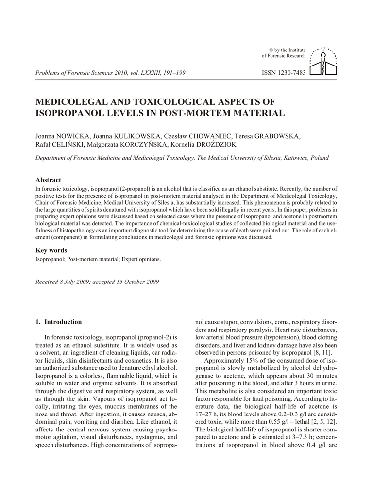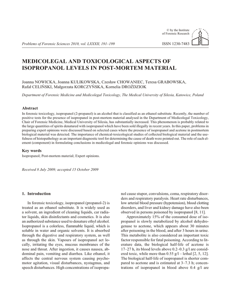© by the Institute of Forensic Research Problems of Forensic Sciences 2010, vol. LXXXII, 191–199 ISSN 1230-7483 MEDICOLEGAL AND TOXICOLOGICAL ASPECTS OF ISOPROPANOL LEVELS IN POST-MORTEM MATERIAL Joanna NOWICKA, Joanna KULIKOWSKA, Czes³aw CHOWANIEC, Teresa GRABOWSKA, ´ Rafa³ CELIÑSKI, Ma³gorzata KORCZYÑSKA, Kornelia DROZDZIOK Department of Forensic Medicine and Medicolegal Toxicology, The Medical University of Silesia, Katowice, Poland Abstract In forensic toxicology, isopropanol (2-propanol) is an alcohol that is classified as an ethanol substitute. Recently, the number of positive tests for the presence of isopropanol in post-mortem material analysed in the Department of Medicolegal Toxicology, Chair of Forensic Medicine, Medical University of Silesia, has substantially increased. This phenomenon is probably related to the large quantities of spirits denatured with isopropanol which have been sold illegally in recent years. In this paper, problems in preparing expert opinions were discussed based on selected cases where the presence of isopropanol and acetone in postmortem biological material was detected. The importance of chemical-toxicological studies of collected biological material and the usefulness of histopathology as an important diagnostic tool for determining the cause of death were pointed out. The role of each element (component) in formulating conclusions in medicolegal and forensic opinions was discussed. Key words Isopropanol; Post-mortem material; Expert opinions. Received 8 July 2009; accepted 15 October 2009 1. Introduction In forensic toxicology, isopropanol (propanol-2) is treated as an ethanol substitute. It is widely used as a solvent, an ingredient of cleaning liquids, car radiator liquids, skin disinfectants and cosmetics. It is also an authorized substance used to denature ethyl alcohol. Isopropanol is a colorless, flammable liquid, which is soluble in water and organic solvents. It is absorbed through the digestive and respiratory system, as well as through the skin. Vapours of isopropanol act locally, irritating the eyes, mucous membranes of the nose and throat. After ingestion, it causes nausea, abdominal pain, vomiting and diarrhea. Like ethanol, it affects the central nervous system causing psychomotor agitation, visual disturbances, nystagmus, and speech disturbances. High concentrations of isopropa- nol cause stupor, convulsions, coma, respiratory disorders and respiratory paralysis. Heart rate disturbances, low arterial blood pressure (hypotension), blood clotting disorders, and liver and kidney damage have also been observed in persons poisoned by isopropanol [8, 11]. Approximately 15% of the consumed dose of isopropanol is slowly metabolized by alcohol dehydrogenase to acetone, which appears about 30 minutes after poisoning in the blood, and after 3 hours in urine. This metabolite is also considered an important toxic factor responsible for fatal poisoning. According to literature data, the biological half-life of acetone is 17–27 h, its blood levels above 0.2–0.3 g/l are considered toxic, while more than 0.55 g/l – lethal [2, 5, 12]. The biological half-life of isopropanol is shorter compared to acetone and is estimated at 3–7.3 h; concentrations of isopropanol in blood above 0.4 g/l are 192 J. Nowicka, J. Kulikowska, C. Chowaniec et al. considered toxic, and above 1.5 g/l – lethal. The lethal dose of isopropanol is about 250 ml [2, 4, 12]. Clinical diagnosis of poisoning with isopropanol is based on information obtained at a medical interview relating to the circumstances of becoming ill (poisoning), assessment of clinical signs related to the symptomatology of the ethanol intoxication, clinical medical examination, toxicological examination of blood and urine confirming the presence of isopropanol and its metabolite – acetone, as well as the determination of the glucose level in order to exclude ketonuria and ketonemia in the course of diabetes mellitus. The treatment consists in elimination of isopropanol by vomiting, gastric lavage, administration of activated charcoal and laxatives, monitoring vital signs and implementation of multi-symptomatic treatment to compensate for the systemic and metabolic disturbances, as well as dialysis in cases of high concentrations of isopropanol (blood levels higher than 4 g/l) [11]. Isopropanol intoxications are primarily linked to social pathologies – isopropanol is drunk by persons addicted to alcohol as a substitute for consumer alcohol (alcoholic beverages). Consumption of preparations containing isopropanol can lead to accidental acute poisonings and even deaths. Medicolegal practice indicates that prolonged exposure to relatively small amounts of isopropanol (e.g. consumption of denatured alcohol for several days) may be equally dangerous [3]. Recently, a significant increase in the number of positive tests for the presence of isopropanol in postmortem material has been observed in the Department of Forensic Medicine and Medicolegal Toxicology, Medical University of Silesia. There were 5 cases in 2006, 6 in 2007, 25 in 2008 and as many as 19 up until the end of April 2009. In the authors’ opinion, this phenomenon is associated with illegal release onto the market of large quantities of spirits denatured with isopropanol. According to the Decree of the Minister of Agriculture and Rural Development issued in 2006 on denaturants authorised for denaturing ethyl alcohol, isopropanol with a specified minimum quantity of denaturant, i.e. 10 litres per 100 litres of 100% ethyl alcohol, was listed in 4th position. The revised version of the Decree issued in 2008 permits the application of isopropanol (in an amount not less than 6 litres per 100 litres of 100% ethyl alcohol) in combination with denatonium benzoate and essential oils or “scent compositions not intended for consumption” (Items 18 and 23) 1. 1 Journal of Laws of January 2, 2006, no 8, item 49; Journal of Laws of June 25, 2