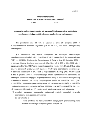 projekt ROZPORZĄDZENIE MINISTRA ROLNICTWA I ROZWOJU WSI1) z dnia …..……..…….…..…..2007 r. w sprawie ogólnych odstĊpstw od wymagaĔ higienicznych w zakáadach produkujących ĪywnoĞü tradycyjną pochodzenia zwierzĊcego Na podstawie art. 69 ust. 3 ustawy z dnia 25 sierpnia 2006 r. o bezpieczeĔstwie ĪywnoĞci i Īywienia (Dz. U. Nr 171, poz. 1225 ) zarządza siĊ, co nastĊpuje: § 1. Dopuszcza siĊ ogólne odstĊpstwa od wymagaĔ higienicznych okreĞlonych w rozdziale II pkt 1 i rozdziale V pkt 1 zaáącznika II do rozporządzenia (WE) nr 852/2004 Parlamentu Europejskiego i Rady z dnia 29 kwietnia 2004 r. w sprawie higieny Ğrodków spoĪywczych (Dz. Urz. UE L 139 z 30.4.2004, str. 1, z póĨn. zm.; Dz. Urz. UE Polskie wydanie specjalne, rozdz. 13, t. 34, str. 319, z póĨn. zm.) w zakáadach produkujących ĪywnoĞü tradycyjną pochodzenia zwierzĊcego, w zakresie okreĞlonym w art. 7 ust. 2 rozporządzenia Komisji (WE) nr 2074/2005 z dnia 5 grudnia 2005 r. ustanawiającego Ğrodki wykonawcze w odniesieniu do niektórych produktów objĊtych rozporządzeniem (WE) nr 853/2004 i do organizacji urzĊdowych kontroli na mocy rozporządzeĔ (WE) nr 854/2004 oraz (WE) nr 882/2004, ustanawiającego odstĊpstwa od rozporządzenia (WE) nr 852/2004 i zmieniającego rozporządzenie (WE) nr 853/2004 oraz (WE) nr 854/2004 (Dz. Urz. UE L 338 z 22.12.2005, str. 27, z póĨn. zm.), jeĪeli przyznanie tych odstĊpstw: 1) umoĪliwi zakáadom stosowanie tradycyjnej metody produkcji ĪywnoĞci pochodzenia zwierzĊcego, okreĞlonej: a) we wniosku o: - wpis produktu na listĊ produktów tradycyjnych prowadzonej przez ministra wáaĞciwego do spraw rynków rolnych, lub - rejestracjĊ produktu wysáanym do Komisji Europejskiej zgodnie z przepisami ustawy z dnia 17 grudnia 2004 r. o rejestracji i ochronie nazw i oznaczeĔ produktów rolnych i Ğrodków spoĪywczych oraz o produktach tradycyjnych (Dz. U. z 2005 r. Nr 10, poz. 68), lub b) w specyfikacji produktu, o której mowa w: - rozporządzeniu Rady (WE) nr 509/2006 z dnia 20 marca 2006 r. w sprawie produktów rolnych i Ğrodków spoĪywczych bĊdących gwarantowanymi tradycyjnymi specjalnoĞciami (Dz. Urz. UE L 93 z 31.03.2006, str. 1), lub - rozporządzeniu Rady (WE) nr 510/2006 z dnia 20 marca 2006 r. w sprawie ochrony oznaczeĔ geograficznych i nazw pochodzenia produktów rolnych i Ğrodków spoĪywczych (Dz. Urz. UE L 93 z 31.03.2006, str. 12); 2) nie bĊdzie miaáo wpáywu na zapewnienie bezpieczeĔstwa produkowanej ĪywnoĞci tradycyjnej pochodzenia zwierzĊcego, w szczególnoĞci nie bĊdzie przyczyną jej zanieczyszczenia. § 2. Rozporządzenie wchodzi w Īycie po upáywie 14 dni od dnia ogáoszenia. MINISTER ROLNICTWA I ROZWOJU WSI W porozumieniu: MINISTER ZDROWIA 1) Minister Rolnictwa i Rozwoju Wsi kieruje dziaáem administracji rządowej – rolnictwo, na podstawie § 1 ust. 2 pkt 1 rozporządzenia Prezesa Rady Ministrów z dnia 18 lipca 2006 r. w sprawie szczegóáowego zakresu dziaáania Ministra Rolnictwa i Rozwoju Wsi (Dz. U. Nr 131, poz. 915). 2 UZASADNIENIE Projekt rozporządzenia w sprawie ogólnych odstĊpstw od wymagaĔ higienicznych w zakáadach produkujących ĪywnoĞü tradycyjną pochodzenia zwierzĊcego stanowi wykonanie upowaĪnienia zawartego w art. 69 ust. 3 ustawy z dnia 25 sierpnia 2006 r. o bezpieczeĔstwie ĪywnoĞci i Īywienia (Dz. U. Nr 171, poz. 1225). Zgodnie z upowaĪnieniem ustawowym minister wáaĞciwy do spraw zdrowia oraz minister wáaĞciwy do spraw rolnictwa, kaĪdy w zakresie swojego dziaáania, dziaáając w porozumieniu, mogą okreĞliü, w drodze rozporządzenia, odstĊpstwa od wymagaĔ higienicznych okreĞlonych w rozdziale II pkt 1 i rozdziale V pkt 1 zaáącznika II do rozporządzenia nr 852/2004 Parlamentu Europejskiego i Rady z dnia 29 kwietnia 2004 r. w sprawie higieny Ğrodków spoĪywczych (Dz. Urz. UE L 139 z 30.4.2004, str. 1, z póĨn. zm.; Dz. Urz. UE Polskie wydanie specjalne, rozdz. 13, t. 34, str. 319, z póĨn. zm.), w zakáadach produkujących ĪywnoĞü tradycyjną, w zakresie okreĞlonym w art. 7 ust. 2 rozporządzenia Komisji (WE) nr 2074/2005 z dnia 5 grudnia 2005 r. ustanawiającego Ğrodki wykonawcze w odniesieniu do niektórych produktów objĊtych rozporządzeniem (WE) nr 853/2004 i do organizacji urzĊdowych kontroli na mocy rozporządzeĔ (WE) nr 854/2004 oraz (WE) nr 882/2004, ustanawiającego odstĊpstwa od rozporządzenia (WE) nr 852/2004 i zmieniającego rozporządzenie (WE) nr 853/2004 oraz (WE) nr 854/2004 (Dz. Urz. WE L 338 z 22.12.2005, str. 27, z póĨn. zm.), mając na wzglĊdzie umoĪliwienie zakáadom stosowania tradycyjnych metod produkcji oraz zapewnienie bezpieczeĔstwa ĪywnoĞci. Zgodnie z definicją zawartą w art. 3 ust 3 pkt 60 ustawy o bezpieczeĔstwie ĪywnoĞci i Īywienia, ĪywnoĞü tradycyjna to produkty rolne i Ğrodki spoĪywcze: a) których nazwy są zarejestrowane zgodnie z rozporządzeniem (WE) nr 509/2006 z dnia 20 marca 2006 r. w sprawie produktów rolnych i Ğrodków spoĪywczych bĊdących gwarantowanymi tradycyjnymi specjalnoĞciami (Dz. Urz. UE L 93 z 31.3.2006, str. 1) lub rozporządzeniem Rady (WE) nr 510/2006 z dnia 20 marca 2006 r. w sprawie ochrony oznaczeĔ geograficznych i nazw pochodzenia produktów rolnych i Ğrodków spoĪywczych (Dz. Urz. UE L 93 z 31.3.2006, str. 12), lub 3 b) w stosunku do których wnioski o rejestracjĊ zostaáy wysáane do Komisji Europejskiej zgodnie z przepisami ustawy z dnia 17 grudnia 2004 r. o rejestracji i ochronie nazw i oznaczeĔ produktów rolnych i Ğrodków spoĪywczych oraz o produktach tradycyjnych (Dz. U. z 2005 r. Nr 10, poz. 68), lub c) umieszczone na liĞcie produktów tradycyjnych prowadzonej przez ministra wáaĞciwego do spraw rynków rolnych. ĩywnoĞü tradycyjną, ze wzglĊdu na swoją specyfikĊ, wytwarza siĊ przy zachowaniu wyjątkowych, niezmiennych i kulturowo uwarunkowanych metod produkcji. Metody te gwarantują tradycyjnoĞü i unikalny charakter tych produktów. Trady
