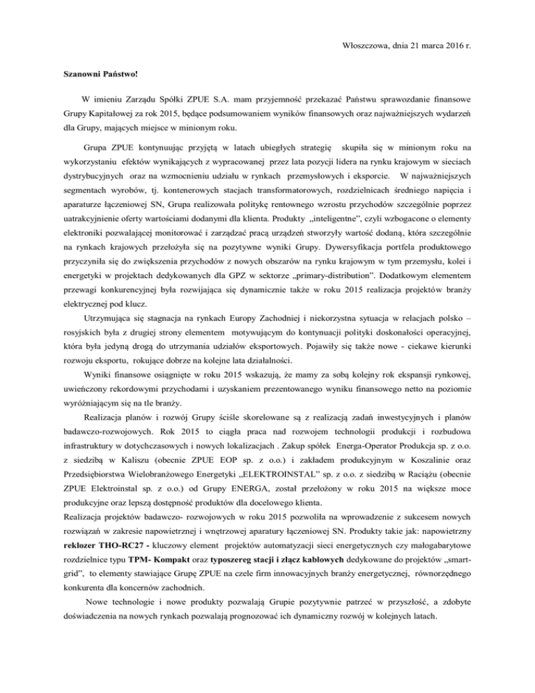 Włoszczowa, dnia 21 marca 2016 r. Szanowni Państwo! W imieniu Zarządu Spółki ZPUE S.A. mam przyjemność przekazać Państwu sprawozdanie finansowe Grupy Kapitałowej za rok 2015, będące podsumowaniem wyników finansowych oraz najważniejszych wydarzeń dla Grupy, mających miejsce w minionym roku. Grupa ZPUE kontynuując przyjętą w latach ubiegłych strategię skupiła się w minionym roku na wykorzystaniu efektów wynikających z wypracowanej przez lata pozycji lidera na rynku krajowym w sieciach dystrybucyjnych oraz na wzmocnieniu udziału w rynkach przemysłowych i eksporcie. W najważniejszych segmentach wyrobów, tj. kontenerowych stacjach transformatorowych, rozdzielnicach średniego napięcia i aparaturze łączeniowej SN, Grupa realizowała politykę rentownego wzrostu przychodów szczególnie poprzez uatrakcyjnienie oferty wartościami dodanymi dla klienta. Produkty „inteligentne”, czyli wzbogacone o elementy elektroniki pozwalającej monitorować i zarządzać pracą urządzeń stworzyły wartość dodaną, która szczególnie na rynkach krajowych przełożyła się na pozytywne wyniki Grupy. Dywersyfikacja portfela produktowego przyczyniła się do zwiększenia przychodów z nowych obszarów na rynku krajowym w tym przemysłu, kolei i energetyki w projektach dedykowanych dla GPZ w sektorze „primary-distribution”. Dodatkowym elementem przewagi konkurencyjnej była rozwijająca się dynamicznie także w roku 2015 realizacja projektów branży elektrycznej pod klucz. Utrzymująca się stagnacja na rynkach Europy Zachodniej i niekorzystna sytuacja w relacjach polsko – rosyjskich była z drugiej strony elementem motywującym do kontynuacji polityki doskonałości operacyjnej, która była jedyną drogą do utrzymania udziałów eksportowych. Pojawiły się także nowe - ciekawe kierunki rozwoju eksportu, rokujące dobrze na kolejne lata działalności. Wyniki finansowe osiągnięte w roku 2015 wskazują, że mamy za sobą kolejny rok ekspansji rynkowej, uwieńczony rekordowymi przychodami i uzyskaniem prezentowanego wyniku finansowego netto na poziomie wyróżniającym się na tle branży. Realizacja planów i rozwój Grupy ściśle skorelowane są z realizacją zadań inwestycyjnych i planów badawczo-rozwojowych. Rok 2015 to ciągła praca nad rozwojem technologii produkcji i rozbudowa infrastruktury w dotychczasowych i nowych lokalizacjach . Zakup spółek Energa-Operator Produkcja sp. z o.o. z siedzibą w Kaliszu (obecnie ZPUE EOP sp. z o.o.) i zakładem produkcyjnym w Koszalinie oraz Przedsiębiorstwa Wielobranżowego Energetyki „ELEKTROINSTAL” sp. z o.o. z siedzibą w Raciążu (obecnie ZPUE Elektroinstal sp. z o.o.) od Grupy ENERGA, został przełożony w roku 2015 na większe moce produkcyjne oraz lepszą dostępność produktów dla docelowego klienta. Realizacja projektów badawczo- rozwojowych w roku 2015 pozwoliła na wprowadzenie z sukcesem nowych rozwiązań w zakresie napowietrznej i wnętrzowej aparatury łączeniowej SN. Produkty takie jak: napowietrzny reklozer THO-RC27 - kluczowy element projektów automatyzacji sieci energetycznych czy małogabarytowe rozdzielnice typu TPM- Kompakt oraz typoszereg stacji i złącz kablowych dedykowane do projektów „smartgrid”, to elementy stawiające Grupę ZPUE na czele firm innowacyjnych branży energetycznej, równorzędnego konkurenta dla koncernów zachodnich. Nowe technologie i nowe produkty pozwalają Grupie pozytywnie patrzeć w przyszłość, a zdobyte doświadczenia na nowych rynkach pozwalają prognozować ich dynamiczny rozwój w kolejnych latach. Przywołując powyższe okoliczności, kolejny już raz z zadowoleniem i satysfakcją prezentujemy Państwu wyniki finansowe Grupy Kapitałowej ZPUE S.A. za rok 2015. Odnotowane wyraźne tendencje wzrostowe z pewnością pozwalają ocenić, że ukierunkowaliśmy swoje działania właściwie i z optymizmem możemy patrzeć w przyszłość. W tym miejscu chciałbym podziękować wszystkim, którzy w sposób wymierny przyczynili się do realizacji postawionych zamierzeń oraz zadań. Szczególne podziękowania kieruję do Akcjonariuszy, za okazane zaufanie dające jednocześnie motywację do dalszej pracy nad rozbudową i umacnianiem naszej organizacji. Z wyrazami szacunku Prezes Zarządu Andrzej Grzybek