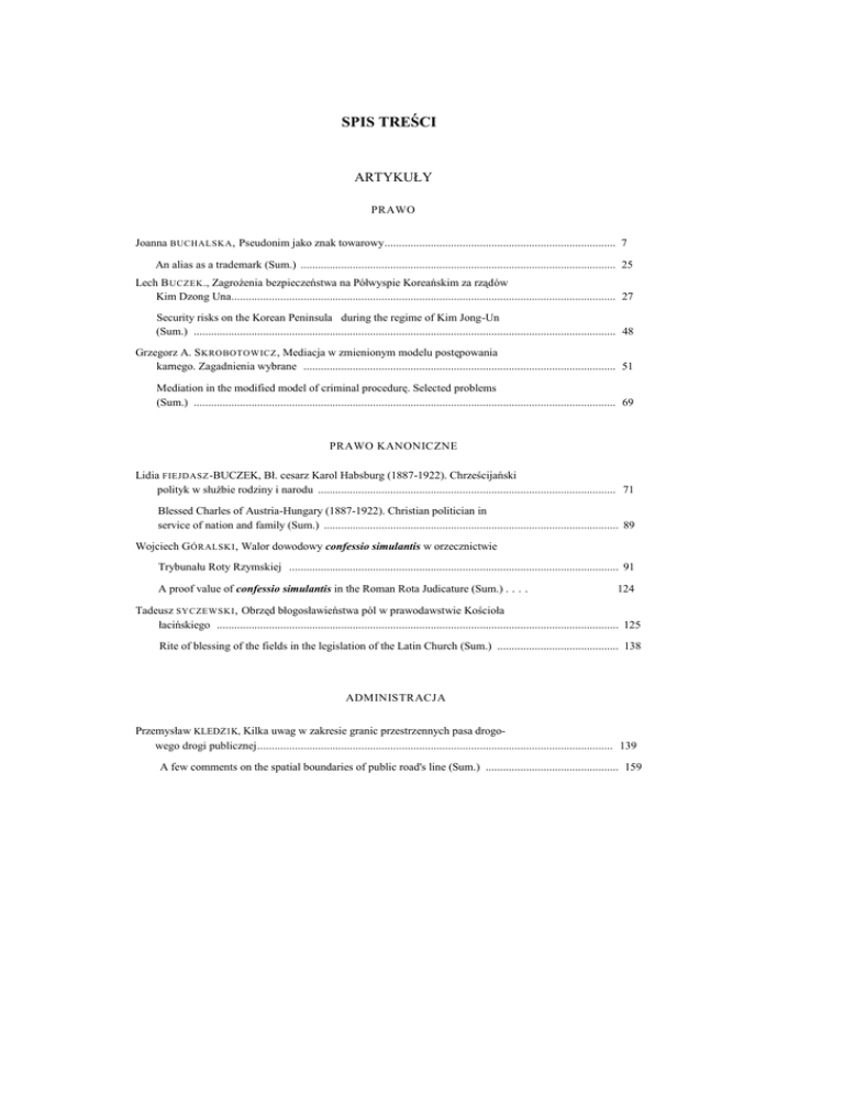 SPIS TREŚCI ARTYKUŁY PRAWO Joanna BUCHALSKA , Pseudonim jako znak towarowy ................................................................................ 7 An alias as a trademark (Sum.) ............................................................................................................. 25 Lech B UCZEK ., Zagrożenia bezpieczeństwa na Półwyspie Koreańskim za rządów Kim Dzong Una..................................................................................................................................... 27 Security risks on the Korean Peninsula during the regime of Kim Jong-Un (Sum.) .................................................................................................................................................. 48 Grzegorz A. S KROBOTOWICZ , Mediacja w zmienionym modelu postępowania karnego. Zagadnienia wybrane ............................................................................................................ 51 Mediation in the modified model of criminal procedurę. Selected problems (Sum.) .................................................................................................................................................. 69 PRAWO KANONICZNE Lidia FIEJDASZ -BUCZEK, Bł. cesarz Karol Habsburg (1887-1922). Chrześcijański polityk w służbie rodziny i narodu ....................................................................................................... 71 Blessed Charles of Austria-Hungary (1887-1922). Christian politician in service of nation and family (Sum.) ...................................................................................................... 89 Wojciech G ÓRALSKI , Walor dowodowy confessio simulantis w orzecznictwie Trybunału Roty Rzymskiej .................................................................................................................. 91 A proof value of confessio simulantis in the Roman Rota Judicature (Sum.) . . . . 124 Tadeusz SYCZEWSKI , Obrzęd błogosławieństwa pól w prawodawstwie Kościoła łacińskiego ........................................................................................................................................... 125 Rite of blessing of the fields in the legislation of the Latin Church (Sum.) .......................................... 138 ADMINISTRACJA Przemysław KLEDZ1K, Kilka uwag w zakresie granic przestrzennych pasa drogowego drogi publicznej ........................................................................................................................... 139 A few comments on the spatial boundaries of public road's line (Sum.) .............................................. 159 GLOSY Paulina BREJDAK , Glosa do wyroku Trybunału Konstytucyjnego z dnia 8 lipca 2014 r. sygn. AktK7/13 ........................................................................................................................ 161 The gloss to the Constitutional Court's Judgement of 8 july 2014, signature act k 7/13 (Sum.) ........................................................................................................................................ 159 RECENZJE Jan MOJRAK , Agnieszka Z YWICKA (red.), Sytuacja przedsiębiorcy w prawie publicznym i prywatnym w perspektywie europejskiej, Wydawnictwo Naukowe Wyższej Szkoły Ekonomii i Innowcji w Lublinie, Lublin 2016. Stan prawny na 1 września 2015 r. (Anna Haładyj) ....................................................................................................... 173 SPRAWOZDANIA Agnieszka ROMANKO, Ogólnopolska Konferencja Naukowa „Prawa człowieka w dobie konfliktu zbrojnego", Warszawa, 21 listopada 2015 ................................................................. 179