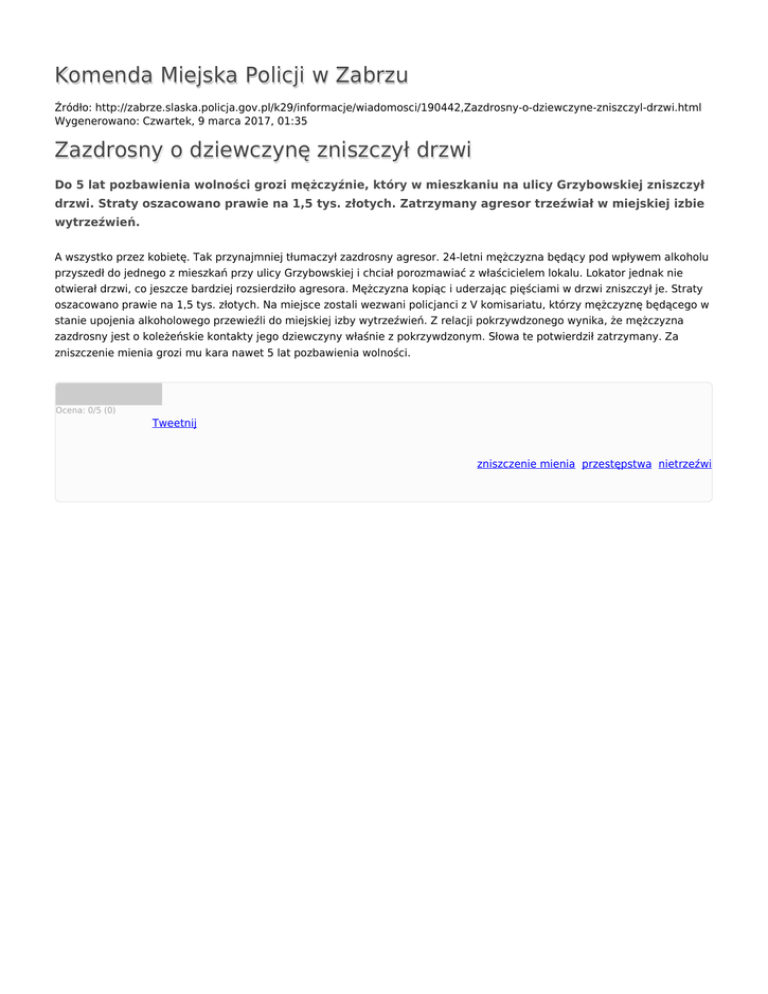 Komenda Miejska Policji w Zabrzu Źródło: http://zabrze.slaska.policja.gov.pl/k29/informacje/wiadomosci/190442,Zazdrosny-o-dziewczyne-zniszczyl-drzwi.html Wygenerowano: Czwartek, 9 marca 2017, 01:35 Zazdrosny o dziewczynę zniszczył drzwi Do 5 lat pozbawienia wolności grozi mężczyźnie, który w mieszkaniu na ulicy Grzybowskiej zniszczył drzwi. Straty oszacowano prawie na 1,5 tys. złotych. Zatrzymany agresor trzeźwiał w miejskiej izbie wytrzeźwień. A wszystko przez kobietę. Tak przynajmniej tłumaczył zazdrosny agresor. 24-letni mężczyzna będący pod wpływem alkoholu przyszedł do jednego z mieszkań przy ulicy Grzybowskiej i chciał porozmawiać z właścicielem lokalu. Lokator jednak nie otwierał drzwi, co jeszcze bardziej rozsierdziło agresora. Mężczyzna kopiąc i uderzając pięściami w drzwi zniszczył je. Straty oszacowano prawie na 1,5 tys. złotych. Na miejsce zostali wezwani policjanci z V komisariatu, którzy mężczyznę będącego w stanie upojenia alkoholowego przewieźli do miejskiej izby wytrzeźwień. Z relacji pokrzywdzonego wynika, że mężczyzna zazdrosny jest o koleżeńskie kontakty jego dziewczyny właśnie z pokrzywdzonym. Słowa te potwierdził zatrzymany. Za zniszczenie mienia grozi mu kara nawet 5 lat pozbawienia wolności. Ocena: 0/5 (0) Tweetnij zniszczenie mienia, przestępstwa, nietrzeźwi