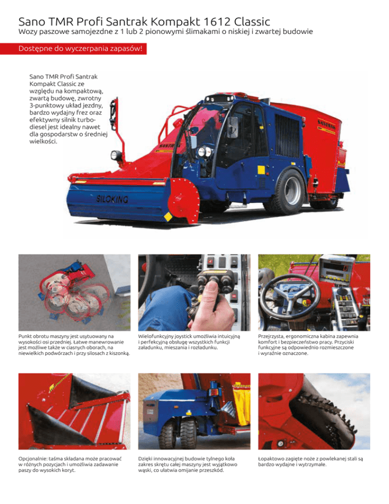 Sano TMR Profi Santrak Kompakt 1612 Classic Wozy paszowe samojezdne z 1 lub 2 pionowymi ślimakami o niskiej i zwartej budowie Dostępne do wyczerpania zapasów! Sano TMR Profi Santrak Kompakt Classic ze względu na kompaktową, zwartą budowę, zwrotny 3-punktowy układ jezdny, bardzo wydajny frez oraz efektywny silnik turbodiesel jest idealny nawet dla gospodarstw o średniej wielkości. Punkt obrotu maszyny jest usytuowany na wysokości osi przedniej. Łatwe manewrowanie jest możliwe także w ciasnych oborach, na niewielkich podwórzach i przy silosach z kiszonką. Wielofunkcyjny joystick umożliwia intuicyjną i perfekcyjną obsługę wszystkich funkcji załadunku, mieszania i rozładunku. Przejrzysta, ergonomiczna kabina zapewnia komfort i bezpieczeństwo pracy. Przyciski funkcyjne są odpowiednio rozmieszczone i wyraźnie oznaczone. Opcjonalnie: taśma składana może pracować w różnych pozycjach i umożliwia zadawanie paszy do wysokich koryt. Dzięki innowacyjnej budowie tylnego koła zakres skrętu całej maszyny jest wyjątkowo wąski, co ułatwia omijanie przeszkód. Łopaktowo zagięte noże z powlekanej stali są bardzo wydajne i wytrzymałe. Sano TMR Profi Santrak Kompakt 1612 Classic Wozy paszowe samojezdne z 1 lub 2 pionowymi ślimakami o niskiej i zwartej budowie Model 12 Classic Nr artykułu4120000000 13 Classic 4130000000 16 Classic 4160000000 Długość mm 7.530 7.530 8.640 Szerokość mm 2.550 2.550 2.550 Wysokość mm 2.560 2.650 2.650 Moc silnika kW[KM] 94 [128] 94 [128] 94 [128] Prędkość km/h 15 / 25 / 40 15 / 25 / 40 15 / 25 / 40 Opony przednie 400/70 R22.5 400/70 R22.5 400/70 R22.5 Opony tylne 27x10-12 27x10-12 27x10-12 Zewnętrzny rozstaw kół mm 2.300 2.300 2.300 Zewnętrzny promień skrętu mm 4.500 4.500 5.750 1 1 2 Liczba ślimaków regenerowane regenerowane regenerowane Liczba obrotów ślimaka l.obr/min 20 [przy liczbie obrotów silnika 2200 obr/min] 20 [przy liczbie obrotów silnika 2200 obr/min] 20 [przy liczbie obrotów silnika 2200 obr/min] 46 [przy liczbie obrotów silnika 2300 obr/min] 46 [przy liczbie obrotów silnika 2300 obr/min] 46 [przy liczbie obrotów silnika 2300 obr/min] Liczba zwojów ślimaka 2 2 2,25 Liczba noży 7 7 10 Masa własna wozu paszowego 9.400 9.600 10.400 kg Wyposażenie seryjne }3-punktowy układ jezdny o doskonałej zwrotności }bezstopniowa regulacja prędkości jazdy [0-15 km/h] }silnik turbo-diesel 4-cylindrowy 94 kW [128 KM] z chłodzeniem powietrza doładowującego [interkuler], poziom spalin III A }bardzo wydajny frez pobierający o szerokości 2m i zakresie wysokości do 3,80m }taśma załadowcza o szerokości 700 mm }system kamer: 4-dzielny monitor w kabinie i 2 kamery [możliwość podłączenia kolejnych 2 kamer] }dwie prędkości mieszania }komfortowa kabina z ogrzewaniem i podgrzewanymi lusterkami zewnętrznymi }podgrzewanie oleju hydraulicznego z wtyczką na gniazdko 230V }dodatkowa wycieraczka po prawej stronie kabiny }zasuwa wysypu z tyłu po lewej stronie }waga programowalna Win Scale }1 lub 2 turbo-ślimaki z ustawianymi, hartowanymi nożami tnącymi }kanciasty pojemnik }obręcz }przeciwnoże hydrauliczne Wyposażenie dodatkowe Sano TMR Profi Santrak Nr art. Nazwa Warianty prędkości Uwagi 4120000928 Wersja 25 km/h • resorowany układ jezdny z automatyczną regulacją poziomu • dwa zakresy prędkości [0-12 km/h i 0-25 km/h] • opony z profilem Heavy-Duty 385/65 R22.5 495/45 R 22.5 [model 18] dla modeli 12/13/15/16/18 4120000927 Wersja 40 km/h • resorowany układ jezdny z automatyczną regulacją poziomu • dwa zakresy prędkości [0-12 km/h i 0-40 km/h] • opony z profilem Heavy-Duty 385/65 R22.5 495/45 R 22.5 [model 18] • wskaźnik prędkości w konsoli operatora • dopasowana oś i blokada mechanizmu różnicowego dla modeli 12/13/16 zmiana masy własnej; dla modeli 15/18 redukcja dopuszczalnej masy 4120001103 Wersja 40 km/h • resorowany układ jezdny z automatyczną regulacją poziomu • dwa zakresy prędkości [0-12 km/h i 0-40 km/h] • opony z profilem Heavy-Duty 495/45 R22.5 • wskaźnik prędkości w konsoli operatora dla modelu 20 redukcja dopuszczalnej masy Warianty wysypu lewostronnego Zalecane wyposażenie x 4120000903 taśma z tyłu po lewej stronie wysuwana ukośnie w górę, długość 600 mm dla modeli 12/13/15 x- 4120000959 taśma z tyłu po lewej stronie wysuwana ukośnie w górę, długość 750 mm tylko dla modeli 16/18 x- 4120000953 taśma z tyłu po lewej stronie składana, długość 800 mm do napełniania koryt, szerokość ok. +250 mm 4120000925 taśma z tyłu po lewej stronie składana, długość 1100 mm do napełniania koryt, szerokość ok. +250 mm 4120000951 taśma z tyłu po lewej stronie składana, długość 1500 mm do napełniania koryt, szerokość ok. +250 mm Warianty wysypu prawostronnego 4120000901 dodatkowa zasuwa z przodu po prawej stronie dla modeli 12/13/15 x 4120000902 dodatkowa zasuwa z tyłu po prawej stronie dla modeli 12/13/15/16/18 4120000907 taśma z tyłu po prawej stronie [wysuwana ukośnie w górę, długość 600 mm] dla modeli 12/13/15 4120000937 taśma z tyłu po prawej stronie [stała, długość 750 mm] dla modeli 16/18 4120001146 dodatkowa zasuwa z tyłu po prawej stronie z taśmą z tyłu po prawej stronie, stała, długość 750 mm dla modelu 20 x Wyposażenie dodatkowe Sano TMR Profi Santrak Nr art. Nazwa Wyposażenie dodatkowe Uwagi Zalecane wyposażenie 4120000900 klimatyzacja 4120000921 elektryczny wskaźnik zasuwy dla 1 zasuwy wyświetlacz w kabinie kierowcy x 4120000922 elektryczny wskaźnik zasuwy dla 2 zasuw wyświetlacz w kabinie kierowcy x 4120000934 waga programowalna Top Scale dopłata do wagi programowalnej Win Scale F9896 Data Transfer przenoszenie danych z wagi na komputer E0026 dodatkowy wyświetlacz wagi instalacja na wozie paszowym 4120000941 amortyzowane siedzenie kierowcy 4120001164 pakiet ledowy dla reflektorów w dachu kabiny zamiast wyprowadzenia standardowego 4120000920 wstępne ogrzewanie silnika por
