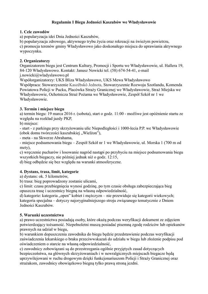 Regulamin I Biegu Jedności Kaszubów we Władysławowie 1. Cele