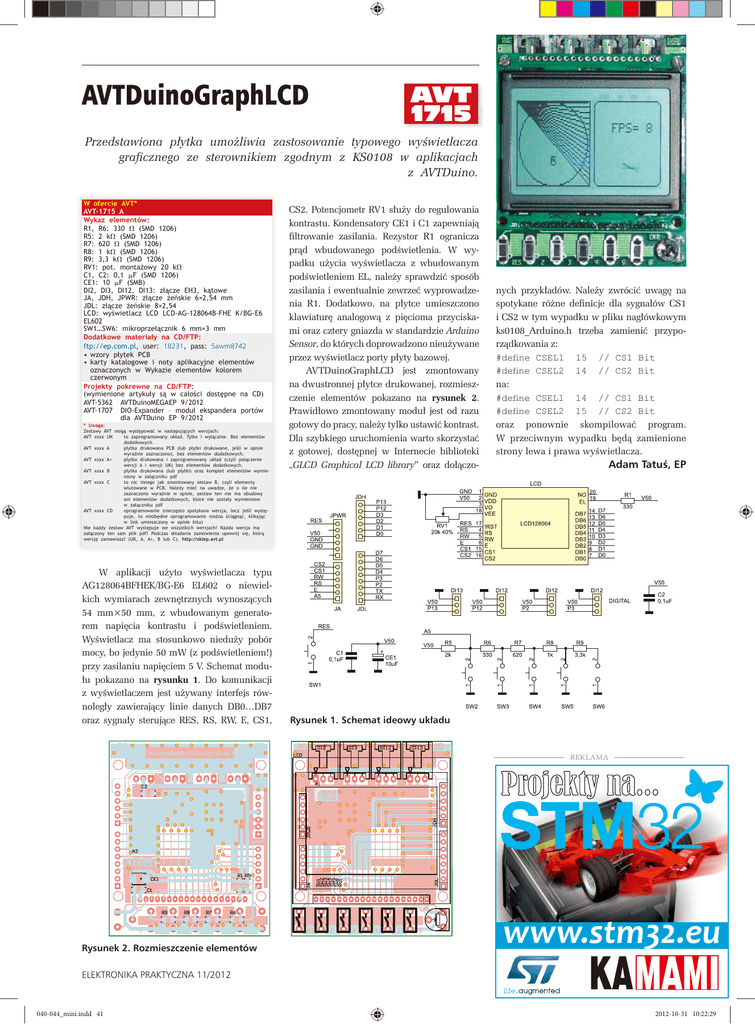 MINIPROJEKTY AVTDuinoGraphLCD AVT 1715 Przedstawiona płytka umożliwia zastosowanie typowego wyświetlacza graficznego ze sterownikiem zgodnym z KS0108 w aplikacjach z AVTDuino. W ofercie AVT* AVT-1715 A Wykaz elementów: R1, R6: 330 V (SMD 1206) R5: 2 kV (SMD 1206) R7: 620 V (SMD 1206) R8: 1 kV (SMD 1206) R9: 3,3 kV (SMD 1206) RV1: pot. montażowy 20 kV C1, C2: 0,1 mF (SMD 1206) CE1: 10 mF (SMB) DI2, DI3, DI12, DI13: złącze EH3, kątowe JA, JDH, JPWR: złącze żeńskie 6×2,54 mm JDL: złącze żeńskie 8×2,54 LCD: wyświetlacz LCD LCD-AG-128064B-FHE K/BG-E6 EL602 SW1…SW6: mikroprzełącznik 6 mm×3 mm Dodatkowe materiały na CD/FTP: ftp://ep.com.pl, user: 18231, pass: 5awm8742 • wzory płytek PCB • karty katalogowe i noty aplikacyjne elementów oznaczonych w Wykazie elementów kolorem czerwonym Projekty pokrewne na CD/FTP: (wymienione artykuły są w całości dostępne na CD) AVT-5362 AVTDuinoMEGAEP 9/2012 AVT-1707 DIO-Expander – moduł ekspandera portów dla AVTDuino EP 9/2012 * Uwaga: Zestawy AVT mogą występować w następujących wersjach: AVT xxxx UK to zaprogramowany układ. Tylko i wyłącznie. Bez elementów dodatkowych. AVT xxxx A płytka drukowana PCB (lub płytki drukowane, jeśli w opisie wyraźnie zaznaczono), bez elementów dodatkowych. AVT xxxx A+ płytka drukowana i zaprogramowany układ (czyli połączenie wersji A i wersji UK) bez elementów dodatkowych. AVT xxxx B płytka drukowana (lub płytki) oraz komplet elementów wymieniony w załączniku pdf AVT xxxx C to nic innego jak zmontowany zestaw B, czyli elementy wlutowane w PCB. Należy mieć na uwadze, że o ile nie zaznaczono wyraźnie w opisie, zestaw ten nie ma obudowy ani elementów dodatkowych, które nie zostały wymienione w załączniku pdf AVT xxxx CD oprogramowanie (nieczęsto spotykana wersja, lecz jeśli występuje, to niezbędne oprogramowanie można ściągnąć, klikając w link umieszczony w opisie kitu) Nie każdy zestaw AVT występuje we wszystkich wersjach! Każda wersja ma załączony ten sam plik pdf! Podczas składania zamówienia upewnij się, którą wersję zamawiasz! (UK, A, A+, B lub C). http://sklep.avt.pl W aplikacji użyto wyświetlacza typu AG128064BFHEK/BG-E6 EL602 o niewielkich wymiarach zewnętrznych wynoszących 54 mm×50 mm, z wbudowanym generatorem napięcia kontrastu i podświetleniem. Wyświetlacz ma stosunkowo nieduży pobór mocy, bo jedynie 50 mW (z podświetleniem!) przy zasilaniu napięciem 5 V. Schemat modułu pokazano na rysunku 1. Do komunikacji z wyświetlaczem jest używany interfejs równoległy zawierający linie danych DB0…DB7 oraz sygnały sterujące RES, RS, RW, E, CS1, CS2. Potencjometr RV1 służy do regulowania kontrastu. Kondensatory CE1 i C1 zapewniają filtrowanie zasilania. Rezystor R1 ogranicza prąd wbudowanego podświetlenia. W wypadku użycia wyświetlacza z wbudowanym podświetleniem EL, należy sprawdzić sposób zasilania i ewentualnie zewrzeć wyprowadzenia R1. Dodatkowo, na płytce umieszczono klawiaturę analogową z pięcioma przyciskami oraz cztery gniazda w standardzie Arduino Sensor, do których doprowadzono nieużywane przez wyświetlacz porty płyty bazowej. AVTDuinoGraphLCD jest zmontowany na dwustronnej płytce drukowanej, rozmieszczenie elementów pokazano na rysunek 2. Prawidłowo zmontowany moduł jest od razu gotowy do pracy, należy tylko ustawić kontrast. Dla szybkiego uruchomienia warto skorzystać z gotowej, dostępnej w Internecie biblioteki „GLCD Graphical LCD library” oraz dołączo- nych przykładów. Należy zwrócić uwagę na spotykane różne definicje dla sygnałów CS1 i CS2 w tym wypadku w pliku nagłówkowym ks0108_Arduino.h trzeba zamienić przyporządkowania z: #define CSEL1 15 // CS1 Bit #define CSEL2 14 // CS2 Bit na: #define CSEL1 14 // CS1 Bit #define CSEL2 15 // CS2 Bit oraz ponownie skompilować program. W przeciwnym wypadku będą zamienione strony lewa i prawa wyświetlacza. Adam Tatuś, EP Rysunek 1. Schemat ideowy układu REKLAMA Rysunek 2. Rozmieszczenie elementów ELEKTRONIKA PRAKTYCZNA 11/2012 040-044_mini.indd 41 41 2012-10-31 10:22:29
