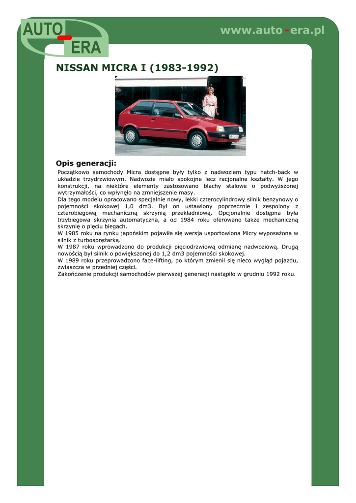 www.auto - era.pl NISSAN MICRA I (1983-1992) Opis generacji: Początkowo samochody Micra dostępne były tylko z nadwoziem typu hatch-back w układzie trzydrzwiowym. Nadwozie miało spokojne lecz racjonalne kształty. W jego konstrukcji, na niektóre elementy zastosowano blachy stalowe o podwyższonej wytrzymałości, co wpłynęło na zmniejszenie masy. Dla tego modelu opracowano specjalnie nowy, lekki czterocylindrowy silnik benzynowy o pojemności skokowej 1,0 dm3. Był on ustawiony poprzecznie i zespolony z czterobiegową mechaniczną skrzynią przekładniową. Opcjonalnie dostępna była trzybiegowa skrzynia automatyczna, a od 1984 roku oferowano także mechaniczną skrzynię o pięciu biegach. W 1985 roku na rynku japońskim pojawiła się wersja usportowiona Micry wyposażona w silnik z turbosprężarką. W 1987 roku wprowadzono do produkcji pięciodrzwiową odmianę nadwoziową. Drugą nowością był silnik o powiększonej do 1,2 dm3 pojemności skokowej. W 1989 roku przeprowadzono face-lifting, po którym zmienił się nieco wygląd pojazdu, zwłaszcza w przedniej części. Zakończenie produkcji samochodów pierwszej generacji nastąpiło w grudniu 1992 roku.