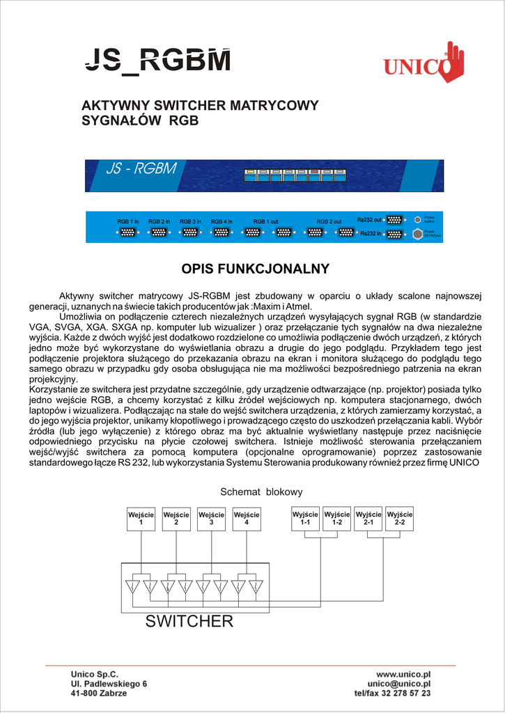 JS_RGBM AKTYWNY SWITCHER MATRYCOWY SYGNA£ÓW RGB JS - RGBM RGB 1 in RGB 2 in RGB 3 in RGB 4 in RGB 1 out RGB 2 out Rs232 out Rs232 in Power switch Power 9V/700mA OPIS FUNKCJONALNY Aktywny switcher matrycowy JS-RGBM jest zbudowany w oparciu o uk³ady scalone najnowszej generacji, uznanych na œwiecie takich producentów jak :Maxim i Atmel. Umo¿liwia on pod³¹czenie czterech niezale¿nych urz¹dzeñ wysy³aj¹cych sygna³ RGB (w standardzie VGA, SVGA, XGA. SXGA np. komputer lub wizualizer ) oraz prze³¹czanie tych sygna³ów na dwa niezale¿ne wyjœcia. Ka¿de z dwóch wyjœæ jest dodatkowo rozdzielone co umo¿liwia pod³¹czenie dwóch urz¹dzeñ, z których jedno mo¿e byæ wykorzystane do wyœwietlania obrazu a drugie do jego podgl¹du. Przyk³adem tego jest pod³¹czenie projektora s³u¿¹cego do przekazania obrazu na ekran i monitora s³u¿¹cego do podgl¹du tego samego obrazu w przypadku gdy osoba obs³uguj¹ca nie ma mo¿liwoœci bezpoœredniego patrzenia na ekran projekcyjny. Korzystanie ze switchera jest przydatne szczególnie, gdy urz¹dzenie odtwarzaj¹ce (np. projektor) posiada tylko jedno wejœcie RGB, a chcemy korzystaæ z kilku Ÿróde³ wejœciowych np. komputera stacjonarnego, dwóch laptopów i wizualizera. Pod³¹czaj¹c na sta³e do wejœæ switchera urz¹dzenia, z których zamierzamy korzystaæ, a do jego wyjœcia projektor, unikamy k³opotliwego i prowadz¹cego czêsto do uszkodzeñ prze³¹czania kabli. Wybór Ÿród³a (lub jego wy³¹czenie) z którego obraz ma byæ aktualnie wyœwietlany nastêpuje przez naciœniêcie odpowiedniego przycisku na p³ycie czo³owej switchera. Istnieje mo¿liwoœæ sterowania prze³¹czaniem wejœæ/wyjœæ switchera za pomoc¹ komputera (opcjonalne oprogramowanie) poprzez zastosowanie standardowego ³¹cze RS 232, lub wykorzystania Systemu Sterowania produkowany równie¿ przez firmê UNICO Schemat blokowy Wejœcie 1 Wejœcie 2 Wejœcie 3 SWITCHER Wejœcie 4 Wyjœcie Wyjœcie Wyjœcie Wyjœcie 1-1 1-2 2-1 2-2 Model wejœcia opornoœæ czu³oœæ czêstotliwoœæ wyjœcia opornoœæ czu³oœæ czêstotliwoœæ czas prze³¹czania temperatura pracy zasilanie RS 232 wymiary * JS-RGBM RGB 4x Dsub 15 pin 75 ohm 1V/V 250 MHz RGB 2x2 D-sub 15 pin 75 ohm 1V/V 250 MHz 30 ns 5 st. C - 45 st. C 9 V DC/700 mA wej/wyj D-sub 9 pin 445 x 150 x 40 mm