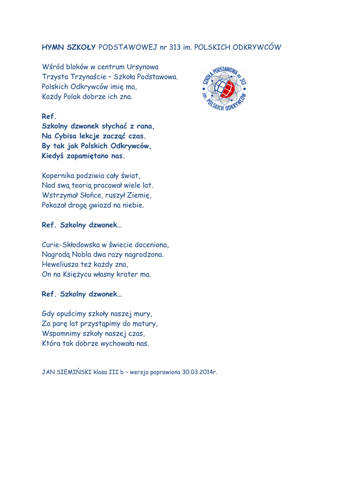 HYMN SZKOŁY PODSTAWOWEJ nr 313 im. POLSKICH ODKRYWCÓW Wśród bloków w centrum Ursynowa Trzysta Trzynaście – Szkoła Podstawowa. Polskich Odkrywców imię ma, Każdy Polak dobrze ich zna. Ref. Szkolny dzwonek słychać z rana, Na Cybisa lekcje zacząć czas. By tak jak Polskich Odkrywców, Kiedyś zapamiętano nas. Kopernika podziwia cały świat, Nad swą teorią pracował wiele lat. Wstrzymał Słońce, ruszył Ziemię, Pokazał drogę gwiazd na niebie. Ref. Szkolny dzwonek… Curie-Skłodowska w świecie doceniona, Nagrodą Nobla dwa razy nagrodzona. Heweliusza też każdy zna, On na Księżycu własny krater ma. Ref. Szkolny dzwonek… Gdy opuścimy szkoły naszej mury, Za parę lat przystąpimy do matury, Wspomnimy szkoły naszej czas, Która tak dobrze wychowała nas. JAN SIEMIŃSKI klasa III b – wersja poprawiona 30.03.2014r.