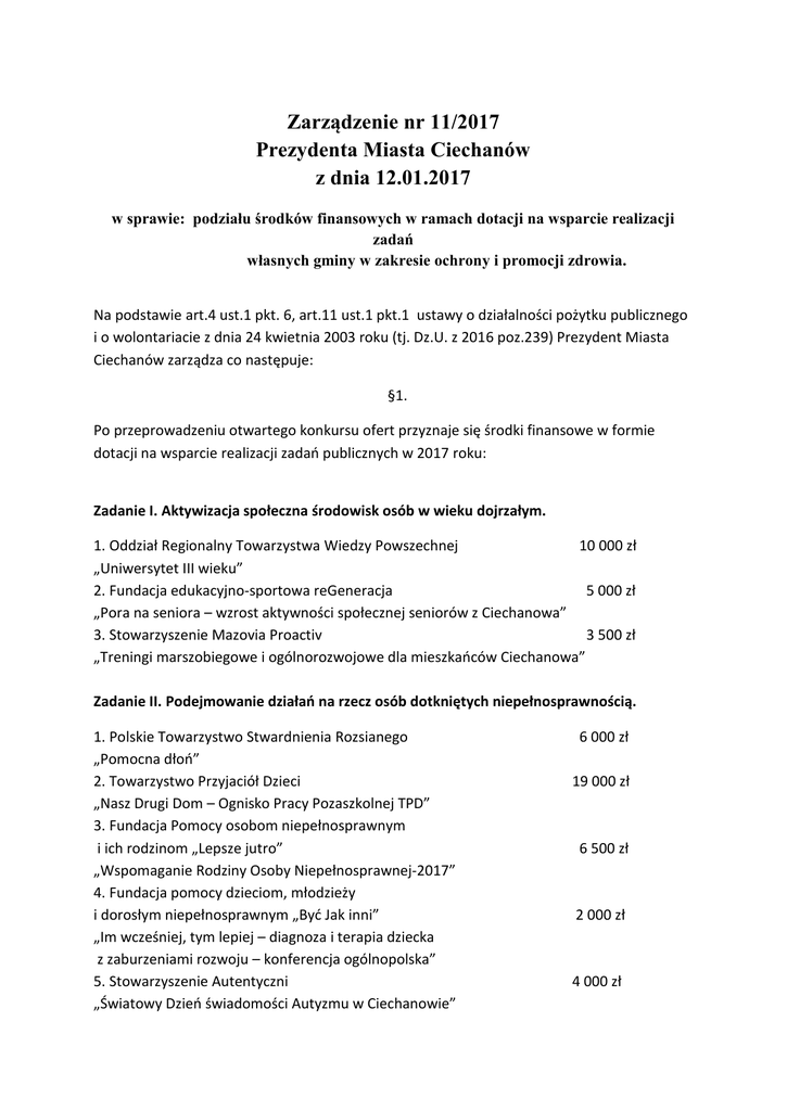 Zarządzenie nr 11/2017 Prezydenta Miasta Ciechanów z dnia 12.01.2017 w sprawie: podziału środków finansowych w ramach dotacji na wsparcie realizacji zadań własnych gminy w zakresie ochrony i promocji zdrowia. Na podstawie art.4 ust.1 pkt. 6, art.11 ust.1 pkt.1 ustawy o działalności pożytku publicznego i o wolontariacie z dnia 24 kwietnia 2003 roku (tj. Dz.U. z 2016 poz.239) Prezydent Miasta Ciechanów zarządza co następuje: §1. Po przeprowadzeniu otwartego konkursu ofert przyznaje się środki finansowe w formie dotacji na wsparcie realizacji zadań publicznych w 2017 roku: Zadanie I. Aktywizacja społeczna środowisk osób w wieku dojrzałym. 1. Oddział Regionalny Towarzystwa Wiedzy Powszechnej 10 000 zł „Uniwersytet III wieku” 2. Fundacja edukacyjno-sportowa reGeneracja 5 000 zł „Pora na seniora – wzrost aktywności społecznej seniorów z Ciechanowa” 3. Stowarzyszenie Mazovia Proactiv 3 500 zł „Treningi marszobiegowe i ogólnorozwojowe dla mieszkańców Ciechanowa” Zadanie II. Podejmowanie działań na rzecz osób dotkniętych niepełnosprawnością. 1. Polskie Towarzystwo Stwardnienia Rozsianego „Pomocna dłoń” 2. Towarzystwo Przyjaciół Dzieci „Nasz Drugi Dom – Ognisko Pracy Pozaszkolnej TPD” 3. Fundacja Pomocy osobom niepełnosprawnym i ich rodzinom „Lepsze jutro” „Wspomaganie Rodziny Osoby Niepełnosprawnej-2017” 4. Fundacja pomocy dzieciom, młodzieży i dorosłym niepełnosprawnym „Być Jak inni” „Im wcześniej, tym lepiej – diagnoza i terapia dziecka z zaburzeniami rozwoju – konferencja ogólnopolska” 5. Stowarzyszenie Autentyczni „Światowy Dzień świadomości Autyzmu w Ciechanowie” 6 000 zł 19 000 zł 6 500 zł 2 000 zł 4 000 zł 6. Mazowieckie Stowarzyszenie „Pomagajmy Razem” „Wyjazd integracyjny dla osób niepełnosprawnych” 3 000 zł Zadanie III. Organizacja zadań z zakresu profilaktyki i promocji zdrowia. 2. Zarząd Rejonowy Polskiego Czerwonego Krzyża 6 000 zł „Promocja zdrowia i bezpieczeństwa wśród młodzieży czerwonokrzyskiej” §2. Zarządzenie wchodzi w życie z dniem podpisania i podlega ogłoszeniu Prezydent Miasta Ciechanów Krzysztof Kosiński