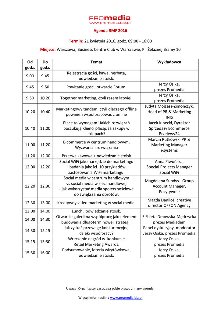 Agenda RMF 2016 Termin: 21 kwietnia 2016, godz. 09:00 - 16:00 Miejsce: Warszawa, Business Centre Club w Warszawie, Pl. Żelaznej Bramy 10 Od godz. Do godz. 9.00 9.45 Rejestracja gości, kawa, herbata, odwiedzanie stoisk. 9.45 9.50 Powitanie gości, otwarcie Forum. 9.50 10.20 Together marketing, czyli razem łatwiej. 10.20 10.40 Marketingowy tandem, czyli dlaczego offline powinien współpracować z online 10.40 11.00 Płacę to wymagam! Jakich rozwiązań poszukują Klienci płacąc za zakupy w sklepach? 11.00 11.20 E-commerce w centrum handlowym. Wyzwania i rozwiązania 11.20 12.00 12.00 12.20 Temat Wykładowca Jerzy Osika, prezes Promedia Jerzy Osika, prezes Promedia Judyta Mojżesz-Zimonczyk, Head of PR & Marketing INIS Jacek Kinecki, Dyrektor Sprzedaży Ecommerce Przelewy24 Marcin Rutkowski PR & Marketing Manager i-systems Przerwa kawowa + odwiedzanie stoisk Social WiFi jako narzędzie do marketingu i badania jakości. 10 przykładów zastosowania WiFi marketingu. Social media w centrum handlowym vs social media w sieci handlowej - jak wykorzystać media społecznościowe do zwiększania obrotów. 12.20 12.30 12.30 13.00 Kreatywny video marketing w social media. 13.00 14.00 14.00 14.30 14.30 15.15 15.15 15:30 15:30 16:00 Lunch, odwiedzanie stoisk. Otwarcie galerii na współpracę jako element budowania długoterminowej strategii. Jak zyskać przewagę konkurencyjną dzięki współpracy? Wręczenie nagród w konkursie Retail Marketing Awards. Podsumowanie, loteria wizytówkowa, odwiedzanie stoisk. Anna Piwońska, Special Projects Manager Social WiFi Magdalena Subdys - Group Account Manager, Pozytywnie Magda Daniłoś, creative director OFFON Agency Elżbieta Dmowska-Mędrzycka prezes Mediadem Panel dyskusyjny, moderator Jerzy Osika, prezes Promedia Jerzy Osika, prezes Promedia Jerzy Osika, prezes Promedia Uwaga: Organizator zastrzega sobie prawo zmiany agendy. Więcej informacji na www.promedia.biz.pl