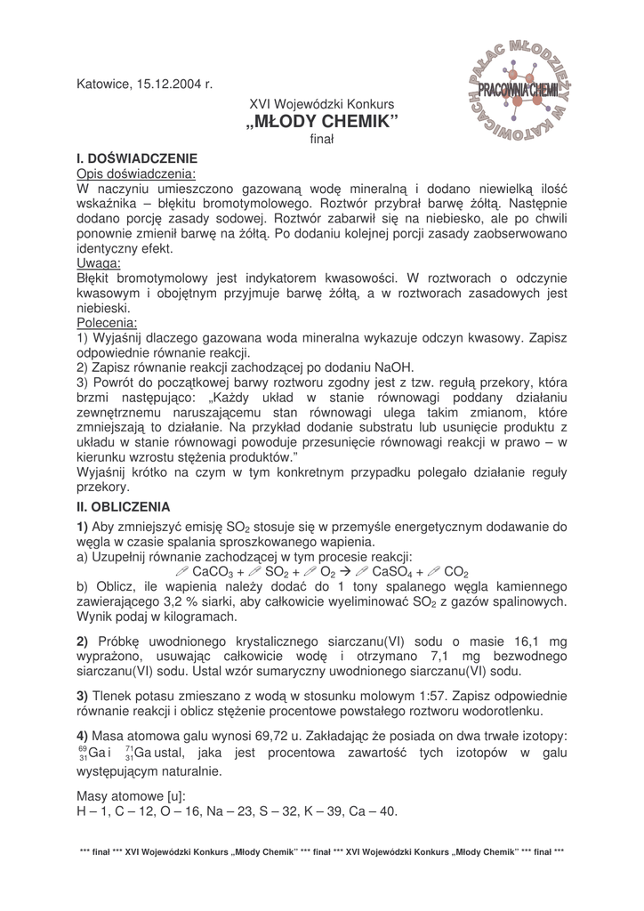 Katowice, 15.12.2004 r. XVI Wojewódzki Konkurs „MŁODY CHEMIK” finał I. DO WIADCZENIE Opis do wiadczenia: W naczyniu umieszczono gazowan wod mineraln i dodano niewielk ilo wska nika – bł kitu bromotymolowego. Roztwór przybrał barw ółt . Nast pnie dodano porcj zasady sodowej. Roztwór zabarwił si na niebiesko, ale po chwili ponownie zmienił barw na ółt . Po dodaniu kolejnej porcji zasady zaobserwowano identyczny efekt. Uwaga: Bł kit bromotymolowy jest indykatorem kwasowo ci. W roztworach o odczynie kwasowym i oboj tnym przyjmuje barw ółt , a w roztworach zasadowych jest niebieski. Polecenia: 1) Wyja nij dlaczego gazowana woda mineralna wykazuje odczyn kwasowy. Zapisz odpowiednie równanie reakcji. 2) Zapisz równanie reakcji zachodz cej po dodaniu NaOH. 3) Powrót do pocz tkowej barwy roztworu zgodny jest z tzw. reguł przekory, która brzmi nast puj co: „Ka dy układ w stanie równowagi poddany działaniu zewn trznemu naruszaj cemu stan równowagi ulega takim zmianom, które zmniejszaj to działanie. Na przykład dodanie substratu lub usuni cie produktu z układu w stanie równowagi powoduje przesuni cie równowagi reakcji w prawo – w kierunku wzrostu st enia produktów.” Wyja nij krótko na czym w tym konkretnym przypadku polegało działanie reguły przekory. II. OBLICZENIA 1) Aby zmniejszy emisj SO2 stosuje si w przemy le energetycznym dodawanie do w gla w czasie spalania sproszkowanego wapienia. a) Uzupełnij równanie zachodz cej w tym procesie reakcji: CaCO3 + SO2 + O2 CaSO4 + CO2 b) Oblicz, ile wapienia nale y doda do 1 tony spalanego w gla kamiennego zawieraj cego 3,2 % siarki, aby całkowicie wyeliminowa SO2 z gazów spalinowych. Wynik podaj w kilogramach. 2) Próbk uwodnionego krystalicznego siarczanu(VI) sodu o masie 16,1 mg wypra ono, usuwaj c całkowicie wod i otrzymano 7,1 mg bezwodnego siarczanu(VI) sodu. Ustal wzór sumaryczny uwodnionego siarczanu(VI) sodu. 3) Tlenek potasu zmieszano z wod w stosunku molowym 1:57. Zapisz odpowiednie równanie reakcji i oblicz st enie procentowe powstałego roztworu wodorotlenku. 4) Masa atomowa galu wynosi 69,72 u. Zakładaj c e posiada on dwa trwałe izotopy: 69 71 jaka jest procentowa zawarto tych izotopów w galu 31 Ga i 31Ga ustal, wyst puj cym naturalnie. Masy atomowe [u]: H – 1, C – 12, O – 16, Na – 23, S – 32, K – 39, Ca – 40. *** finał *** XVI Wojewódzki Konkurs „Młody Chemik” *** finał *** XVI Wojewódzki Konkurs „Młody Chemik” *** finał *** III. PRAWDA CZY FAŁSZ ? Okre l, które ze sformułowa s prawdziwe, a które fałszywe. 1. Acetylen jest w glowodorem nienasyconym. 2. W glowodory posiadaj grup funkcyjn –CH3. 3. Alkohol etylowy bardzo dobrze miesza si z wod . 4. W cz steczce kwasu propionowego wyst puje jedno wi zanie potrójne. 5. Estry to zwi zki wyró niaj ce si pi knymi barwami. 6. Tłuszcze s estrami glicerolu (gliceryny). 7. Jodyna zabarwia substancje zawieraj ce skrobi na kolor czerwony. 8. Reakcja ksantoproteinowa słu y do wykrywania białek. 9. Mydła to estry. 10. Roztwór glukozy od roztworu sacharozy mo na odró ni przy pomocy próby Trommera (ogrzewanie z Cu(OH)2). IV. TLENKI Uszereguj tlenki Al2O3, MgO, N2O5 i SiO2 w trzy szeregi, tak aby: a) w pierwszym szeregu charakter tlenku zmieniał si od najbardziej kwasowego do najbardziej zasadowego, b) w drugim szeregu warto ciowo pierwiastków poł czonych z tlenem wzrastała, c) w trzecim szeregu sumaryczna ilo wi za w cz steczce tlenku wzrastała. V. KRZY OWKA Rozwi krzy ówk wpisuj c hasła od zewn trz do rodka. Wszystkie hasła rozpoczynaj si na t sam liter . Ostatnie litery haseł utworz rozwi zanie – nazw jednego z w glowodorów. Podaj jego wzór sumaryczny. 1. Substancja powstała w 1. wyniku reakcji chemicznej. 2. Materiał w postaci cienkich arkuszy zło ony głównie z celulozy. 2. 8. 3. „Porcje” substancji przeznaczone np. do analizy. 4. Pierwiastek o symbolu Pd, stosowany jako katalizator w wielu reakcjach chemicznych. 7. 3. 5. Rozpuszczalniki, których cz steczki s dipolami to rozpuszczalniki ……………..…. 6. …………. laboratoryjny – mo e by Bunsena, Meckera lub spirytusowy. 6. 4. 7. nied – zielony nalot na powierzchni miedzi i jej stopów. 8. Cz stka elementarna o ładunku dodatnim i masie zbli onej do masy neutronu. 5. *** finał *** XVI Wojewódzki Konkurs „Młody Chemik” *** finał *** XVI Wojewódzki Konkurs „Młody Chemik” *** finał ***
