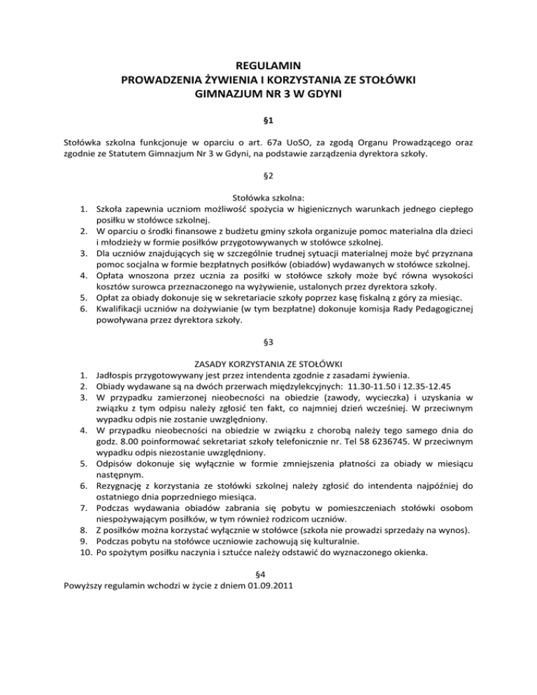 Regulamin stołówki - Gimnazjum Nr 3 w Gdyni
