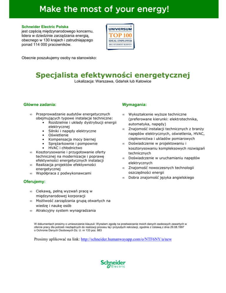 Make the most of your energy! Schneider Electric Polska jest częścią międzynarodowego koncernu, lidera w dziedzinie zarządzania energią, obecnego w 130 krajach i zatrudniającego ponad 114 000 pracowników. Obecnie poszukujemy osoby na stanowisko: Specjalista efektywności energetycznej Lokalizacja: Warszawa, Gdańsk lub Katowice Główne zadania: • • • • Przeprowadzanie audytów energetycznych obejmujących typowe instalacje techniczne: • Rozdzielnie i układy dystrybucji energii elektrycznej • Silniki i napędy elektryczne • Oświetlenie • Kompensacja mocy biernej • Sprężarkownie i pompownie • HVAC i chłodnictwo Kosztorysowanie i przygotowanie oferty technicznej na modernizacje i poprawę efektywności energetycznych instalacji Realizacja projektów efektywności energetycznej Współpraca z podwykonawcami Wymagania: • • • • • • Wykształcenie wyższe techniczne (preferowane kierunki: elektrotechnika, automatyka, napędy) Znajomość instalacji technicznych z branży napędów elektrycznych, oświetlenia, HVAC, ciepłownictwa i ukladów pomiarowych Doświadczenie w projektowaniu i kosztorysowaniu kompleksowych rozwiązań technicznych Doświadczenie w uruchamianiu napędów elektrycznych Znajomość nowoczesnych technologii oszczędności energii Dobra znajomość języka angielskiego Oferujemy: • • • Ciekawą, pełną wyzwań pracę w międzynarodowej korporacji Możliwość zarządzania grupą otwartych na wiedzę i naukę osób Atrakcyjny system wynagradzania W dokumentach prosimy o umieszczenie klauzuli: Wyrażam zgodę na przetwarzanie moich danych osobowych zawartych w ofercie pracy dla potrzeb niezbędnych do realizacji procesu tej i przyszłych rekrutacji, zgodnie z Ustawą z dnia 29.08.1997 o Ochronie Danych Osobowych Dz. U. nr 133 poz. 883 Prosimy aplikować na link: http://schneider.humanwayapp.com/o/NTF6NY/a/new