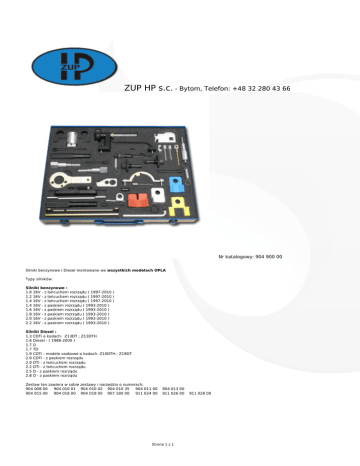 ZUP HP s.c. - Bytom, Telefon: +48 32 280 43 66 Nr katalogowy: 904 900 00 Silniki benzynowe i Diesel montowane we wszystkich modelach OPLA Typy silników: Silniki benzynowe : 1.0 16V - z łańcuchem rozrządu ( 1997-2010 ) 1.2 16V - z łańcuchem rozrządu ( 1997-2010 ) 1.4 16V - z łańcuchem rozrządu ( 1997-2010 ) 1.4 16V - z paskiem rozrządu ( 1993-2010 ) 1.6 16V - z paskiem rozrządu ( 1993-2010 ) 1.8 16V - z paskiem rozrządu ( 1993-2010 ) 2.0 16V - z paskiem rozrządu ( 1993-2010 ) 2.2 16V - z paskiem rozrządu ( 1993-2010 ) Silniki Diesel : 1.3 CDTi o kodach: Z13DT ; Z13DTH 1.6 Diesel - ( 1986-2000 ) 1.7 D 1.7 TD 1.9 CDTi - modele osobowe o kodach: Z19DTH ; Z19DT 2.0 CDTi - z paskiem rozrządu 2.0 DTi - z łańcuchem rozrządu 2.2 DTi - z łańcuchem rozrządu 2.5 D - z paskiem rozrządu 2.8 D - z paskiem rozrządu Zestaw ten zawiera w sobie zestawy i narzędzia o numerach: 904 008 00 904 010 01 904 010 02 904 010 35 904 011 00 904 013 00 904 015 00 904 018 00 904 019 00 907 180 00 911 024 00 911 026 00 911 028 00 Strona 1 z 1