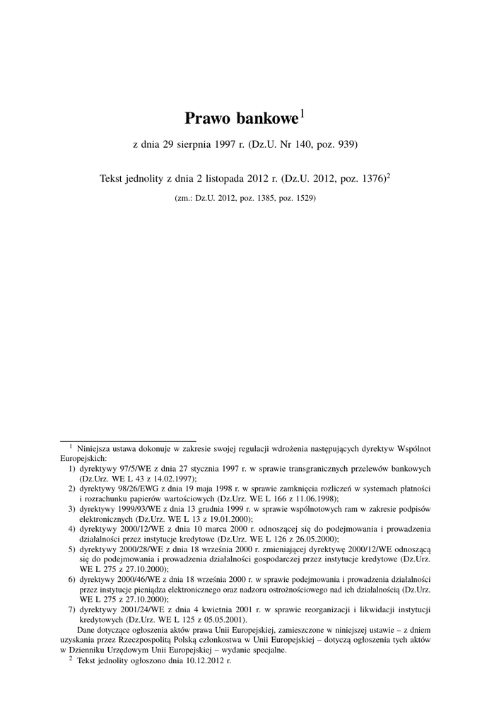 Prawo bankowe1 z dnia 29 sierpnia 1997 r. (Dz.U. Nr 140, poz. 939) Tekst jednolity z dnia 2 listopada 2012 r. (Dz.U. 2012, poz. 1376)2 (zm.: Dz.U. 2012, poz. 1385, poz. 1529) 1 Niniejsza ustawa dokonuje w zakresie swojej regulacji wdrożenia następujących dyrektyw Wspólnot Europejskich: 1) dyrektywy 97/5/WE z dnia 27 stycznia 1997 r. w sprawie transgranicznych przelewów bankowych (Dz.Urz. WE L 43 z 14.02.1997); 2) dyrektywy 98/26/EWG z dnia 19 maja 1998 r. w sprawie zamknięcia rozliczeń w systemach płatności i rozrachunku papierów wartościowych (Dz.Urz. WE L 166 z 11.06.1998); 3) dyrektywy 1999/93/WE z dnia 13 grudnia 1999 r. w sprawie wspólnotowych ram w zakresie podpisów elektronicznych (Dz.Urz. WE L 13 z 19.01.2000); 4) dyrektywy 2000/12/WE z dnia 10 marca 2000 r. odnoszącej się do podejmowania i prowadzenia działalności przez instytucje kredytowe (Dz.Urz. WE L 126 z 26.05.2000); 5) dyrektywy 2000/28/WE z dnia 18 września 2000 r. zmieniającej dyrektywę 2000/12/WE odnoszącą się do podejmowania i prowadzenia działalności gospodarczej przez instytucje kredytowe (Dz.Urz. WE L 275 z 27.10.2000); 6) dyrektywy 2000/46/WE z dnia 18 września 2000 r. w sprawie podejmowania i prowadzenia działalności przez instytucje pieniądza elektronicznego oraz nadzoru ostrożnościowego nad ich działalnością (Dz.Urz. WE L 275 z 27.10.2000); 7) dyrektywy 2001/24/WE z dnia 4 kwietnia 2001 r. w sprawie reorganizacji i likwidacji instytucji kredytowych (Dz.Urz. WE L 125 z 05.05.2001). Dane dotyczące ogłoszenia aktów prawa Unii Europejskiej, zamieszczone w niniejszej ustawie – z dniem uzyskania przez Rzeczpospolitą Polską członkostwa w Unii Europejskiej – dotyczą ogłoszenia tych aktów w Dzienniku Urzędowym Unii Europejskiej – wydanie specjalne. 2 Tekst jednolity ogłoszono dnia 10.12.2012 r. Rozdział 1. Przepisy ogólne Literatura: P. Babiarz, Dopuszczalność zlecania przez bank wykonywania niektórych czynności podmiotom zewnętrznym, MoP 2000, Nr 10; W. Baka, Bankowość centralna: funkcje – metody – organizacja, Warszawa 2001; Bankowość. Wybrane zagadnienia (red. E. Getka), Szczecin 2001; M. Bączyk, E. Fojcik-Mastalska, L. Góral, Z. Ofiarski, J. Pisuliński, W. Pyzioł, Prawo bankowe. Komentarz (red. E. Fojcik-Mastalska), Warszawa 2005; J. Byrski, Tajemnica bankowa a outsourcing działalności bankowej. Rozważania na tle powierzenia przez bank czynności dotyczących technologii informatycznych, PUG 2006, Nr 4; I.D. Czechowska, Bank centralny na rynku pieniężnym, Łódź 1998; D. Daniluk, Regulacje i nadzór bankowy w Polsce, Warszawa 1996; Encyklopedia prawa bankowego (red. W. Pyzioł), Warszawa 2000; J. Gliniecka, System bankowy w regulacjach polskich i unijnych, Bydgoszcz 2004; L. Góral, M. Karlikowska, Polskie prawo bankowe, Warszawa 2006; J. Górka, Surcharging w płatnościach, Bank 2010, Nr 9; J. Grodzicki, Karty płatnicze i pieniądz elektroniczny a pieniądz gotówkowy, Gl. 2002, Nr 1; R. Huterski, Niezależność banku centralnego, Toruń 2000; A. Janiak, Zakres czynności zastrzeżonych wyłącznie dla banków, PB 2002, Nr 3; R. Juchno, R.W. Kaszubski, Outsourcing w działalności bankowej, Gl. 2001, Nr 6; R. Juchno, R.W. Kaszubski, Outsourcing wybranych czynności bankowych, Gl. 2001, Nr 8; ciż, Ryzyko prawne i operacyjne związane z działalnością banków w Internecie, Gl. 2001, Nr 1; R.W. Kaszubski, Funkcjonalne źródła prawa bankowego publicznego, Kraków 2006; R.W. Kaszubski, Outsourcing w banku, Gl. 2002, Nr 6; R. Kaszubski, Ł. Obzejta, Karty płatnicze w Polsce, Warszawa 2012, Nr 9; A. Kawulski, Prawo bankowe. Vademecum dla kandydatów na aplikacje prawnicze oraz prawników przygotowujących się do egzaminów zawodowych, Warszawa 2010; A. Kawulski, B. Smykla, Pozycja banku w prawie polskim na tle regulacji Unii Europejskiej, R.Pr. 2001, Nr 5; M. Kszysztofek, Outsourcing a tajemnica bankowa. Stan aktualny i postulaty de lege ferenda, PB 2003, Nr 9; D. Lewandowski, System kontroli wewnętrznej w banku. Kontrola wewnętrzna a audyt wewnętrzny, PB 2000, Nr 3; K. Maciejewski, KNF zbada problem, Bank 2012, Nr 9; J. Masiota, Elektroniczne instrumenty płatnicze, Bydgoszcz–Poznań 2003; M. Michalski, Prawne uwarunkowania tzw. zdolności emisyjnej banków, PB 2003, Nr 5; A. Mikos-Sitek, P. Zapadka, Polskie prawo bankowe. Wybrane zagadnienia, Warszawa 2009; Ł. Obzejta, Interchange fee – problem prawa konkurencji, Przegląd Prawniczy Uniwersytetu Warszawskiego 2009, Nr 3–4; M. Olszak, Outsourcing w działalności bankowej, Warszawa 2006; M. Olszak, Powierzanie przez bank podmiotom zewnętrznym wykonywania czynności związanych z działalnością bankową (outsourcing) w świetle znowelizowanej ustawy Prawo bankowe – wybrane zagadnienia, PUG 2004, Nr 7; B. Paxford, Czy grozi nam shark lending?, Bank 2012, Nr 4; B. Paxford, Interchange fee – trzy grosze do dyskusji, w: Almanach. Polskie karty, Warszawa 2011, 2012; Prawne aspekty biometrii (red. R.W. Kaszubski), Warszawa 2011; Prawo bankowe (red. E. Fojcik-Mastalska), Wrocław 2009; Prawo gospodarcze. Zagadnienia administracyjnoprawne (red. H. Gronkiewicz-Waltz, M. Wierzbowski), Warszawa 2011; J. Pruski, Działalność antykryzysowa banków centralnych w dobie globalnego kryzysu finansowego, Zeszyty BRE Bank – CASE 2009, Nr 101; M. Smaga, Karty płatnicze, Kraków 1998; B. Smykla, Wykorzystywanie outsourcingu w działalności banków – w świetle przepisów prawa bankowego. Stan obecny i postulowane kierunki zmian, PB 2002, Nr 12; W. Srokosz, Czynności bankowe zastrzeżone dla banków, Bydgoszcz–Wrocław 2003; W. Srokosz, Instytucje parabankowe w Polsce, Warszawa 2011; M. Stefański, Nowe regulacje dotyczące wymagań kapitałowych wobec banków, Warszawa 2006; M. Swora, Outsourcing bankowy w świetle znowelizowanych przepisów prawa bankowego, Gl. 2004, Nr 7; Szok regulacyjny a konkurencyjność i rozwój sektora bankowego (red. S. Kasiewicz, L. Kurkliński), Warszaw