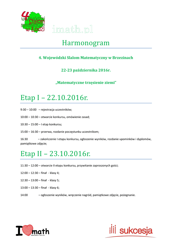 Harmonogram 4. Wojewódzki Slalom Matematyczny w Brzezinach 22-23 października 2016r. „Matematyczne trzęsienie ziemi” Etap I – 22.10.2016r. 9:30 – 10:00 – rejestracja uczestników; 10:00 – 10:30 – otwarcie konkursu, omówienie zasad; 10:30 – 15:00 – I etap konkursu; 15:00 – 16:30 – przerwa, rozdanie poczęstunku uczestnikom; 16:30 – zakończenie I etapu konkursu, ogłoszenie wyników, rozdanie upominków i dyplomów, pamiątkowe zdjęcie; Etap II – 23.10.2016r. 11:30 – 12:00 – otwarcie II etapu konkursu, przywitanie zaproszonych gości; 12:00 – 12:30 – finał - klasy 4; 12:30 – 13:00 – finał - klasy 5; 13:00 – 13:30 – finał - klasy 6; 14:00 – ogłoszenie wyników, wręczenie nagród, pamiątkowe zdjęcie, pożegnanie.