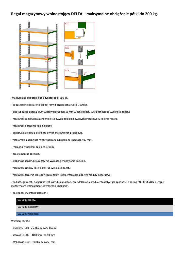 Regał magazynowy wolnostojący DELTA – maksymalne obciążenie półki do 200 kg. -maksymalne obciążenie pojedynczej półki 200 kg. - dopuszczalne obciążenie jednej ramy bocznej konstrukcji 1100 kg. - pięć lub sześć półek z płyty wiórowej grubości 16 mm w cenie regału (w zależności od wysokości regału) - możliwość zamówienia zamiennie stalowych półek malowanych proszkowo w kolorze regału, - możliwość dołożenia kolejnej półki, - konstrukcja regału z profili stalowych malowanych proszkowo, - maksymalna odległość między półkami lub półkami i podłogą 400 mm, - regulacja wysokości półek co 67 mm, - prosty montaż bez śrub, - stabilność konstrukcji, regały nie wymagają mocowania do ścian, - możliwość zmiany ilości półek lub wysokości regału, - możliwość łączenia szeregowego regałów i poszerzania ich poprzez moduły dodatkowe, - do każdego regału dołączana jest instrukcja montażu oraz deklaracja producenta dotycząca zgodności z normą PN-88/M-78321 „regały magazynowe wolnostojące. Wymagania i badania”. - dostępność w trzech kolorach ; RAL 9005 czarny, RAL 7035 popielaty, RAL 5005 niebieski, Wymiary regału: - wysokość 500 - 2500 mm, co 500 mm - szerokość 300 – 1000 mm, co 50 mm - głębokość 300 – 1000 mm, co 50 mm