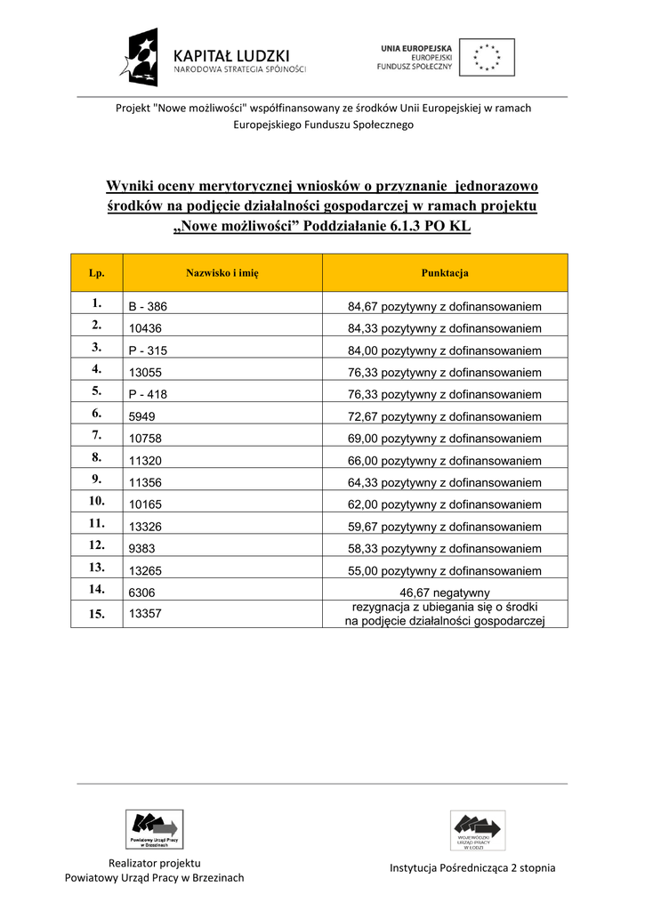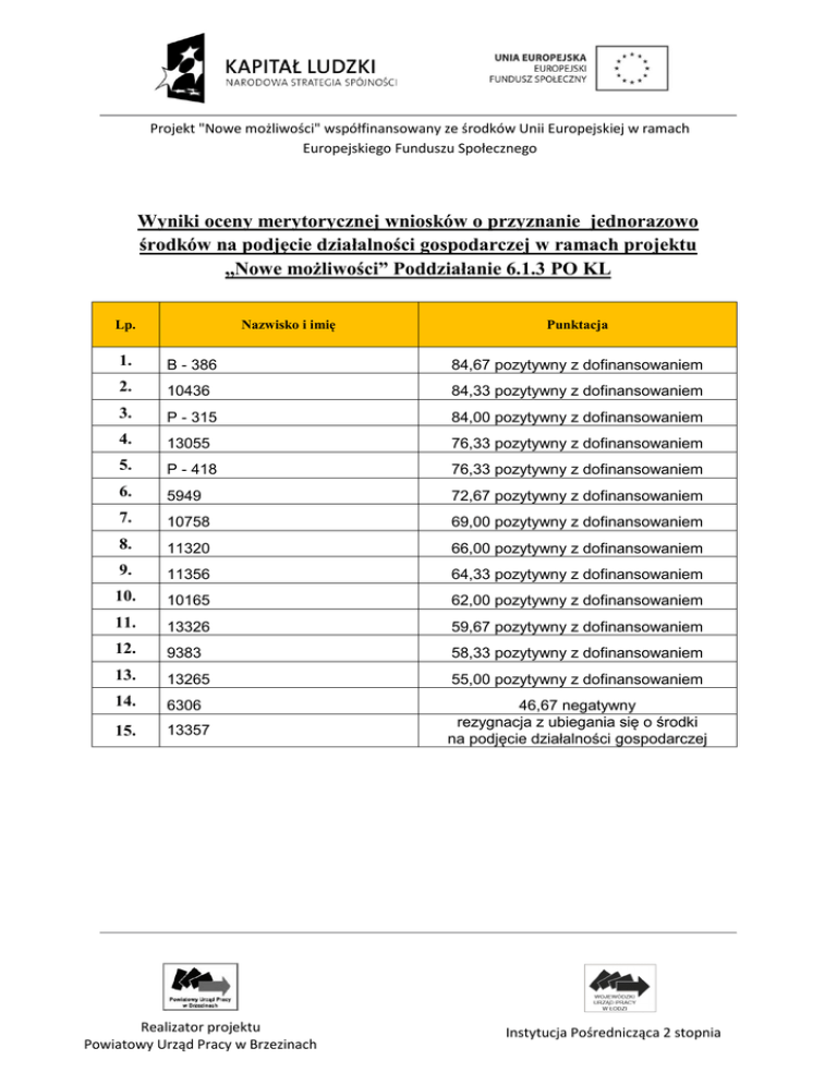 Projekt "Nowe możliwości" współfinansowany ze środków Unii Europejskiej w ramach Europejskiego Funduszu Społecznego Wyniki oceny merytorycznej wniosków o przyznanie jednorazowo środków na podjęcie działalności gospodarczej w ramach projektu ,,Nowe możliwości” Poddziałanie 6.1.3 PO KL Nazwisko i imię Lp. Punktacja 1. B - 386 84,67 pozytywny z dofinansowaniem 2. 10436 84,33 pozytywny z dofinansowaniem 3. P - 315 84,00 pozytywny z dofinansowaniem 4. 13055 76,33 pozytywny z dofinansowaniem 5. P - 418 76,33 pozytywny z dofinansowaniem 6. 5949 72,67 pozytywny z dofinansowaniem 7. 10758 69,00 pozytywny z dofinansowaniem 8. 11320 66,00 pozytywny z dofinansowaniem 9. 11356 64,33 pozytywny z dofinansowaniem 10. 10165 62,00 pozytywny z dofinansowaniem 11. 13326 59,67 pozytywny z dofinansowaniem 12. 9383 58,33 pozytywny z dofinansowaniem 13. 13265 55,00 pozytywny z dofinansowaniem 14. 6306 15. 13357 46,67 negatywny rezygnacja z ubiegania się o środki na podjęcie działalności gospodarczej Realizator projektu Powiatowy Urząd Pracy w Brzezinach Instytucja Pośrednicząca 2 stopnia