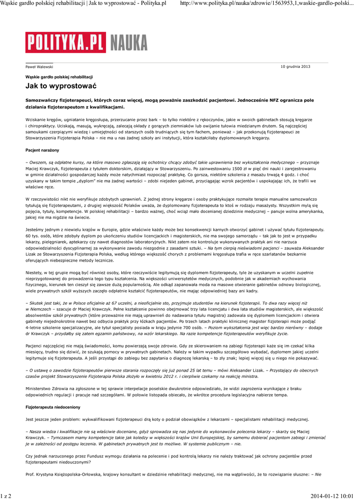 Wąskie gardło polskiej rehabilitacji | Jak to wyprostować - Polityka.pl 1z2 http://www.polityka.pl/nauka/zdrowie/1563953,1,waskie-gardlo-polski... Paweł Walewski 10 grudnia 2013 Wąskie gardło polskiej rehabilitacji Jak to wyprostować Samozwańczy fizjoterapeuci, których coraz więcej, mogą poważnie zaszkodzić pacjentowi. Jednocześnie NFZ ogranicza pole działania fizjoterapeutom z kwalifikacjami. Wciskanie kręgów, ugniatanie kręgosłupa, przerzucanie przez bark – to tylko niektóre z rękoczynów, jakie w swoich gabinetach stosują kręgarze i chiropraktycy. Uciskają, masują, wykręcają, zalecają okłady z gorących ziemniaków lub owijanie tułowia miedzianym drutem. Są najczęściej samoukami czerpiącymi wiedzę i umiejętności od starszych osób trudniących się tym fachem, ponieważ – jak przekonują fizjoterapeuci ze Stowarzyszenia Fizjoterapia Polska – nie ma u nas żadnej szkoły ani instytucji, która kształciłaby dyplomowanych kręgarzy. Pacjent narażony – Owszem, są odpłatne kursy, na które masowo zgłaszają się ochotnicy chcący zdobyć takie uprawnienia bez wykształcenia medycznego – przyznaje Maciej Krawczyk, fizjoterapeuta z tytułem doktorskim, działający w Stowarzyszeniu. Po zainwestowaniu 1500 zł w pięć dni nauki i zarejestrowaniu w gminie działalności gospodarczej każdy może natychmiast rozpocząć praktykę. Co gorsza, niektóre szkolenia z masażu trwają 4 godz. i choć uzyskany w takim tempie „dyplom” nie ma żadnej wartości – zdobi niejeden gabinet, przyciągając wzrok pacjentów i uspokajając ich, że trafili we właściwe ręce. W rzeczywistości nikt nie weryfikuje zdobytych uprawnień. Z jednej strony kręgarze i osoby praktykujące rozmaite terapie manualne samozwańczo tytułują się fizjoterapeutami, z drugiej większość Polaków uważa, że dyplomowany fizjoterapeuta to ktoś w rodzaju masażysty. Wszystkim mylą się pojęcia, tytuły, kompetencje. W polskiej rehabilitacji – bardzo ważnej, choć wciąż mało docenianej dziedzinie medycznej – panuje wolna amerykanka, jakiej nie ma nigdzie na świecie. Jesteśmy jednym z niewielu krajów w Europie, gdzie właściwie każdy może bez konsekwencji karnych otworzyć gabinet i używać tytułu fizjoterapeuty. 60 tys. osób, które zdobyły dyplom po ukończeniu studiów licencjackich i magisterskich, nie ma swojego samorządu – tak jak to jest w przypadku lekarzy, pielęgniarek, aptekarzy czy nawet diagnostów laboratoryjnych. Nikt zatem nie kontroluje wykonywanych praktyk ani nie narzuca odpowiedzialności dyscyplinarnej za wykonywanie zawodu niezgodnie z zasadami sztuki. – Na tym cierpią nieświadomi pacjenci – zauważa Aleksander Lizak ze Stowarzyszenia Fizjoterapia Polska, według którego większość chorych z problemami kręgosłupa trafia w ręce szarlatanów bezkarnie oferujących niebezpieczne metody lecznicze. Niestety, w tej grupie mogą być również osoby, które rzeczywiście legitymują się dyplomem fizjoterapeuty, tyle że uzyskanym w uczelni zupełnie nieprzygotowanej do prowadzenia tego typu kształcenia. Na większości uniwersytetów medycznych, podobnie jak w akademiach wychowania fizycznego, kierunek ten cieszył się zawsze dużą popularnością. Ale odkąd zapanowała moda na masowe otwieranie gabinetów odnowy biologicznej, wiele prywatnych szkół wyższych zaczęło odpłatnie kształcić fizjoterapeutów, nie mając odpowiedniej bazy ani kadry. – Skutek jest taki, że w Polsce oficjalnie aż 67 uczelni, a nieoficjalnie sto, przyjmuje studentów na kierunek fizjoterapii. To dwa razy więcej niż w Niemczech – szacuje dr Maciej Krawczyk. Pełne kształcenie powinno obejmować trzy lata licencjatu i dwa lata studiów magisterskich, ale większość absolwentów szkół prywatnych (które przeważnie nie mają uprawnień do nadawania tytułu magistra) zadowala się dyplomem licencjackim i otwiera gabinety niejednokrotnie nawet bez odbycia praktyk przy łóżkach pacjentów. Po trzech latach praktyki klinicznej magister fizjoterapii może podjąć 4-letnie szkolenie specjalizacyjne, ale tytuł specjalisty posiada w kraju jedynie 700 osób. – Poziom wykształcenia jest więc bardzo nierówny – dodaje dr Krawczyk – przydałby się zatem egzamin państwowy, na wzór lekarskiego. Na razie kompetencje fizjoterapeutów weryfikuje życie. Pacjenci najczęściej nie mają świadomości, komu powierzają swoje zdrowie. Gdy ze skierowaniem na zabiegi fizjoterapii każe się im czekać kilka miesięcy, trudno się dziwić, że szukają pomocy w prywatnych gabinetach. Należy w takim wypadku szczegółowo wybadać, dyplomem jakiej uczelni legitymuje się fizjoterapeuta. A jeśli przystąpi do zabiegu bez zapytania o diagnozę lekarską – to zły znak; lepiej więcej się u niego nie pokazywać. – O ustawę o zawodzie fizjoterapeutów pierwsze starania rozpoczęły się już ponad 25 lat temu – mówi Aleksander Lizak. – Przystający do obecnych czasów projekt Stowarzyszenie Fizjoterapia Polska złożyło w kwietniu 2012 r. i cierpliwie czekamy na reakcję ministra. Ministerstwo Zdrowia na zgłoszone w tej sprawie interpelacje poselskie dwukrotnie odpowiedziało, że widzi zagrożenia wynikające z braku odpowiednich regulacji i pracuje nad szczegółami. W połowie listopada obiecało, że wkrótce procedura legislacyjna nabierze tempa. Fizjoterapeuta niedoceniony Jest jeszcze jeden problem: wykwalifikowani fizjoterapeuci drą koty o podział obowiązków z lekarzami – specjalistami rehabilitacji medycznej. – Nasza wiedza i kwalifikacje nie są właściwie doceniane, gdyż sprowadza się nas jedynie do wykonawców polecenia lekarzy – skarży się Maciej Krawczyk. – Tymczasem mamy kompetencje takie jak koledzy w większości krajów Unii Europejskiej, by samemu dobierać pacjentom zabiegi i zmieniać je w zależności od postępu leczenia. W gabinetach prywatnych jest to możliwe. W systemie public