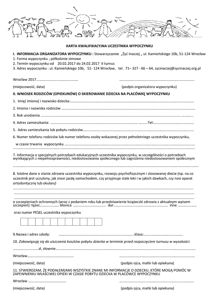 KARTA KWALIFIKACYJNA UCZESTNIKA WYPOCZYNKU I. INFORMACJA ORGANIZATORA WYPOCZYNKU : Stowarzyszenie „Żyć Inaczej „ ul. Kamieńskiego 10b, 51-124 Wrocław 1. Forma wypoczynku ; półkolonie zimowe 2. Termin wypoczynku od 20.02.2017 do 24.02.2017 II turnus 3. Adres wypoczynku : ul. Kamieńskiego 10b, 51- 124 Wrocław, tel. 71– 327 - 66 – 64, [email protected] Wrocław 2017.……………………………………… (miejscowość, data) …………………………………………………………………….... (podpis organizatora wypoczynku) II. WNIOSEK RODZICÓW (OPIEKUNÓW) O SKIEROWANIE DZIECKA NA PLACÓWKĘ WYPOCZYNKU 1. Imię( imiona) i nazwisko dziecka:………………………………………………………………………………………………………………………. 2. Imiona i nazwiska rodziców ………………………………………………………………………………………………………………………………… 3. Rok urodzenia ............................................................................................................................................. …..…….. 4. Adres zamieszkania: ........................................................................................ ……….Tel:……………………………..…..…. 5. Adres zamieszkania lub pobytu rodziców………………………………………………………………………………………………………….. 6. Numer telefonu rodziców lub numer telefonu osoby wskazanej przez pełnoletniego uczestnika wypoczynku, w czasie trwania wypoczynku …………………….……………………………………………………………..……………………………………..… ………………………………………………………………………………………………………………………………….………………………………….………… 7. Informacja o specjalnych potrzebach edukacyjnych uczestnika wypoczynku, w szczególności o potrzebach wynikających z niepełnosprawności, niedostosowania społecznego lub zagrożenia niedostosowaniem społecznym …………………………………………………………………………………………………………………………………………………………………………………… 8. Istotne dane o stanie zdrowia uczestnika wypoczynku, rozwoju psychofizycznym i stosowanej diecie (np. na co uczestnik jest uczulony, jak znosi jazdę samochodem, czy przyjmuje stale leki i w jakich dawkach, czy nosi aparat ortodontyczny lub okulary) ..................................................................................................................................................................................... ..................................................................................................................................................................................... ..................................................................................................................................................................................... o szczepieniach ochronnych (wraz z podaniem roku lub przedstawienie książeczki zdrowia z aktualnym wpisem szczepień): tężec………………… błonica ……………………………… dur…………………………………………………… inne ………………… oraz numer PESEL uczestnika wypoczynku 9.Nazwa i adres szkoły: ………………………………………………………………………..klasa:…………………………..……….. 10. Zobowiązuję się do uiszczenia kosztów pobytu dziecka w terminie przed rozpoczęciem turnusu w wysokości: ……………………….zł, słownie:………………………………………………………………………………………………………………………….………….. Wrocław…………………………………………… (miejscowość, data) …………………………………………………………….…………. (podpis ojca, matki lub opiekuna) 11. STWIERDZAM, ŻE PODAŁEM(AM) WSZYSTKIE ZNANE MI INFORMACJE O DZIECKU, KTÓRE MOGĄ POMÓC W ZAPEWNIENIU WŁAŚCIWEJ OPIEKI W CZASIE POBYTU DZIECKA W PLACÓWCE WYPOCZYNKU Wrocław …………………………………… (miejscowość, data) ………………………………………………………………………. (podpis ojca, matki lub opiekuna) Wyrażam zgodę na przetwarzanie danych osobowych zawartych w karcie kwalifikacyjnej na potrzeby niezbędne do zapewnienia bezpieczeństwa i ochrony zdrowia uczestnika wypoczynku (zgodnie z ustawą z dnia 29 sierpnia 1997 r. o ochronie danych osobowych (Dz. U. z 2015 r. poz. 2135, z późn. zm.)). Wrocław …………………………………… (miejscowość, data) ………………………………………………………………………. (podpis ojca, matki lub opiekuna) Dziecko będzie samodzielnie opuszczać zajęcia*/ będzie odbierane przez rodzica lub opiekuna* Wrocław …………………………………… ………………………………………………………………………. (Miejscowość, data) *niepotrzebne skreślić (podpis rodzica - opiekuna) Wyrażam zgodę na nieodpłatne prawa wielokrotnego wykorzystywania zdjęć z wizerunkiem mojego dziecka, uczestniczącego w półkoloniach zimowych.( informujemy, że dotyczy wykonania zdjęć podczas zajęć i wykorzystania ich na potrzeby działalności statutową np. zamieszczenie na naszej stronie internetowej. (Miejscowość, data) (podpis rodzica - opiekuna)………………..…………………………………. DEKLARACJA UCZESTNIKA : będąc na półkolonii zobowiązuję się do przestrzegania obowiązujących regulaminów oraz włączenia się do realizacji programu : ( prosimy aby uczestnik podpisał się prz