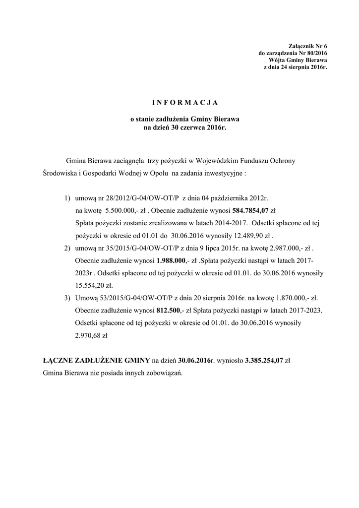 Załącznik Nr 6 do zarządzenia Nr 80/2016 Wójta Gminy Bierawa z dnia 24 sierpnia 2016r. INFORMACJA o stanie zadłużenia Gminy Bierawa na dzień 30 czerwca 2016r. Gmina Bierawa zaciągnęła trzy pożyczki w Wojewódzkim Funduszu Ochrony Środowiska i Gospodarki Wodnej w Opolu na zadania inwestycyjne : 1) umową nr 28/2012/G-04/OW-OT/P z dnia 04 października 2012r. na kwotę 5.500.000,- zł . Obecnie zadłużenie wynosi 584.7854,07 zł Spłata pożyczki zostanie zrealizowana w latach 2014-2017. Odsetki spłacone od tej pożyczki w okresie od 01.01 do 30.06.2016 wynosiły 12.489,90 zł . 2) umową nr 35/2015/G-04/OW-OT/P z dnia 9 lipca 2015r. na kwotę 2.987.000,- zł . Obecnie zadłużenie wynosi 1.988.000,- zł .Spłata pożyczki nastąpi w latach 20172023r . Odsetki spłacone od tej pożyczki w okresie od 01.01. do 30.06.2016 wynosiły 15.554,20 zł. 3) Umową 53/2015/G-04/OW-OT/P z dnia 20 sierpnia 2016r. na kwotę 1.870.000,- zł. Obecnie zadłużenie wynosi 812.500,- zł Spłata pożyczki nastąpi w latach 2017-2023. Odsetki spłacone od tej pożyczki w okresie od 01.01. do 30.06.2016 wynosiły 2.970,68 zł ŁĄCZNE ZADŁUŻENIE GMINY na dzień 30.06.2016r. wyniosło 3.385.254,07 zł Gmina Bierawa nie posiada innych zobowiązań.