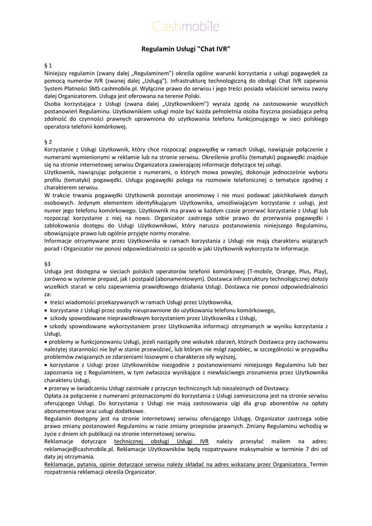 Regulamin Usługi "Chat IVR" §1 Niniejszy regulamin (zwany dalej „Regulaminem”) określa ogólne warunki korzystania z usługi pogawędek za pomocą numerów IVR (zwanej dalej „Usługą”). Infrastrukturę technologiczną do obsługi Chat IVR zapewnia System Płatności SMS cashmobile.pl. Wyłączne prawo do serwisu i jego treści posiada właściciel serwisu zwany dalej Organizatorem. Usługa jest oferowana na terenie Polski. Osoba korzystająca z Usługi (zwana dalej „Użytkownikiem”) wyraża zgodę na zastosowanie wszystkich postanowień Regulaminu. Użytkownikiem usługi może być każda pełnoletnia osoba fizyczna posiadająca pełną zdolność do czynności prawnych uprawniona do użytkowania telefonu funkcjonującego w sieci polskiego operatora telefonii komórkowej. §2 Korzystanie z Usługi Użytkownik, który chce rozpocząć pogawędkę w ramach Usługi, nawiązuje połączenie z numerami wymienionymi w reklamie lub na stronie serwisu. Określenie profilu (tematyki) pogawędki znajduje się na stronie internetowej serwisu Organizatora zawierającej informacje dotyczące tej usługi. Użytkownik, nawiązując połączenie z numerami, o których mowa powyżej, dokonuje jednocześnie wyboru profilu (tematyki) pogawędki. Usługa pogawędki polega na rozmowie telefonicznej o tematyce zgodnej z charakterem serwisu. W trakcie trwania pogawędki Użytkownik pozostaje anonimowy i nie musi podawać jakichkolwiek danych osobowych. Jedynym elementem identyfikującym Użytkownika, umożliwiającym korzystanie z usługi, jest numer jego telefonu komórkowego. Użytkownik ma prawo w każdym czasie przerwać korzystanie z Usługi lub rozpocząć korzystanie z niej na nowo. Organizator zastrzega sobie prawo do przerwania pogawędki i zablokowania dostępu do Usługi Użytkownikowi, który narusza postanowienia niniejszego Regulaminu, obowiązujące prawo lub ogólnie przyjęte normy moralne. Informacje otrzymywane przez Użytkownika w ramach korzystania z Usługi nie mają charakteru wiążących porad i Organizator nie ponosi odpowiedzialności za sposób w jaki Użytkownik wykorzysta te informacje. §3 Usługa jest dostępna w sieciach polskich operatorów telefonii komórkowej (T-mobile, Orange, Plus, Play), zarówno w systemie prepaid, jak i postpaid (abonamentowym). Dostawca infrastruktury technologicznej dołoży wszelkich starań w celu zapewnienia prawidłowego działania Usługi. Dostawca nie ponosi odpowiedzialności za: treści wiadomości przekazywanych w ramach Usługi przez Użytkownika, korzystanie z Usługi przez osoby nieuprawnione do użytkowania telefonu komórkowego, szkody spowodowane nieprawidłowym korzystaniem przez Użytkownika z Usługi, szkody spowodowane wykorzystaniem przez Użytkownika informacji otrzymanych w wyniku korzystania z Usługi, problemy w funkcjonowaniu Usługi, jeżeli nastąpiły one wskutek zdarzeń, których Dostawca przy zachowaniu należytej staranności nie był w stanie przewidzieć, lub którym nie mógł zapobiec, w szczególności w przypadku problemów związanych ze zdarzeniami losowymi o charakterze siły wyższej, korzystanie z Usługi przez Użytkowników niezgodnie z postanowieniami niniejszego Regulaminu lub bez zapoznania się z Regulaminem, w tym zwłaszcza wynikające z niewłaściwego zrozumienia przez Użytkownika charakteru Usługi, przerwy w świadczeniu Usługi zaistniałe z przyczyn technicznych lub niezależnych od Dostawcy. Opłata za połączenie z numerami przeznaczonymi do korzystania z Usługi zamieszczona jest na stronie serwisu oferującego Usługi. Do korzystania z Usługi nie mają zastosowania ulgi dla grup abonentów na opłaty abonamentowe oraz usługi dodatkowe. Regulamin dostępny jest na stronie internetowej serwisu oferującego Usługę. Organizator zastrzega sobie prawo zmiany postanowień Regulaminu w razie zmiany przepisów prawnych. Zmiany Regulaminu wchodzą w życie z dniem ich publikacji na stronie internetowej serwisu. Reklamacje dotyczące technicznej obsługi Usługi IVR należy przesyłać mailem na adres: [email protected]. Reklamacje Użytkowników będą rozpatrywane maksymalnie w terminie 7 dni od daty jej otrzymania. Reklamacje, pytania, opinie dotyczące serwisu należy składać na adres wskazany przez Organizatora. Termin rozpatrzenia reklamacji określa Organizator.