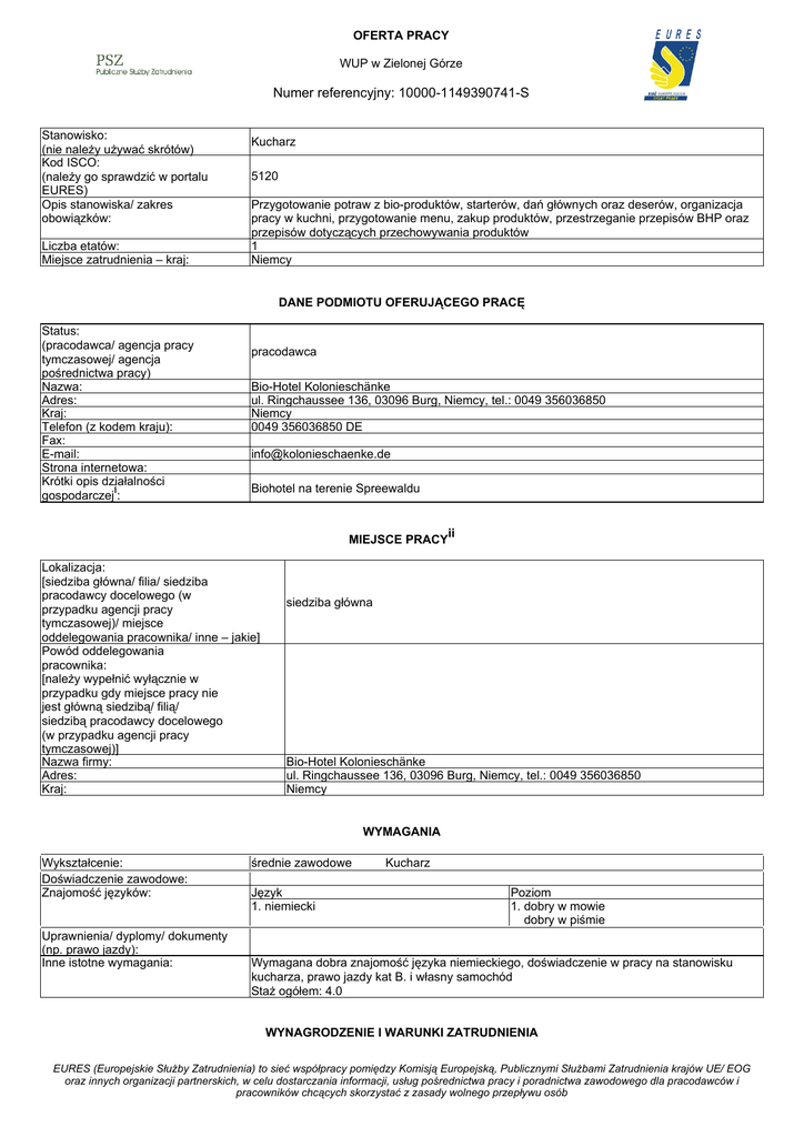 OFERTA PRACY WUP w Zielonej Górze Numer referencyjny: 10000-1149390741-S Stanowisko: (nie należy używać skrótów) Kod ISCO: (należy go sprawdzić w portalu EURES) Opis stanowiska/ zakres obowiązków: Liczba etatów: Miejsce zatrudnienia – kraj: Kucharz 5120 Przygotowanie potraw z bio-produktów, starterów, dań głównych oraz deserów, organizacja pracy w kuchni, przygotowanie menu, zakup produktów, przestrzeganie przepisów BHP oraz przepisów dotyczących przechowywania produktów 1 Niemcy DANE PODMIOTU OFERUJĄCEGO PRACĘ Status: (pracodawca/ agencja pracy tymczasowej/ agencja pośrednictwa pracy) Nazwa: Adres: Kraj: Telefon (z kodem kraju): Fax: E-mail: Strona internetowa: Krótki opis działalności gospodarczeji: pracodawca Bio-Hotel Kolonieschänke ul. Ringchaussee 136, 03096 Burg, Niemcy, tel.: 0049 356036850 Niemcy 0049 356036850 DE [email protected] Biohotel na terenie Spreewaldu MIEJSCE PRACYii Lokalizacja: [siedziba główna/ filia/ siedziba pracodawcy docelowego (w przypadku agencji pracy tymczasowej)/ miejsce oddelegowania pracownika/ inne – jakie] Powód oddelegowania pracownika: [należy wypełnić wyłącznie w przypadku gdy miejsce pracy nie jest główną siedzibą/ filią/ siedzibą pracodawcy docelowego (w przypadku agencji pracy tymczasowej)] Nazwa firmy: Adres: Kraj: siedziba główna Bio-Hotel Kolonieschänke ul. Ringchaussee 136, 03096 Burg, Niemcy, tel.: 0049 356036850 Niemcy WYMAGANIA Wykształcenie: Doświadczenie zawodowe: Znajomość języków: Uprawnienia/ dyplomy/ dokumenty (np. prawo jazdy): Inne istotne wymagania: średnie zawodowe Język 1. niemiecki Kucharz Poziom 1. dobry w mowie dobry w piśmie Wymagana dobra znajomość języka niemieckiego, doświadczenie w pracy na stanowisku kucharza, prawo jazdy kat B. i własny samochód Staż ogółem: 4.0 WYNAGRODZENIE I WARUNKI ZATRUDNIENIA EURES (Europejskie Służby Zatrudnienia) to sieć współpracy pomiędzy Komisją Europejską, Publicznymi Służbami Zatrudnienia krajów UE/ EOG oraz innych organizacji partnerskich, w celu dostarczania informacji, usług pośrednictwa pracy i poradnictwa zawodowego dla pracodawców i pracowników chcących skorzystać z zasady wolnego przepływu osób Wysokość pensji brutto: Wysokość pensji netto: Waluta, w jakiej wypłacana jest pensja: Rodzaj stawki wynagrodzenia: (godzinowa/ tygodniowa/ miesięczna/ roczna/ inna) Premie: Dodatkowe świadczenia (zakwaterowanie, wyżywienie, koszty związane ze zmianą miejsca zamieszkania, koszty podróży itp.): Nazwa firmy, z którą zostanie podpisana umowa: Rodzaj umowy: (umowa o pracę, umowa zlecenia, wolontariat, praktyka zawodowa/ staż, praca zdalna, agencja pracy tymczasowej, inne): Wymiar czasu pracy (praca na pełen etat/ część etatu): Czas trwania umowy: (nieokreślony/ określony) 8,84 Liczba godzin tygodniowo: Zmiany i praca w dni wolne: Data rozpoczęcia: Inne informacje: 40,00 Praca w systemie zmianowym, od poniedziałku do niedzieli od 12.00 do 22.00 2017-03-01 Istnieje możliwość podjęcia pracy w niepełnym wymiarze godzin Euro Czasowy ze stawką godzinową tak Pracodawca pomoże w znalezieniu zakwaterowania Bio-Hotel Kolonieschänke umowa o pracę pelny etat Data wygaśnięcia umowy (w przypadku umowy na czas określony): nieokreślony SPOSÓB SKŁADANIA WNIOSKU Wymagane dokumenty (list motywacyjny, CV itp.): Język, w którym muszą być sporządzone przedkładane dokumenty: Do kogo należy wysłać dokumenty: (do pracodawcy/ doradcy EURES) Gdzie należy wysłać dokumenty: (adres, adres e-mail, nr faksu z kodem kraju itp.) Dane teleadresowe doradcy EURES lub przedstawiciela pracodawcy: (nazwisko, adres, telefon, fax, e-mail itp.) CV ze zdjęciem niemiecki do pracodawcy drogą elektroniczną na adres [email protected] wpisując w tytule maila nazwę KOCH drogą elektroniczną na adres [email protected] wpisując w tytule maila nazwę KOCH DODATKOWE INFORMACJE Informacji w języku niemieckim udziela Pan Arnold 0049 356036850 WAŻNOŚĆ 2017-01-09 Data publikacji: Termin przedkładania podań o pracę / 2018-01-31 zakończenia ważności oferty: Uprzejmie informujemy, że skontaktujemy się wyłącznie z wybranymi kandydatami. UWAGA: 1. Umowa z zagranicznym pracodawcą jest zawierana, co do zasady, zgodnie z prawem kraju zatrudnienia. Oznacza to, że wszystkie roszczenia odnośnie warunków, które obejmuje umowa, można kierować wyłącznie do odpowiedniego sądu w kraju zatrudnienia. Publiczne służby zatrudnienia (EURES) nie mogą pośredniczyć ani reprezentować pracownika w sądzie kraju zatrudnienia w przypadku sporu z pracodawcą. 2. Publiczne służby zatrudnienia (EURES) dokładają wszelkich starań, aby zapewnić rzetelność i wiarygodność ofert pracy zgłoszonych w lokalnym urzędzie pracy. Należy wyjaśnić, że oferta pracy została zgłoszona przez stronę trzecią i EURES nie odpowiada za ewentualne rozbieżności między warunkami pracy określonymi w ofercie pracy i warunkami oferowanymi przez potencjalnego pracodawcę. 3. Publiczne służby zatrudnienia (EURES) informują, że będą zbierać, przetwarzać i przekazywać potencjalnym pracodawcom zgodnie z przepisami dotyczącymi ochrony danych osobowych wszystkie dane osobowe dostarczone przez osoby poszukujące pracy. iInformacje o firmie, takie jak: status prawny, sektor, typ działalności, rodzaj produktów lub świadczonych usług, data rozpoczęcia EURES (Europejskie Służby Zatrudnienia) to sieć współpracy pomiędzy Komisją Europejską, Publicznymi Służbami Zatrudnienia krajów UE/ EOG oraz innych organizacji partnerskich, w celu dostarczania informacji, usług pośrednictwa pracy i poradnictwa zawodowego dla pracodawców i pracowników chcących skorzystać z zasady wolnego przepływu osób działalności gospodarczej, liczba pracowników itp. iiMiejsce, w którym będzie wykonywana praca. Należy wypełnić w przypadku gdy: 1) miejsce wykonywania pracy jest inne niż siedziba podmiotu oferującego p