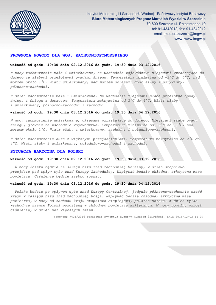 Instytut Meteorologii i Gospodarki Wodnej - Państwowy Instytut Badawczy Biuro Meteorologicznych Prognoz Morskich Wydział w Szczecinie 70-800 Szczecin ul. Przestrzenna 10 tel: 91-4342012, fax: 91-4342012 email: [email protected] www: www.imgw.pl PROGNOZA POGODY DLA WOJ. ZACHODNIOPOMORSKIEGO ważność od godz. 19:30 dnia 02.12.2016 do godz. 19:30 dnia 03.12.2016 W nocy zachmurzenie małe i umiarkowane, na wschodzie województwa miejscami wzrastające do dużego ze słabymi przelotnymi opadami śniegu. Temperatura minimalna od -2°C do 0°C, nad morzem około 1°C. Wiatr umiarkowany, nad morzem okresami dość silny i porywisty, północno-zachodni. W dzień zachmurzenie małe i umiarkowane. Na wschodzie miejscami słabe przelotne opady śniegu i śniegu z deszczem. Temperatura maksymalna od 2°C do 4°C. Wiatr słaby i umiarkowany, północno-zachodni i zachodni. ważność od godz. 19:30 dnia 03.12.2016 do godz. 19:30 dnia 04.12.2016 W nocy zachmurzenie umiarkowane, okresami wzrastające do dużego. Miejscami słabe opady śniegu, głównie na wschodzie województwa. Temperatura minimalna od -3°C do -1°C, nad morzem około 1°C. Wiatr słaby i umiarkowany, zachodni i południowo-zachodni. W dzień zachmurzenie duże z większymi przejaśnieniami. Temperatura maksymalna od 2°C do 4°C. Wiatr słaby i umiarkowany, południowo-zachodni i zachodni. SYTUACJA BARYCZNA DLA POLSKI ważność od godz. 19:30 dnia 02.12.2016 do godz. 19:30 dnia 03.12.2016 W nocy Polska będzie na skraju niżu znad zachodniej Ukrainy, w dzień stopniowo przejdzie pod wpływ wyżu znad Europy Zachodniej. Napływać będzie chłodna, arktyczna masa powietrza. Ciśnienie będzie szybko rosnąć. ważność od godz. 19:30 dnia 03.12.2016 do godz. 19:30 dnia 04.12.2016 Polska będzie po wpływem wyżu znad Europy Centralnej, jedynie północno-wschodnia część kraju w zasięgu niżu znad Zachodniej Rosji. Napływać będzie chłodna, arktyczna masa powietrza, w nocy od zachodu kraju stopniowo cieplejsza, polarno-morska. W dzień tylko wschodnie krańce Polski pozostaną w chłodnym powietrzu arktycznym. W nocy powolny wzrost ciśnienia, w dzień bez większych zmian. prognozę 7421/2016 opracował synoptyk dyżurny Ryszard Śliwiński, dnia 2016-12-02 11:37