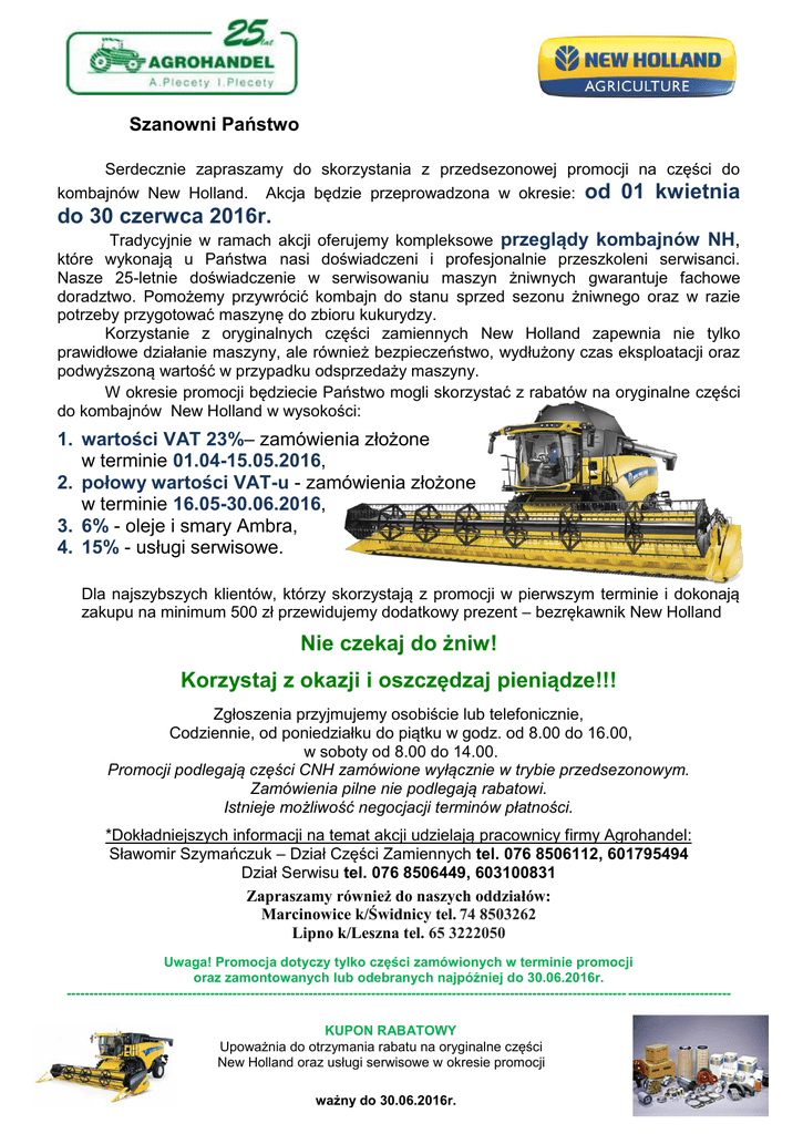 Szanowni Państwo Serdecznie zapraszamy do skorzystania z przedsezonowej promocji na części do kombajnów New Holland. Akcja będzie przeprowadzona w okresie: od 01 kwietnia do 30 czerwca 2016r. Tradycyjnie w ramach akcji oferujemy kompleksowe przeglądy kombajnów NH, które wykonają u Państwa nasi doświadczeni i profesjonalnie przeszkoleni serwisanci. Nasze 25-letnie doświadczenie w serwisowaniu maszyn żniwnych gwarantuje fachowe doradztwo. Pomożemy przywrócić kombajn do stanu sprzed sezonu żniwnego oraz w razie potrzeby przygotować maszynę do zbioru kukurydzy. Korzystanie z oryginalnych części zamiennych New Holland zapewnia nie tylko prawidłowe działanie maszyny, ale również bezpieczeństwo, wydłużony czas eksploatacji oraz podwyższoną wartość w przypadku odsprzedaży maszyny. W okresie promocji będziecie Państwo mogli skorzystać z rabatów na oryginalne części do kombajnów New Holland w wysokości: 1. wartości VAT 23%– zamówienia złożone w terminie 01.04-15.05.2016, 2. połowy wartości VAT-u - zamówienia złożone w terminie 16.05-30.06.2016, 3. 6% - oleje i smary Ambra, 4. 15% - usługi serwisowe. Dla najszybszych klientów, którzy skorzystają z promocji w pierwszym terminie i dokonają zakupu na minimum 500 zł przewidujemy dodatkowy prezent – bezrękawnik New Holland Nie czekaj do żniw! Korzystaj z okazji i oszczędzaj pieniądze!!! Zgłoszenia przyjmujemy osobiście lub telefonicznie, Codziennie, od poniedziałku do piątku w godz. od 8.00 do 16.00, w soboty od 8.00 do 14.00. Promocji podlegają części CNH zamówione wyłącznie w trybie przedsezonowym. Zamówienia pilne nie podlegają rabatowi. Istnieje możliwość negocjacji terminów płatności. *Dokładniejszych informacji na temat akcji udzielają pracownicy firmy Agrohandel: Sławomir Szymańczuk – Dział Części Zamiennych tel. 076 8506112, 601795494 Dział Serwisu tel. 076 8506449, 603100831 Zapraszamy również do naszych oddziałów: Marcinowice k/Świdnicy tel. 74 8503262 Lipno k/Leszna tel. 65 3222050 Uwaga! Promocja dotyczy tylko części zamówionych w terminie promocji oraz zamontowanych lub odebranych najpóźniej do 30.06.2016r. ----------------------------------------------------------------------------------------------------------------------------- ----------------------KUPON RABATOWY Upoważnia do otrzymania rabatu na oryginalne części New Holland oraz usługi serwisowe w okresie promocji ważny do 30.06.2016r.
