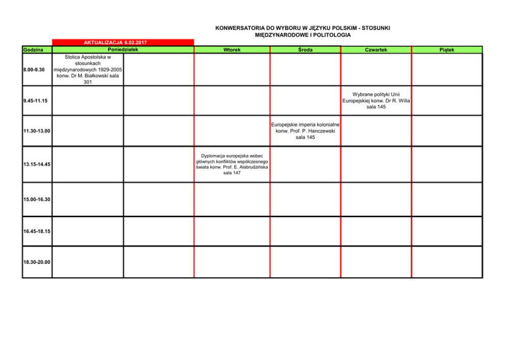 KONWERSATORIA DO WYBORU W JĘZYKU POLSKIM - STOSUNKI MIĘDZYNARODOWE I POLITOLOGIA Godzina 8.00-9.30 AKTUALIZACJA 6.02.2017 Poniedziałek Wtorek Środa Wybrane polityki Unii Europejskiej konw. Dr R. Willa sala 145 9.45-11.15 Europejskie imperia kolonialne konw. Prof. P. Hanczewski sala 145 11.30-13.00 13.15-14.45 15.00-16.30 16.45-18.15 18.30-20.00 Czwartek Stolica Apostolska w stosunkach międzynarodowych 1929-2005 konw. Dr M. Białkowski sala 301 Dyplomacja europejska wobec głównych konfliktów współczesnego świata konw. Prof. E. Alabrudzińska sala 147 Piątek