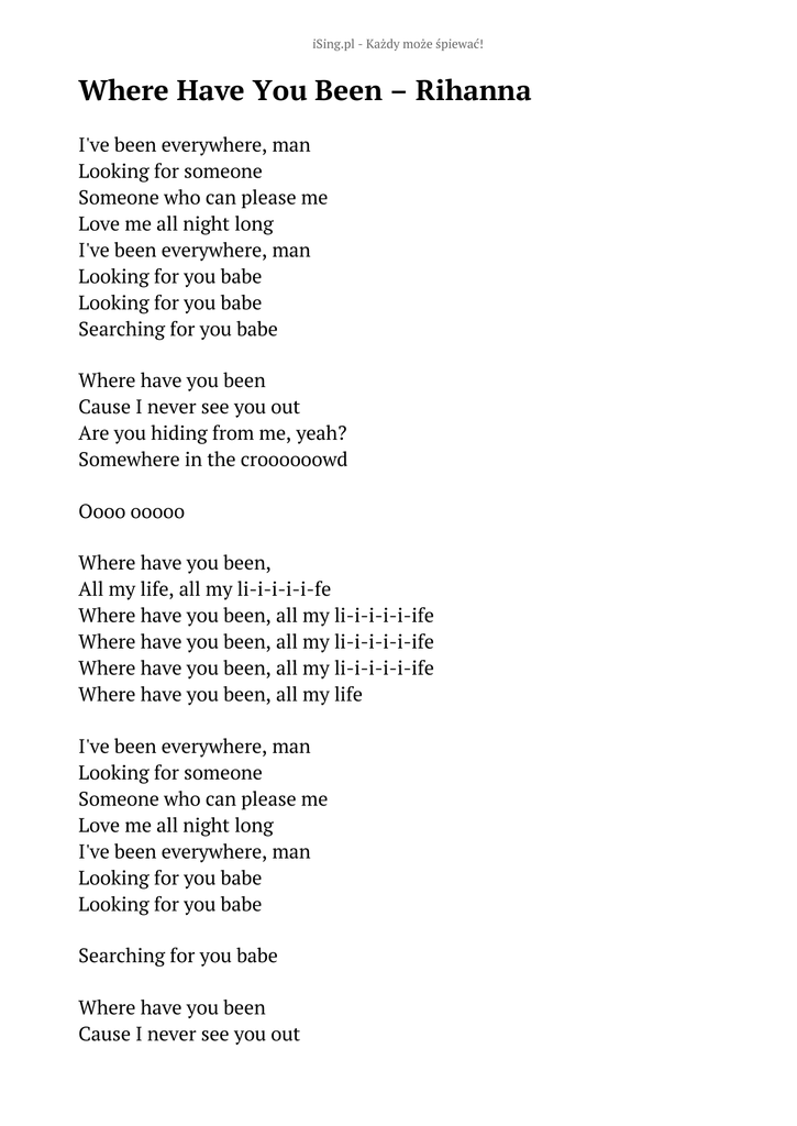 iSing.pl - Każdy może śpiewać! Where Have You Been – Rihanna I've been everywhere, man Looking for someone Someone who can please me Love me all night long I've been everywhere, man Looking for you babe Looking for you babe Searching for you babe Where have you been Cause I never see you out Are you hiding from me, yeah? Somewhere in the croooooowd Oooo ooooo Where have you been, All my life, all my li-i-i-i-i-fe Where have you been, all my li-i-i-i-i-ife Where have you been, all my li-i-i-i-i-ife Where have you been, all my li-i-i-i-i-ife Where have you been, all my life I've been everywhere, man Looking for someone Someone who can please me Love me all night long I've been everywhere, man Looking for you babe Looking for you babe Searching for you babe Where have you been Cause I never see you out Are you hiding from me, yeah? Somewhere in the croooooowd Oooo ooooo Where have you been, All my life, all my li-i-i-i-i-fe Where have you been, all my li-i-i-i-i-ife Where have you been, all my li-i-i-i-i-ife Where have you been, all my li-i-i-i-i-ife Where have you been, all my li-i-i-i-i-ife Where have you been, all my li-i-i-i-i-ife You can have me all you want Any way, any day To show me where you are tonight Ooooo Yeaaaahh Ooo I've been everywhere, man Looking for someone Someone who can please me Love me all night long I've been everywhere, man Looking for you babe Looking for you babe Searching for you babe Słowa: Ester Dean, Lukasz Gottwald, Calvin Harris, Geoff Mack Muzyka: Ester Dean, Lukasz Gottwald, Calvin Harris, Geoff Mack Rok wydania: 2011 Płyta: Talk That Talk