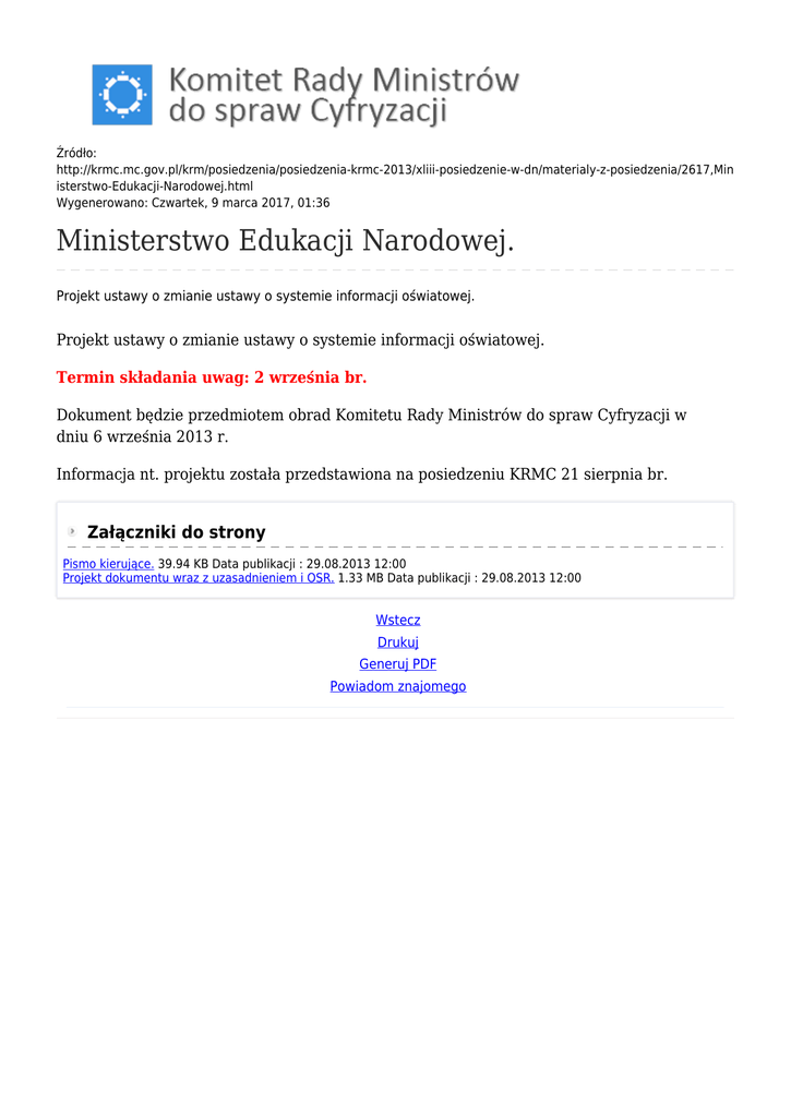Źródło: http://krmc.mc.gov.pl/krm/posiedzenia/posiedzenia-krmc-2013/xliii-posiedzenie-w-dn/materialy-z-posiedzenia/2617,Min isterstwo-Edukacji-Narodowej.html Wygenerowano: Czwartek, 9 marca 2017, 01:36 Ministerstwo Edukacji Narodowej. Projekt ustawy o zmianie ustawy o systemie informacji oświatowej. Projekt ustawy o zmianie ustawy o systemie informacji oświatowej. Termin składania uwag: 2 września br. Dokument będzie przedmiotem obrad Komitetu Rady Ministrów do spraw Cyfryzacji w dniu 6 września 2013 r. Informacja nt. projektu została przedstawiona na posiedzeniu KRMC 21 sierpnia br. Załączniki do strony Pismo kierujące. 39.94 KB Data publikacji : 29.08.2013 12:00 Projekt dokumentu wraz z uzasadnieniem i OSR. 1.33 MB Data publikacji : 29.08.2013 12:00 Wstecz Drukuj Generuj PDF Powiadom znajomego