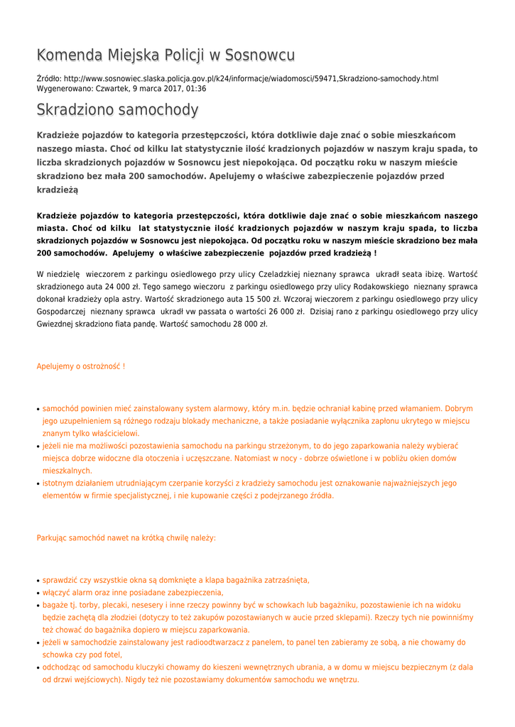 Komenda Miejska Policji w Sosnowcu Źródło: http://www.sosnowiec.slaska.policja.gov.pl/k24/informacje/wiadomosci/59471,Skradziono-samochody.html Wygenerowano: Czwartek, 9 marca 2017, 01:36 Skradziono samochody Kradzieże pojazdów to kategoria przestępczości, która dotkliwie daje znać o sobie mieszkańcom naszego miasta. Choć od kilku lat statystycznie ilość kradzionych pojazdów w naszym kraju spada, to liczba skradzionych pojazdów w Sosnowcu jest niepokojąca. Od początku roku w naszym mieście skradziono bez mała 200 samochodów. Apelujemy o właściwe zabezpieczenie pojazdów przed kradzieżą Kradzieże pojazdów to kategoria przestępczości, która dotkliwie daje znać o sobie mieszkańcom naszego miasta. Choć od kilku lat statystycznie ilość kradzionych pojazdów w naszym kraju spada, to liczba skradzionych pojazdów w Sosnowcu jest niepokojąca. Od początku roku w naszym mieście skradziono bez mała 200 samochodów. Apelujemy o właściwe zabezpieczenie pojazdów przed kradzieżą ! W niedzielę wieczorem z parkingu osiedlowego przy ulicy Czeladzkiej nieznany sprawca ukradł seata ibizę. Wartość skradzionego auta 24 000 zł. Tego samego wieczoru z parkingu osiedlowego przy ulicy Rodakowskiego nieznany sprawca dokonał kradzieży opla astry. Wartość skradzionego auta 15 500 zł. Wczoraj wieczorem z parkingu osiedlowego przy ulicy Gospodarczej nieznany sprawca ukradł vw passata o wartości 26 000 zł. Dzisiaj rano z parkingu osiedlowego przy ulicy Gwiezdnej skradziono fiata pandę. Wartość samochodu 28 000 zł. Apelujemy o ostrożność ! ● samochód powinien mieć zainstalowany system alarmowy, który m.in. będzie ochraniał kabinę przed włamaniem. Dobrym jego uzupełnieniem są różnego rodzaju blokady mechaniczne, a także posiadanie wyłącznika zapłonu ukrytego w miejscu znanym tylko właścicielowi. ● jeżeli nie ma możliwości pozostawienia samochodu na parkingu strzeżonym, to do jego zaparkowania należy wybierać miejsca dobrze widoczne dla otoczenia i uczęszczane. Natomiast w nocy - dobrze oświetlone i w pobliżu okien domów mieszkalnych. ● istotnym działaniem utrudniającym czerpanie korzyści z kradzieży samochodu jest oznakowanie najważniejszych jego elementów w firmie specjalistycznej, i nie kupowanie części z podejrzanego źródła. Parkując samochód nawet na krótką chwilę należy: ● sprawdzić czy wszystkie okna są domknięte a klapa bagażnika zatrzaśnięta, ● włączyć alarm oraz inne posiadane zabezpieczenia, ● bagaże tj. torby, plecaki, nesesery i inne rzeczy powinny być w schowkach lub bagażniku, pozostawienie ich na widoku będzie zachętą dla złodziei (dotyczy to też zakupów pozostawianych w aucie przed sklepami). Rzeczy tych nie powinniśmy też chować do bagażnika dopiero w miejscu zaparkowania. ● jeżeli w samochodzie zainstalowany jest radioodtwarzacz z panelem, to panel ten zabieramy ze sobą, a nie chowamy do schowka czy pod fotel, ● odchodząc od samochodu kluczyki chowamy do kieszeni wewnętrznych ubrania, a w domu w miejscu bezpiecznym (z dala od drzwi wejściowych). Nigdy też nie pozostawiamy dokumentów samochodu we wnętrzu. ● parkując na posesji czy w garażu nie otwieramy bramy pozostawiając samochód z kluczykami w stacyjce. Podróżując samochodem przede wszystkim nie powinniśmy: ● pozostawiać torebek, neseserów, plecaków i innych rzeczy wartościowych na fotelu pasażera czy kanapie z tyłu, ● zabierać autostopowiczów z miejsc podejrzanych, czy osób przypadkowo poznanych podczas postoju; ● zatrzymywać się w miejscach nieoświetlonych, zalesionych czy na pustkowiu; ● pozostawiać auta na postoju bez nadzoru szczególnie, gdy bagaż widoczny jest przez jego szyby; Ocena: 0/5 (0) Tweetnij