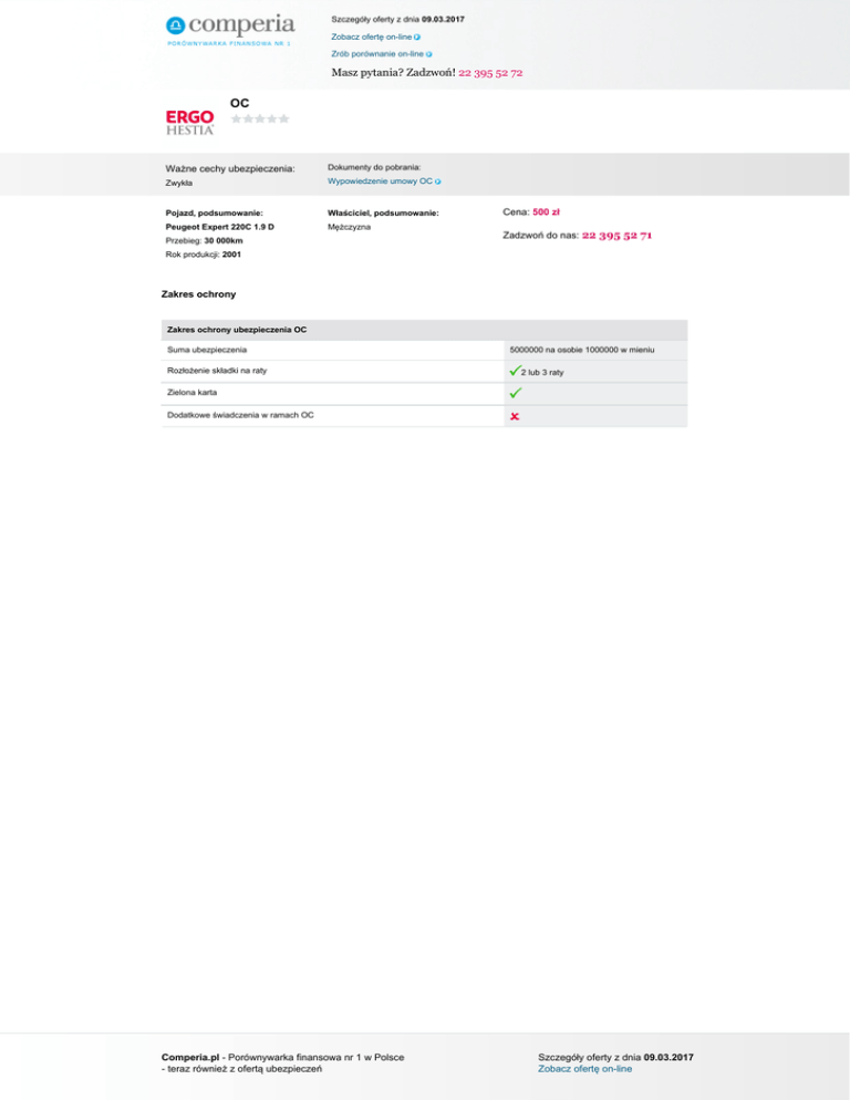 Szczegóły oferty z dnia 09.03.2017 Zobacz ofertę on-line Zrób porównanie on-line Masz pytania? Zadzwoń! 22 395 52 72 OC Ważne cechy ubezpieczenia: Dokumenty do pobrania: Zwykła Wypowiedzenie umowy OC Pojazd, podsumowanie: Właściciel, podsumowanie: Peugeot Expert 220C 1.9 D Mężczyzna Przebieg: 30 000km Cena: 500 zł Zadzwoń do nas: 22 395 52 71 Rok produkcji: 2001 Zakres ochrony Zakres ochrony ubezpieczenia OC Suma ubezpieczenia Rozłożenie składki na raty 5000000 na osobie 1000000 w mieniu 2 lub 3 raty Zielona karta Dodatkowe świadczenia w ramach OC Comperia.pl - Porównywarka finansowa nr 1 w Polsce - teraz również z ofertą ubezpieczeń Powered by TCPDF (www.tcpdf.org) Szczegóły oferty z dnia 09.03.2017 Zobacz ofertę on-line