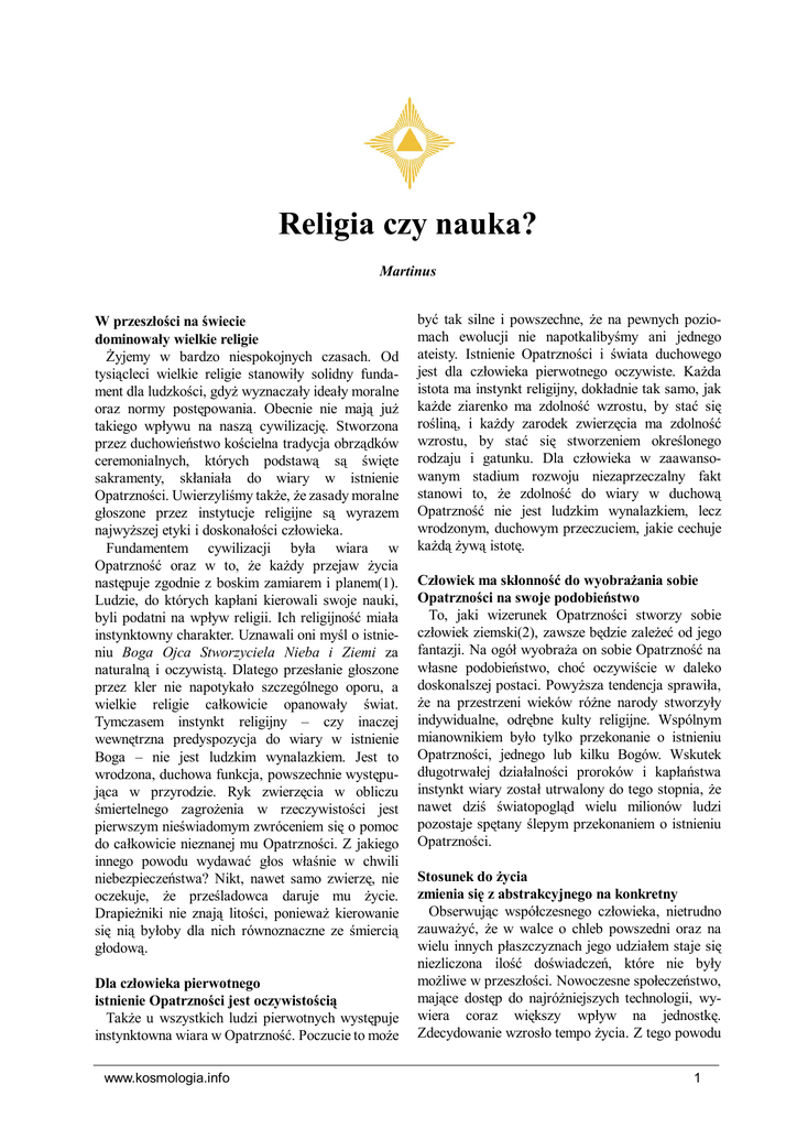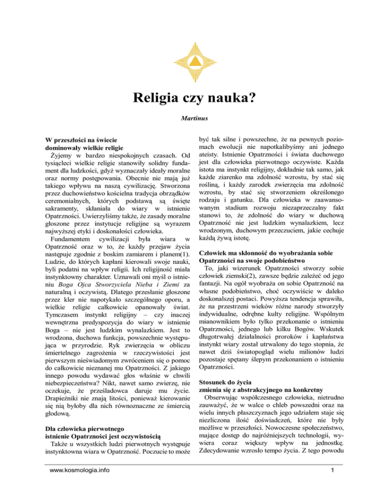 Religia czy nauka? Religia czy nauka? Martinus W przeszłości na świecie dominowały wielkie religie Żyjemy w bardzo niespokojnych czasach. Od tysiącleci wielkie religie stanowiły solidny fundament dla ludzkości, gdyż wyznaczały ideały moralne oraz normy postępowania. Obecnie nie mają już takiego wpływu na naszą cywilizację. Stworzona przez duchowieństwo kościelna tradycja obrządków ceremonialnych, których podstawą są święte sakramenty, skłaniała do wiary w istnienie Opatrzności. Uwierzyliśmy także, że zasady moralne głoszone przez instytucje religijne są wyrazem najwyższej etyki i doskonałości człowieka. Fundamentem cywilizacji była wiara w Opatrzność oraz w to, że każdy przejaw życia następuje zgodnie z boskim zamiarem i planem(1). Ludzie, do których kapłani kierowali swoje nauki, byli podatni na wpływ religii. Ich religijność miała instynktowny charakter. Uznawali oni myśl o istnieniu Boga Ojca Stworzyciela Nieba i Ziemi za naturalną i oczywistą. Dlatego przesłanie głoszone przez kler nie napotykało szczególnego oporu, a wielkie religie całkowicie opanowały świat. Tymczasem instynkt religijny – czy inaczej wewnętrzna predyspozycja do wiary w istnienie Boga – nie jest ludzkim wynalazkiem. Jest to wrodzona, duchowa funkcja, powszechnie występująca w przyrodzie. Ryk zwierzęcia w obliczu śmiertelnego zagrożenia w rzeczywistości jest pierwszym nieświadomym zwróceniem się o pomoc do całkowicie nieznanej mu Opatrzności. Z jakiego innego powodu wydawać głos właśnie w chwili niebezpieczeństwa? Nikt, nawet samo zwierzę, nie oczekuje, że prześladowca daruje mu życie. Drapieżniki nie znają litości, ponieważ kierowanie się nią byłoby dla nich równoznaczne ze śmiercią głodową. Dla człowieka pierwotnego istnienie Opatrzności jest oczywistością Także u wszystkich ludzi pierwotnych występuje instynktowna wiara w Opatrzność. Poczucie to może www.kosmologia.info być tak silne i powszechne, że na pewnych poziomach ewolucji nie napotkalibyśmy ani jednego ateisty. Istnienie Opatrzności i świata duchowego jest dla człowieka pierwotnego oczywiste. Każda istota ma instynkt religijny, dokładnie tak samo, jak każde ziarenko ma zdolność wzrostu, by stać się rośliną, i każdy zarodek zwierzęcia ma zdolność wzrostu, by stać się stworzeniem określonego rodzaju i gatunku. Dla człowieka w zaawansowanym stadium rozwoju niezaprzeczalny fakt stanowi to, że zdolność do wiary w duchową Opatrzność nie jest ludzkim wynalazkiem, lecz wrodzonym, duchowym przeczuciem, jakie cechuje każdą żywą istotę. Człowiek ma skłonność do wyobrażania sobie Opatrzności na swoje podobieństwo To, jaki wizerunek Opatrzności stworzy sobie człowiek ziemski(2), zawsze będzie zależeć od jego fantazji. Na ogół wyobraża on sobie Opatrzność na własne podobieństwo, choć oczywiście w daleko doskonalszej postaci. Powyższa tendencja sprawiła, że na przestrzeni wieków różne narody stworzyły indywidualne, odrębne kulty religijne. Wspólnym mianownikiem było tylko przekonanie o istnieniu Opatrzności, jednego lub kilku Bogów. Wskutek długotrwałej działalności proroków i kapłaństwa instynkt wiary został utrwalony do tego stopnia, że nawet dziś światopogląd wielu milionów ludzi pozostaje spętany ślepym przekonaniem o istnieniu Opatrzności. Stosunek do życia zmienia się z abstrakcyjnego na konkretny Obserwując współczesnego człowieka, nietrudno zauważyć, że w walce o chleb powszedni oraz na wielu innych płaszczyznach jego udziałem staje się niezliczona ilość doświadczeń, które nie były możliwe w przeszłości. Nowoczesne społeczeństwo, mające dostęp do najróżniejszych technologii, wywiera coraz większy wpływ na jednostkę. Zdecydowanie wzrosło tempo życia. Z tego powodu 1 Religia czy nauka? ludziom przestają wystarczać abstrakcyjne wyobrażenia o naturze świata. Rozwój wymusza zmianę nastawienia z abstrakcyjnego na konkretny. Idealistyczne wizje już nam nie wystarczają i zaczynamy polegać wyłącznie na faktach. Ciągły napływ nowych przeżyć przyspiesza też rozwój intelektualny. Obecnie jest on tak szybki, że człowiek, często nieświadomie, stopniowo wyzwala się z tradycyjnych poglądów. W świetle analizy intelektualnej wydają się one mało prawdopodobne, a nawet sprzeczne z logiką, jaką na każdym kroku ukazuje nam samo życie. Tak oto rozumowe poznanie świata coraz bardziej wypiera instynktowne wyobrażenia o jego naturze. Dotychczasowym rezultatem powyższego procesu zachodzącego w świadomości człowieka jest wzrost zainteresowania materialną sferą życia oraz chęć zagarnięcia jak największej części dóbr. Widzimy, że instynkt służy do tworzenia wyobrażeń o duchowych i abstrakcyjnych obszarach bytu. Natomiast dzięki intelektowi coraz lepiej pojmujemy i analizujemy konkretne zjawiska w naszym otoczeniu. Wraz z rozwojem intelektu zanika skłonność do ślepej wiary Ewolucja człowieka ziemskiego doprowadziła do stopniowego zaniku instynktownych wyobrażeń o duchowych, ponadmaterialnych obszarach bytu na korzyść jasnego jak światło, intelektualnego poznawania sfery materialnej, czyli świata cielesnego w czystej formie. Efekt tego procesu staje się tym wyraźniej widoczny wobec równoległej utraty zdolności do ślepej wiary. Człowiek współczesny woli kierować się rozumowo wytłumaczalnymi faktami niż mglistymi, niedookreślonymi przeczuciami. A ponieważ najistotniejsza część jego doświadczeń, teraz oświetlonych blaskiem intelektu, jest powiązana ze światem cielesnym, to w początkowej fazie takiego poznania rzeczywistości dominuje podejście materialistyczne. To zatem nie tyle sam człowiek, ile ewolucja przywiodła ludzkość do materializmu, który zdominował naszą cywilizację. Materializm sprzyja rozwojowi ateizmu Większość współczesnych ludzi uznaje tylko to, co można zwa