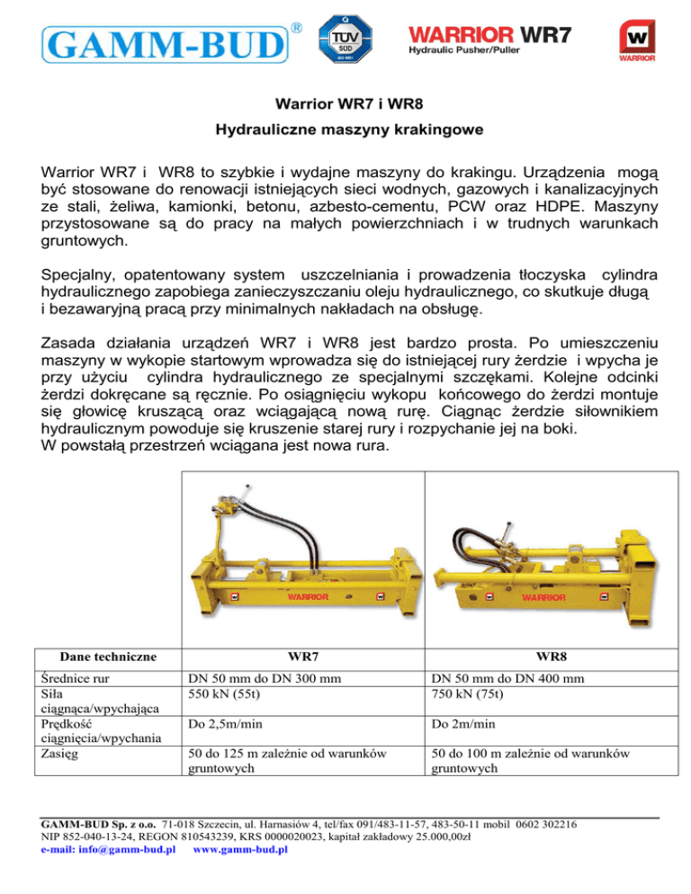 Stron a1z2 Warrior WR7 i WR8 Hydrauliczne maszyny krakingowe Warrior WR7 i WR8 to szybkie i wydajne maszyny do krakingu. Urządzenia mogą być stosowane do renowacji istniejących sieci wodnych, gazowych i kanalizacyjnych ze stali, żeliwa, kamionki, betonu, azbesto-cementu, PCW oraz HDPE. Maszyny przystosowane są do pracy na małych powierzchniach i w trudnych warunkach gruntowych. Specjalny, opatentowany system uszczelniania i prowadzenia tłoczyska cylindra hydraulicznego zapobiega zanieczyszczaniu oleju hydraulicznego, co skutkuje długą i bezawaryjną pracą przy minimalnych nakładach na obsługę. Zasada działania urządzeń WR7 i WR8 jest bardzo prosta. Po umieszczeniu maszyny w wykopie startowym wprowadza się do istniejącej rury żerdzie i wpycha je przy użyciu cylindra hydraulicznego ze specjalnymi szczękami. Kolejne odcinki żerdzi dokręcane są ręcznie. Po osiągnięciu wykopu końcowego do żerdzi montuje się głowicę kruszącą oraz wciągającą nową rurę. Ciągnąc żerdzie siłownikiem hydraulicznym powoduje się kruszenie starej rury i rozpychanie jej na boki. W powstałą przestrzeń wciągana jest nowa rura. Dane techniczne Średnice rur Siła ciągnąca/wpychająca Prędkość ciągnięcia/wpychania Zasięg WR7 WR8 DN 50 mm do DN 300 mm 550 kN (55t) DN 50 mm do DN 400 mm 750 kN (75t) Do 2,5m/min Do 2m/min 50 do 125 m zależnie od warunków gruntowych 50 do 100 m zależnie od warunków gruntowych GAMM-BUD Sp. z o.o. 71-018 Szczecin, ul. Harnasiów 4, tel/fax 091/483-11-57, 483-50-11 mobil 0602 302216 NIP 852-040-13-24, REGON 810543239, KRS 0000020023, kapitał zakładowy 25.000,00zł e-mail: [email protected] www.gamm-bud.pl Stron a2z2 Dane głównego zespołu Dane techniczne Wysokość Długość Szerokość Waga Długość skoku roboczego Średnica cylindra hydraulicznego System szczęk WR7 WR8 495,3mm 1828,8mm 546,1mm 471kg 254mm 177,8mm 685,8mm 1638,3mm 762mm 871kg 304,8mm 203,2mm Hydrauliczne, automatyczne Hydrauliczne, automatyczne Głowice poszerzające Głowica poszerzająca/krusząca Głowica poszerzająca/krusząca 44B 5 = 172,45 mm 44B 8 D= 266,7 mm Dostępne inne wymiary na zapytanie 44B 10 D= 323,85 mm Żerdzie Gwintowane 37B-2.5 50,8 x 762 mm Gwintowane BD225S Mała obudowa sondy Obudowa sondy Kontener do transportu żerdzi 37 R-30 860 x 560 x 410 mm Agregat hydrauliczny Diesel Dragon Silnik Wymiary Waga Zbiornik paliwa Zbiornik płynu hydraulicznego Maksymalne ciśnienie Wydajność pompy hydraulicznej 58 KM Caterpillar Diesel 1016 x 914 x 762 mm 771 kg 64 l 190 l 207 bar 122 l/min GAMM-BUD Sp. z o.o. 71-018 Szczecin, ul. Harnasiów 4, tel/fax 091/483-11-57, 483-50-11 mobil 0602 302216 NIP 852-040-13-24, REGON 810543239, KRS 0000020023, kapitał zakładowy 25.000,00zł e-mail: [email protected] www.gamm-bud.pl