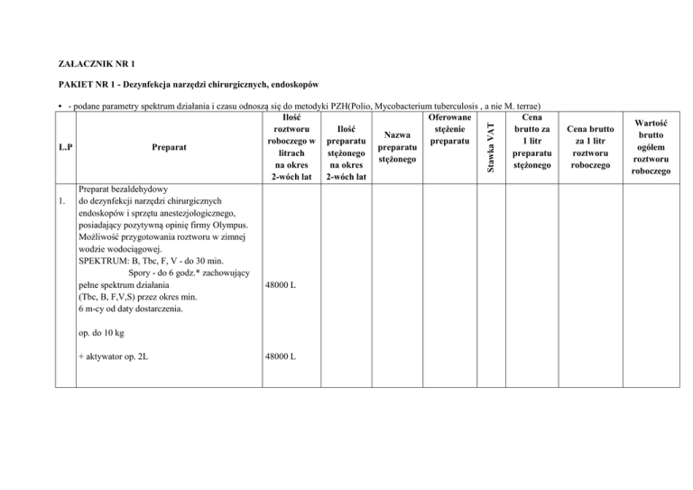 ZAŁACZNIK NR 1 PAKIET NR 1 - Dezynfekcja narzędzi chirurgicznych, endoskopów Stawka VAT • - podane parametry spektrum działania i czasu odnoszą się do metodyki PZH(Polio, Mycobacterium tuberculosis , a nie M. terrae) Ilość Oferowane Cena roztworu Ilość stężenie brutto za Nazwa roboczego w preparatu preparatu 1 litr L.P Preparat preparatu litrach stężonego preparatu stężonego na okres na okres stężonego 2-wóch lat 2-wóch lat Preparat bezaldehydowy 1. do dezynfekcji narzędzi chirurgicznych endoskopów i sprzętu anestezjologicznego, posiadający pozytywną opinię firmy Olympus. Możliwość przygotowania roztworu w zimnej wodzie wodociągowej. SPEKTRUM: B, Tbc, F, V - do 30 min. Spory - do 6 godz.* zachowujący pełne spektrum działania 48000 L (Tbc, B, F,V,S) przez okres min. 6 m-cy od daty dostarczenia. op. do 10 kg + aktywator op. 2L 48000 L Cena brutto za 1 litr roztworu roboczego Wartość brutto ogółem roztworu roboczego 2. Preparat do dezynfekcji narzędzi chirurgicznych i endoskopów giętkich bez zawartości aldehydów , fenoli QAV i chloru, posiadający pozytywną opinię firmy Olympus SPEKTRUM: B, Tbc, F, V – 15min* S – 3 godz. 480 L Możliwość monitorowania aktywności roztworu przy użyciu pasków testowych dostarczanych wraz z preparatem. Op. 1,5kg 3. Preparat na bazie tenzydów niejonowych, przeznaczny do wstępnego mycia endoskopów usuwający zanieczyszczenia organiczne op. 2L 4. 6400 L Preparat aldehydu glutarowego do dezynfekcji endoskopów: możliwość stosowania roztworu do 14 dni z możliwością kontroli substancji aktywnej SPEKTRUM; B, Tbc , F, V (1h) * Op.5 l. 640 L W załączeniu paski testowe 1080 szt. Wartość brutto : ZAŁACZNIK NR 1 L.P 1. Preparat Preparat chlorowy w tabletkach (lub w saszetkach) do dezynfekcji dużych powierzchni i przedmiotów, w kuchenkach oddziałowych niezanieczyszczonych subst. organicznymi z możliwością stosowania do powierzchni zanieczyszczonych organicznie i zalewania plam krwi . Wymagany system dozowania . SPEKTRUM: B , Tbc , F,V do 15 min ( w stęż. aktywnego chloru do 2000 ppm) Należy podać cenę dla powierzchni niezanieczyszczonych w w/w. spektrum (najniższe stęż.) Wymagany atest dopuszczający dezynfekcję powierzchni kontaktujących się z żywnością Opakowanie nie większe niż 1kg Ilość roztworu roboczego w litrach na okres 2-wóch lat 64000 L Ilość preparatu stężonego na okres 2-wóch lat Nazwa preparatu stężonego Oferowane Stężenie preparatu Stawka VAT PAKIET NR 2 - Dezynfekcja powierzchni Cena brutto za Cena brutto 1 litr za 1 litr preparatu roztworu stężonego roboczego Wartość brutto ogółem roztworu roboczego 2. Preparat tlenowy do dezynfekcji inkubatorów. Wymagana pozytywna opinia IMiDz SPEKTRUM: B, F, V (op. Saszetka do 200g) 3. Preparat alkoholowy gotowy do użycia do dezynfekcji trudno dostępnych powierzchni, bez zawartości aldehydu glutarowego chloru, IV – rz zw. amoniowych (QAV) i fenoli. Wymagana pozytywna opinia kliniczna IMiDz do dezynfekcji powierzchni w oddz. pediatrycznych SPEKTRUM: B, F, Tbc – 1 min. 4. 630 L Wskazane działanie wirusobójcze Op. Butelka ze spryskiwaczem około1l 68 L Op. do 6l 350 L Preparat do jednoczesnego mycia i dezynfekcji dużych powierzchni zmywalnych na bazie glukoprotaminy, bez dodatku: aldehydów, chloru, fenoli, alkoholi IV – rzęd. zw amoniowych (QAV) i ich pochodnych SPEKTRUM: B, Tbc, F – 30min B,F- 15min Należy podać cenę dla powierzchni nie zanieczyszczonych w spektrum B,F – 15min. Op. do 2l z wbudowaną miarką (dozownikiem) Kanister do 6l 5. Preparat do jednoczesnego mycia i dezynfekcji powierzchni na bazie aktywnego tlenu bez dodatku aldehydów, chloru, fenoli, IV – rzęd. zw. amoniowych (QAV) i ich pochodnych. SPEKTRUM : B.F,V (osłonione) – 15 min Op. kanister do 6l z wbudowaną miarką (dozownikiem) lub załączoną pompką dozującą do opakowania. Wartość brutto: 140L 1000 L 2900 L ZAŁĄCZNIK NR 1 PAKIET NR 3 - Maszynowe mycie i dezynfekcja endoskopów i sprzętu. Lp. Preparat 1. Płynny ,enzymatyczny preparat myjący do maszynowego mycia narzędzi chirurgicznych , endoskopów giętkich, sprzętu anestezjologicznego, plastiku, pH koncentratu 6,0, neutralne pH w roztworze Zastosowanie: mycie powierzchniowe zanurzeniowe i ultradźwiękowe. Op. kanister 5 l Płynny, słabo pieniący, neutralny środek do maszynowej dezynfekcji endoskopów giętkich i innego sprzętu wrażliwego na temperaturę na bazie aldehydu glutarowego (bez zawartości aldehydu mrówkowego i glioksalu) Spektrum: B, F, V(Adeno, Polio), Tbc op. kanister 5l Płynny środek do automatów myjąco – dezynfekujących do kaczek, basenów i utensyliów wykonanych ze stali, plastiku, aluminium i szkła; pH koncentratu 3,0-4,0 Op. kanister 5 2. 3. Wartość brutto: Ilość preparatu stężonego na okres 2-wóch lat 72 L 136 L 120 L Nazwa preparatu stężonego Stawka VAT Cena brutto za 1 litr preparatu stężonego Wartość brutto ogółem ZAŁĄCZNIK NR 1 PAKIET NR 4 - Mycie i dezynfekcja skóry , błon śluzowych i rąk Lp. Preparat 1. Preparat alkoholowy, bezbarwny do odkażania skóry, zawierający etanol, izopropanol, nadtlenek wodoru, bez zawartości pochodnych fenolowych. SPEKTRUM : B, Tbc, F,V (HBV, Rota, Adeno, Polio) Op. butelka ze spryskiwaczem poj. do 500ml. Op. do 6l Preparat alkoholowy, barwiony, do odkażania skóry, zawierający etanol, izopropanol, nadtlenek wodoru, bez zawartości pochodnych fenolowych i jodu. SPEKTRUM : B, Tbc, F,V (HBV, Rota, Adeno, Polio) Op. butelka ze spryskiwaczem poj. do 500ml. Op. do 6l 2. Ilość preparatu stężonego na okres 2-wóch lat 40 L 560 L 200 L 20 L Nazwa preparatu stężonego Stawka VAT Cena brutto za 1 litr preparatu stężonego Wartość brutto ogółem 3. 4. 5. 6. 7. Preparat alkoholowy, bezbarwny do odkażania błon śluzowych, okolic intymnych bez zawartości jodu autosterylny SPEKTRUM: B, F, V Op. do 1l Preparat alkoholowy antybakteryjny, bezbarwny do odkażania bło