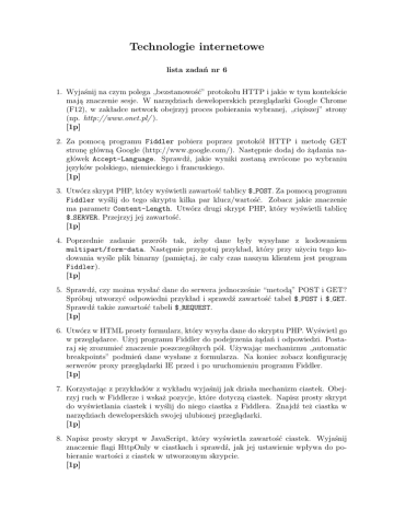 Technologie internetowe lista zadań nr 6 1. Wyjaśnij na czym polega „bezstanowość” protokołu HTTP i jakie w tym kontekście mają znaczenie sesje. W narzędziach deweloperskich przeglądarki Google Chrome (F12), w zakładce network obejrzyj proces pobierania wybranej, „cięższej” strony (np. http://www.onet.pl/ ). [1p] 2. Za pomocą programu Fiddler pobierz poprzez protokół HTTP i metodę GET stronę główną Google (http://www.google.com/). Następnie dodaj do żądania nagłówek Accept-Language. Sprawdź, jakie wyniki zostaną zwrócone po wybraniu języków polskiego, niemieckiego i francuskiego. [1p] 3. Utwórz skrypt PHP, który wyświetli zawartość tablicy $ POST. Za pomocą programu Fiddler wyślij do tego skryptu kilka par klucz/wartość. Zobacz jakie znaczenie ma parametr Content-Length. Utwórz drugi skrypt PHP, który wyświetli tablicę $ SERVER. Przejrzyj jej zawartość. [1p] 4. Poprzednie zadanie przerób tak, żeby dane były wysyłane z kodowaniem multipart/form-data. Następnie przygotuj przykład, który przy użyciu tego kodowania wyśle plik binarny (pamiętaj, że cały czas naszym klientem jest program Fiddler). [1p] 5. Sprawdź, czy można wysłać dane do serwera jednocześnie “metodą” POST i GET? Spróbuj utworzyć odpowiedni przykład i sprawdź zawartość tabel $ POST i $ GET. Sprawdź także zawartość tabeli $ REQUEST. [1p] 6. Utwórz w HTML prosty formularz, który wysyła dane do skryptu PHP. Wyświetl go w przeglądarce. Użyj programu Fiddler do podejrzenia żądań i odpowiedzi. Postaraj się zrozumieć znaczenie poszczególnych pól. Używając mechanizmu „automatic breakpoints” podmień dane wysłane z formularza. Na koniec zobacz konfigurację serwerów proxy przeglądarki IE przed i po uruchomieniu programu Fiddler. [1p] 7. Korzystając z przykładów z wykładu wyjaśnij jak działa mechanizm ciastek. Obejrzyj ruch w Fiddlerze i wskaż pozycje, które dotyczą ciastek. Napisz prosty skrypt do wyświetlania ciastek i wyślij do niego ciastka z Fiddlera. Znajdź też ciastka w narzędziach deweloperskich swojej ulubionej przeglądarki. [1p] 8. Napisz prosty skrypt w JavaScript, który wyświetla zawartość ciastek. Wyjaśnij znaczenie flagi HttpOnly w ciastkach i sprawdź, jak jej ustawienie wpływa do pobieranie wartości z ciastek w utworzonym skrypcie. [1p] 9. Sprawdź czym się różni ciastko „persistent cookie” od ciastka per sesja. Ustal jak przechowywane są ciastka w co najmniej dwóch przeglądarkach. Czy jest różnica w składowaniu ciastek „trwałych” i sesyjnych? [1p] 10. Każde ciastko może mieć ustawioną domenę i ścieżkę. Wyjaśnij ich znaczenie i zrób przykłady, które to znaczenie pokażą. [1p] Paweł Rajba