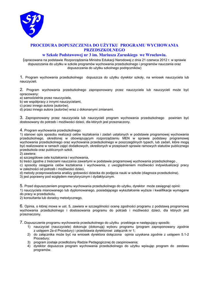 PROCEDURA DOPUSZCZENIA DO UŻYTKU PROGRAMU WYCHOWANIA PRZEDSZKOLNEGO w Szkole Podstawowej nr 3 im. Mariusza Zaruskiego we Wrocławiu. (opracowana na podstawie Rozporządzenia Ministra Edukacji Narodowej z dnia 21 czerwca 2012 r. w sprawie dopuszczania do użytku w szkole programów wychowania przedszkolnego i programów nauczania oraz dopuszczania do użytku szkolnego podręczników) 1. Program wychowania przedszkolnego nauczycieli. dopuszcza do użytku dyrektor szkoły, na wniosek nauczyciela lub 2. Program wychowania przedszkolnego zaproponowany przez nauczyciela lub nauczycieli może być opracowany: a) samodzielnie przez nauczyciela, b) we współpracy z innymi nauczycielami, c) przez innego autora (autorów), d) przez innego autora (autorów) wraz z dokonanymi zmianami. 3. Zaproponowany przez nauczyciela lub nauczycieli program wychowania przedszkolnego dostosowany do potrzeb i możliwości dzieci, dla których jest przeznaczony. powinien być 4. Program wychowania przedszkolnego: 1) stanowi opis sposobu realizacji celów kształcenia i zadań ustalonych w podstawie programowej wychowania przedszkolnego, określonej w obowiązującym rozporządzeniu MEN w sprawie podstawy programowej wychowania przedszkolnego oraz wychowania przedszkolnego w poszczególnych typach, lub zadań, które mogą być realizowane w ramach zajęć dodatkowych, określonych w przepisach sprawie ramowych statutów publicznego przedszkola oraz publicznych szkół. 2) zawiera: a) szczegółowe cele kształcenia i wychowania, b) treści zgodne z treściami nauczania zawartymi w podstawie programowej wychowania przedszkolnego , c) sposoby osiągania celów kształcenia i wychowania, z uwzględnieniem możliwości indywidualizacji pracy w zależności od potrzeb i możliwości dzieci, d) metody przeprowadzania analizy gotowości dziecka do podjęcia nauki w szkole (diagnoza przedszkolna). 3) jest poprawny pod względem merytorycznym i dydaktycznym. 5. Przed dopuszczeniem programu wychowania przedszkolnego do użytku, dyrektor może zasięgnąć opinii: 1) nauczyciela mianowanego lub dyplomowanego, posiadającego wykształcenie wyższe i kwalifikacje wymagane do pracy w przedszkolu, 2) konsultanta lub doradcy metodycznego, 6. Opinia, o której mowa w ust. 5, zawiera w szczególności ocenę zgodności programu z podstawą programową wychowania przedszkolnego i dostosowania programu do potrzeb i możliwości dzieci, dla których jest przeznaczony. 7. Dopuszczenie programu wychowania przedszkolnego do użytku 1) 2) 3) 4) przebiega w następujący sposób: nauczyciel (nauczyciele) dokonuje (dokonują) wyboru programu (program zaproponowany zgodnie z ustępem 2a-d Procedury) i przedstawia dyrektorowi załącznik nr 1; do załącznika może być na wniosek dyrektora dołączona opinia uzyskana zgodnie z ustępem 5.1-2 Procedury; program zostaje przedłożony Radzie Pedagogicznej do zaopiniowania; dyrektor dopuszcza program wychowania przedszkolnego do użytku wpisując program do zestawu programów. ZAŁĄCZNIK NR 1 WNIOSEK NAUCZYCIEL/NAUCZYCIELI O DOPUSZCZENIE DO UŻYTKU PROGRAMU WYCHOWANIA PRZEDSZKOLNEGO w Szkole Podstawowej nr 3 im. Mariusza Zaruskiego we Wrocławiu w roku szkolnym …………. I. NAZWA PROGRAMU: II. AUTOR/AUTORZY PROGRAMU: III. REALIZOWANY PROGRAM ZOSTAŁ OPRACOWANY: TAK NIE a) samodzielnie b) we współpracy z innymi nauczycielami c) przez innego autora (autorów) d) przez innego autora (autorów) wraz z dokonanymi przez nauczyciela zmianami IV. Czy nauczyciel wnioskujący dysponuje zgodą autora programu na wykorzystanie programu do realizacji i dokonywania zmian ? TAK / NIE V. DYSPOZYCJE DO ANALIZY PROGRAMU Program wychowania przedszkolnego stanowi opis sposobu realizacji celów kształcenia i zadań ustalonych w podstawie programowej wychowania przedszkolnego, określonej w obowiązującym rozporządzeniu MEN w sprawie podstawy programowej wychowania przedszkolnego oraz kształcenia ogólnego w poszczególnych typach szkół lub zadań, które mogą być realizowane w ramach zajęć dodatkowych, określonych w przepisach w sprawie ramowych statutów publicznego przedszkola oraz publicznych szkół. Program wychowania przedszkolnego zawiera: a) szczegółowe cele kształcenia i wychowania, b) treści zgodne z treściami nauczania zawartymi w podstawie programowej wychowania przedszkolnego, c) sposoby osiągania celów kształcenia i wychowania, z uwzględnieniem możliwości indywidualizacji pracy w zależności od potrzeb i możliwości dzieci, d) metody przeprowadzania analizy gotowości dziecka do podjęcia nauki w szkole (diagnoza przedszkolna). Program jest poprawny pod względem merytorycznym i dydaktycznym, w szczególności uwzględnia aktualny stan wiedzy naukowej. Program przedstawiono do zaopiniowania. Spełnienie wymagań rozporządzenia TAK NIE § 3. 1. § 3. 1. 2)a) § 3. 1. 2)b) § 3. 1. 2)c) § 3. 1. 2)d) § 3. 1. 3) § 3. 2 Program uzyskał pozytywną opinię nauczyciela: ……………………………………………………………………………………………………………… (opinia w załączeniu) 1) nauczyciela mianowanego lub dyplomowanego, posiadającego wykształcenie wyższe i kwalifikacje wymagane do pracy w przedszkolu, § 3. 2 2) konsultanta lub doradcy metodycznego, § 3. 2 Uwagi dotyczące wyboru programu: PODPIS NAUCZYCIELA/NAUCZYCIELI : …………………………………………………………………………………………………………… PROCEDURA DOPUSZCZENIA DO UŻYTKU PROGRAMU NAUCZANIA w Szkole Podstawowej nr 3 Mariusza Zaruskiego we Wrocławiu (opracowana na podstawie Rozporządzenia Ministra Edukacji Narodowej z dnia 21 czerwca 2012 r. w sprawie dopuszczania do użytku w szkole programów wychowania przedszkolnego i programów nauczania oraz dopuszczania do użytku szkolnego podręczników) 1. Program nauczania dla zajęć edukacyjnych z zakresu kształcenia ogólnego, zwany dalej „programem nauczania ogólnego” 