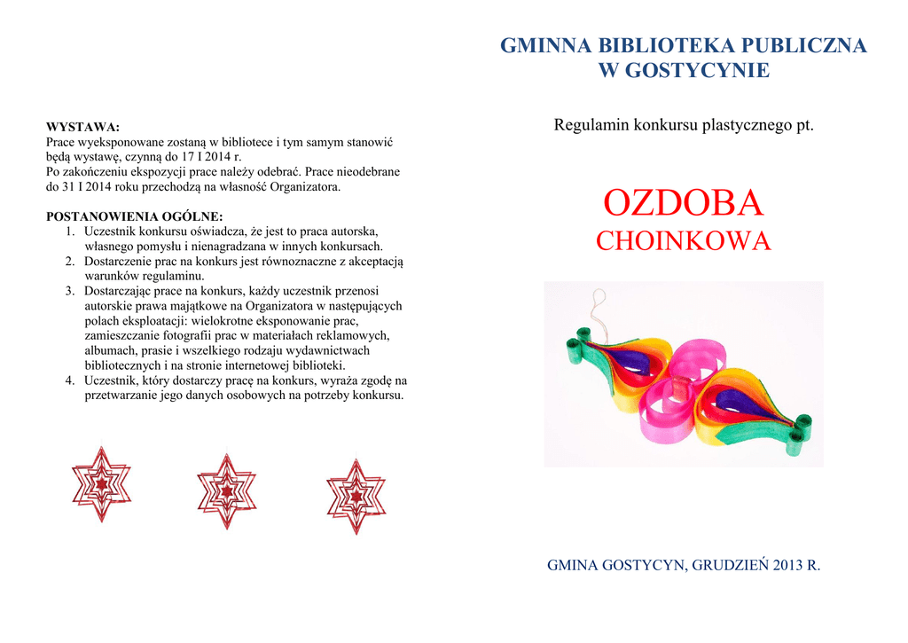 GMINNA BIBLIOTEKA PUBLICZNA W GOSTYCYNIE WYSTAWA: Prace wyeksponowane zostaną w bibliotece i tym samym stanowić będą wystawę, czynną do 17 I 2014 r. Po zakończeniu ekspozycji prace należy odebrać. Prace nieodebrane do 31 I 2014 roku przechodzą na własność Organizatora. POSTANOWIENIA OGÓLNE: 1. Uczestnik konkursu oświadcza, że jest to praca autorska, własnego pomysłu i nienagradzana w innych konkursach. 2. Dostarczenie prac na konkurs jest równoznaczne z akceptacją warunków regulaminu. 3. Dostarczając prace na konkurs, każdy uczestnik przenosi autorskie prawa majątkowe na Organizatora w następujących polach eksploatacji: wielokrotne eksponowanie prac, zamieszczanie fotografii prac w materiałach reklamowych, albumach, prasie i wszelkiego rodzaju wydawnictwach bibliotecznych i na stronie internetowej biblioteki. 4. Uczestnik, który dostarczy pracę na konkurs, wyraża zgodę na przetwarzanie jego danych osobowych na potrzeby konkursu. Regulamin konkursu plastycznego pt. OZDOBA CHOINKOWA GMINA GOSTYCYN, GRUDZIEŃ 2013 R. CELE: Upowszechnianie tradycji bożonarodzeniowej oraz poznawanie obyczajowości ludowej naszej ojczyzny, tak ważnej w edukacji kulturalnej dzieci i młodzieży. Zachęcenie dzieci i młodzieży do twórczości plastycznej, rozwijającej wyobraźnię i umiejętności manualne na płaszczyźnie i w przestrzeni . TEMATYKA KONKURSU: Bożonarodzeniowa ozdoba choinkowa. Mile widziane prace inspirowane motywami regionalnymi – borowiackimi, postaciami i obrazami z literatury (bajki, baśnie, legendy, opowiadania itp.). WARUNKI KONKURSU: Uczestnik powinien dostarczyć 1 pracę (nie uczestniczącą w innych konkursach) wykonaną w przestrzennym lub płaskim formacie w dowolnej technice (wydzieranka, wycinanka, haft matematyczny, itd.) z dowolnego tworzywa. Ozdoba zgłoszona do konkursu winna spełniać następujące warunki: wielkość i waga muszą umożliwiać zawieszenie jej na choince. Prace należy opatrzyć zawieszką i przymocowaną w widocznym miejscu kartką – metryczką zawierającą dane: imię i nazwisko, klasa, nazwa szkoły. Metryczka powinna być niewielkich rozmiarów, tak aby nie przysłaniała pracy. Prace mogą być wykonywane tylko indywidualnie – zbiorowe nie będą oceniane. UCZESTNICY: Dzieci przedszkolne, szkół podstawowych i młodzież gimnazjalna z Gminy Gostycyn. KATEGORIE : Prace oceniane będą w 4 kategoriach wiekowych: 1. Dzieci przedszkolne i uczniowie kl. „0” do lat 6 2. Uczniowie szkół podstawowych klas I-III 3. Uczniowie szkół podstawowych klas IV-VI 4. Uczniowie szkół gimnazjalnych TERMINY I MIEJSCA : Prace należy składać do 13 XII 2013r. w bibliotece w Gostycynie. Otwarcie wystawy, ogłoszenie wyników i wręczenie nagród odbędzie się: 17 XII 2013 r. (wtorek) godz. 1600 OCENA : Prace będą oceniane wg. następujących kryteriów: ogólne wrażenie artystyczne, dobór i wykorzystanie materiałów, wkład pracy, walory plastyczne (kompozycja, kolorystyka), oryginalny pomysł, samodzielność. NAGRODY : Autorzy najlepszych prac w poszczególnych kategoriach wiekowych otrzymają nagrody rzeczowe i dyplomy.