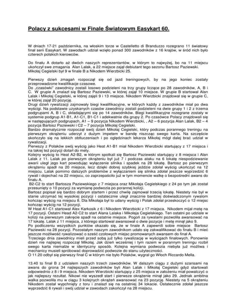 Polacy z sukcesami w Finale Światowym Easykart 60. W dniach 17-21 października, na włoskim torze w Castelletto di Branduzzo rozegrano 11 światowy finał serii Easykart. W zawodach udział wzięło ponad 300 zawodników z 16 krajów, w śród nich było czterech polskich kierowców. Do finału A dotarło aż dwóch naszych reprezentantów, w którym to najwyżej, bo na 11 miejscu ukończył swe zmagania Alan Lalak, a 22 miejsce zajął debiutant tego sezonu Bartosz Paziewski. Mikołaj Cegielski był 9 w finale B a Nikodem Wierzbicki 25. Pierwszy dzień zmagań rozpoczął się od jazd treningowych, by na jego koniec zostały przeprowadzone kwalifikacje czasowe. Do „czasówki” zawodnicy zostali losowo podzieleni na trzy grupy liczące po 28 zawodników, A, B i C. W grupie A znalazł się Bartosz Paziewski, w której zajął 10 miejsce. W grupie B startował Alan Lalak i Mikołaj Cegielski, w której zajęli 9 i 13 miejsce. Nikodem Wierzbicki znajdował się w grupie C, w której zajął 20 pozycję. Drugi dzień rywalizacji zajmowały biegi kwalifikacyjne, w których każdy z zawodników miał po dwa wyścigi. Na podstawie uzyskanych czasów zawodnicy zostali podzieleni na dwie grupy 1 i 2 z trzema podgrupami A, B i C, składającymi się po 14 zawodników. Biegi kwalifikacyjne rozegrane zostały w systemie podgrup A1-B1, A1-C1, B1-C1 i adekwatnie dla grupy 2. Po czasówce Polacy znajdowali się w następujących podgrupach, A1 – 9 pozycja Nikodem Wierzbicki, , A2 – 6 pozycja Alan Lalak, B2 – 4 pozycja Bartosz Paziewski i C2 – 7 pozycja Mikołaj Cegielski. Bardzo dramatycznie rozpoczął swój dzień Mikołaj Cegielski, który podczas porannego treningu na pierwszym okrążeniu uderzył z dużym impetem w bandę niszcząc swego karta. Na szczęście skończyło się na lekkich obtłuczeniach i po oględzinach lekarza Mikołaj mógł dalej brać udział w rywalizacji. Pierwszy z Polaków swój wyścig jako Heat A1-B1 miał Nikodem Wierzbicki startujący z 17 miejsca i na takiej też pozycji dotarł do mety. Kolejny wyścig to Heat A2-B2, w którym spotkali się Bartosz Paziewski startujący z 8 miejsca i Alan Lalak z 11. Lalak po pierwszym okrążeniu był już 7 i podczas ataku na 6 lokatę niespodziewanie awarii uległ jego kart powodując wyłączenie silnika i spadek na 28 lokatę. Bartosz po pierwszym okrążeniu spadł na 20 miejsce, lecz dzięki dobrej szybkiej jeździe zdołał wyścig ukończyć na 12 miejscu. Lalak pomimo dalszych problemów z wyłączaniem się silnika zdołał jeszcze wyprzedzić 6 rywali i dojechać na 22 miejscu, co zaprzepaściło już w tym momencie walkę o bezpośredni awans do finału A. B2-C2 to start Bartosza Paziewskiego z 7 miejsca oraz Mikołaja Cegielskiego z 24 po tym jak został przesunięty o 10 pozycji za wymianę podwozia po porannej kolizji. Bartosz popisał się bardzo dobrym startem i przez chwilę zajmował trzecią lokatę. Niestety nie był w stanie utrzymać tej wysokiej pozycji i ostatecznie uległ znacznie bardziej doświadczonym rywalom kończąc wyścig na miejscu 8. Dla Mikołaja był to udany wyścig i Polak zdołał przeskoczyć o 12 miejsc kończąc wyścig na 12 pozycji. W Heat A1-C1 startował Alex Karkosik z 6 i Nikodem Wierzbicki z 17 miejsca. Nikodem mijał metę na 17 pozycji. Ostatni Head A2-C2 to start Alana Lalaka i Mikołaja Cegielskiego. Ten ostatni po udziale w kolizji na pierwszym zakręcie spadł na ostatnie miejsce. Pogoń za rywalami pozwoliła awansować na 17 lokatę. Lalak z 11 miejsca, z którego startował awansował o dwie pozycje i metę minął jako 9. Po podliczeniu wszystkich punktów okazało się, że w finale A zapewnili sobie miejsce Bartosz Paziewski na 28 pozycji. Pozostałym naszym zawodnikom udało się zakwalifikować do finału B i mieć jeszcze możliwość rywalizować o sześć czołowych miejsc promowanych awansem do finał A. Trzeciego dnia zawodnicy mieli przed sobą już tylko rywalizację w wyścigach finałowych. Ponownie dzień nie najlepiej rozpoczął Mikołaj. Jak dzień wcześniej i tym razem w porannym treningu rozbił swego karta niemalże w identyczny sposób. Kolejna wymiana podwozia niebyła już możliwa i mechanicy musieli spróbować doprowadzić podwozie do stanu użyteczności. O 11.20 odbył się pierwszy finał C w którym nie było Polaków, wygrał go Włoch Riccardo Mella. 13.40 to finał B z udziałem naszych trzech zawodników. W dalszym ciągu z dużymi szansami na awans do grona 34 najlepszych zawodników byli Alan Lalak i Mikołaj Cegielski gdyż startowali odpowiednio z 8 i 9 miejsca. Nikodem Wierzbicki startujący z 25 miejsca w założeniu miał powalczyć o jak najlepszy rezultat. Nikowi nie wyszedł start i pierwsze okrążenie minął jako 29. Jednak ambitna walka pozwoliła mu w ciągu 3 kolejnych okrążeń awansować na 23 pozycję. Niestety na 5 okrążeniu Nikodem został wypchnięty z toru i znalazł się na ostatniej 34 lokacie. Ostatecznie zdołał jeszcze wyprzedzić 6 rywali i swój udział w zawodach zakończył na 28 miejscu. Mikołaj Cegielski zaraz po starcie uczestniczył w kolizji i spadł na 25 miejsce. Pomimo pościgu za rywalami udało mu się przebić do dziewiątej pozycji i do pozycji promującej awansem zabrakło zaledwie 2 sekund. Swoją szansę na możliwość awansu do wielkiego finału wykorzystał Alan Lalak. Wyścig rozpoczął się dla niego niezbyt dobrze, gdyż omijając kolizję, w której uczestniczył Mikołaj spadł na 16 miejsce. Wydawało się, że i jemu także nie uda się znaleźć w czołowej szóstce promowanej awansem. Jednak bardzo dobra jazda najmłodszego z Polaków umożliwiła mu przebicie się do czwartego miejsca. Ostatnie kółka w wykonaniu Alana, to rekordowe okrążenia wyścigu i szaleńcza pogoń za rywalem zajmującym trzecie miejsce. Alanowi udało się go dogonić i wyprzedzić na ostatnich metrach przed metą. Tym samym stanął na najniższym stopniu podium finału B i zawansowa