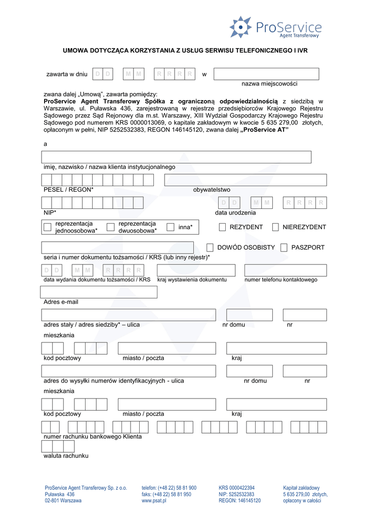 UMOWA DOTYCZĄCA KORZYSTANIA Z USŁUG SERWISU TELEFONICZNEGO I IVR zawarta w dniu D D M M R R R R w nazwa miejscowości zwana dalej „Umową”, zawarta pomiędzy: ProService Agent Transferowy Spółka z ograniczoną odpowiedzialnością z siedzibą w Warszawie, ul. Puławska 436, zarejestrowaną w rejestrze przedsiębiorców Krajowego Rejestru Sądowego przez Sąd Rejonowy dla m.st. Warszawy, XIII Wydział Gospodarczy Krajowego Rejestru Sądowego pod numerem KRS 0000013069, o kapitale zakładowym w kwocie 5 635 279,00 złotych, opłaconym w pełni, NIP 5252532383, REGON 146145120, zwana dalej „ProService AT” a imię, nazwisko / nazwa klienta instytucjonalnego PESEL / REGON* obywatelstwo D NIP* D M M R R R R data urodzenia reprezentacja jednoosobowa* reprezentacja dwuosobowa* inna* REZYDENT DOWÓD OSOBISTY NIEREZYDENT PASZPORT seria i numer dokumentu tożsamości / KRS (lub inny rejestr)* D D M M R R R R data wydania dokumentu tożsamości / KRS kraj wystawienia dokumentu numer telefonu kontaktowego Adres e-mail adres stały / adres siedziby* – ulica nr domu nr mieszkania kod pocztowy miasto / poczta kraj adres do wysyłki numerów identyfikacyjnych - ulica nr domu nr mieszkania kod pocztowy miasto / poczta kraj numer rachunku bankowego Klienta waluta rachunku ProService Agent Transferowy Sp. z o.o. Puławska 436 02-801 Warszawa telefon: (+48 22) 58 81 900 faks: (+48 22) 58 81 950 www.psat.pl KRS 0000422394 NIP: 5252532383 REGON: 146145120 Kapitał zakładowy 5 635 279,00 złotych, opłacony w całości zwanym dalej Klientem. RODZAJ DYSPOZYCJI: NADANIE NIU i PIN ZMIANA NUMERU PIN ZMIANA NUMERU RACHUNKU BANKOWEGO WSPÓŁMAŁŻONEK / REPREZENTANT KLIENTA INSTYTUCJONALNEGO*/ PRZEDSTAWICIEL USTAWOWY UMOCOWANY DO KORZYSTANIA Z USŁUG SERWISU TELEFONICZNEGO I IVR imię / imiona nazwisko REZYDENT NIEREZYDENT PESEL D D NIP M M obywatelstwo R R R R data urodzenia DOWÓD OSOBISTY PASZPORT seria i numer dokumentu tożsamości D D M M R R R R data wydania dokumentu tożsamości kraj wystawienia dokumentu adres stały – ulica mieszkania kod pocztowy telefon kontaktowy nr domu miasto / poczta nr kraj REPREZENTANT KLIENTA INSTYTUCJONALNEGO */ PRZEDSTAWICIEL UMOCOWANY DO KORZYSTANIA Z USŁUG SERWISU TELEFONICZNEGO I IVR imię / imiona USTAWOWY nazwisko REZYDENT NIEREZYDENT PESEL D D NIP obywatelstwo M M R R R R data urodzenia DOWÓD OSOBISTY PASZPORT seria i numer dokumentu tożsamości D D M M R R R R data wydania dokumentu tożsamości kraj wystawienia dokumentu adres stały – ulica kod pocztowy telefon kontaktowy nr domu miasto / poczta ProService Agent Transferowy Sp. z o.o. Puławska 436 02-801 Warszawa telefon: (+48 22) 58 81 900 faks: (+48 22) 58 81 950 www.psat.pl nr mieszkania kraj KRS 0000422394 NIP: 5252532383 REGON: 146145120 Kapitał zakładowy 5 635 279,00 złotych, opłacony w całości ............................................................. Za Uczestnika (data i podpis)* ..................................................................... Za ProService AT (data, podpis i pieczęć)* Strony niniejszym postanawiają co następuje: §1 Niniejsza Umowa oraz „Regulamin korzystania z usług serwisu telefonicznego i IVR” (Regulamin), stanowiący integralną część Umowy, określają zasady korzystania przez Klienta z usług serwisu telefonicznego i IVR (Usługa). §2 Niniejsza Umowa obejmuje wszystkie fundusze inwestycyjne zarządzane przez BPS Towarzystwo Funduszy Inwestycyjny S.A.(Fundusze), w których Klient jest uczestnikiem lub stanie się uczestnikiem w okresie obowiązywania Umowy, o ile Fundusze te zostaną udostępnione w serwisie telefonicznym i IVR. §3 1. Klient oświadcza, że zapoznał się i akceptuje warunki niniejszej Umowy, w tym Regulaminu. 2. Klient zawierając niniejszą Umowę ustanawia dla ProService AT pełnomocnictwo wraz z prawem substytucji do składania w jego imieniu pisemnych zleceń lub dyspozycji na podstawie zleceń i dyspozycji złożonych za pomocą serwisu telefonicznego i IVR. ProService AT zastrzega sobie prawo udzielania pełnomocnictw dalszym podmiotom prowadzącym dystrybucję jednostek uczestnictwa Funduszy lub ich pracownikom. Pełnomocnictwo to obejmuje prawo sporządzania, podpisywania i składania do realizacji zleceń i dyspozycji dotyczących rejestrów Klienta prowadzonych we wszystkich Funduszach. Pełnomocnictwo to obejmuje także wszelkie rejestry, które Klient otworzy w Funduszach po zawarciu niniejszej Umowy. 3. Klient zobowiązuje się korzystać z Usługi zgodnie z jej przeznaczeniem. 4. ProService AT nie ponosi odpowiedzialności za skutki korzystania z Usługi przez Klienta, z zastrzeżeniem ograniczeń wynikających z obowiązujących przepisów prawa. 5. Klient oświadcza, że wyraża zgodę na przekazanie mu informacji na temat ProService Agent Transferowy Sp. z o.o. jako podmiotu świadczącego usługi dystrybucyjne za pośrednictwem strony internetowej www.psat.com.pl/dystrybutor. §4 1. Umowa została zawarta na czas nieokreślony. 2. Strony mogą rozwiązać Umowę w każdym czasie na zasadach określonych w Regulaminie. §5 1. Wszelkie zmiany niniejszej Umowy, za wyjątkiem zmian Regulaminu, wymagają formy pisemnej pod rygorem nieważności. 2. Zmiana numeru PIN może być dokonana tylko poprzez zawarcie u dowolnego Dystrybutora lub w Towarzystwie nowej Umowy. Zmiana numeru PIN nie powoduje zmiany pozostałych numerów identyfikacyjnych. 3. Zmiana numeru rachunku bankowego Klienta, na który wpływać mają środki z odkupienia jednostek uczestnictwa, może być dokonana tylko poprzez zawarcie u dowolnego Dystrybutora lub w Towarzystwie nowej Umowy. Zmiana rachunku bankowego nie powoduje zmiany numerów identyfikacyjnych. 4. Zmiana, o której mowa w ust. 3 powyżej nie powoduje odpowiedniej zmiany w rejestrze uczestników Funduszy, tj. zmiana dotyczyć będzie wyłącznie zleceń składanych za pośrednictwem serwisu telefonicznego i IVR. §6 1. W sprawach nieuregulowanych w niniejszej Umowie zastosowani